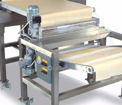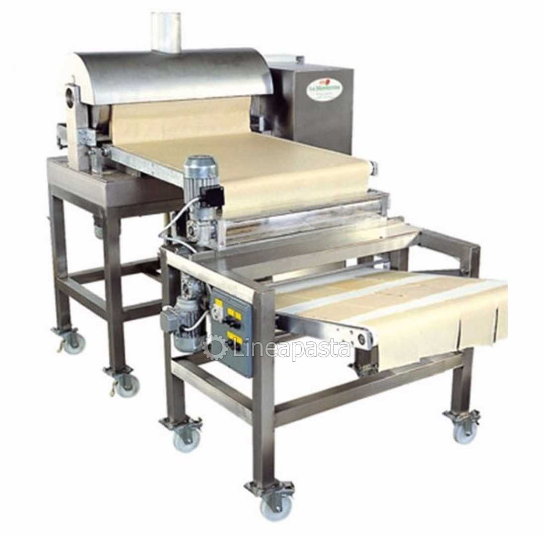 La Monferrina C4 is a machine for production of a strip of crepes having a width of 640 mm, aimed at fresh pasta laboratories lookingfor high outputs. The machine is equipped with a 50 litres capacity batter tank and the product is transported to the machine through a dosing pump. The cooking drum is controlled by a speed inverter to set the production speed. Cooking drum temperature is adjustable, till a maximum of 350°C. The machine is provided with an exhaust hood to eject steam. Machine is manufactured in stainless steel and aluminium EN AW 6082 T6. The control panel is at machine side and it is manufactured in respect of all accident prevention regulations in force. The machine is completed by a cutting unit which permits to cut the 640 mm strip longitudinally and transversally. The longitudinal cut is adjusted manually, the transversal cut is set electronically, so to obtain square or rectangular crepes in different sizes.