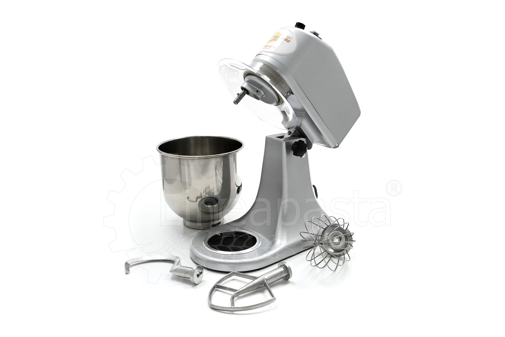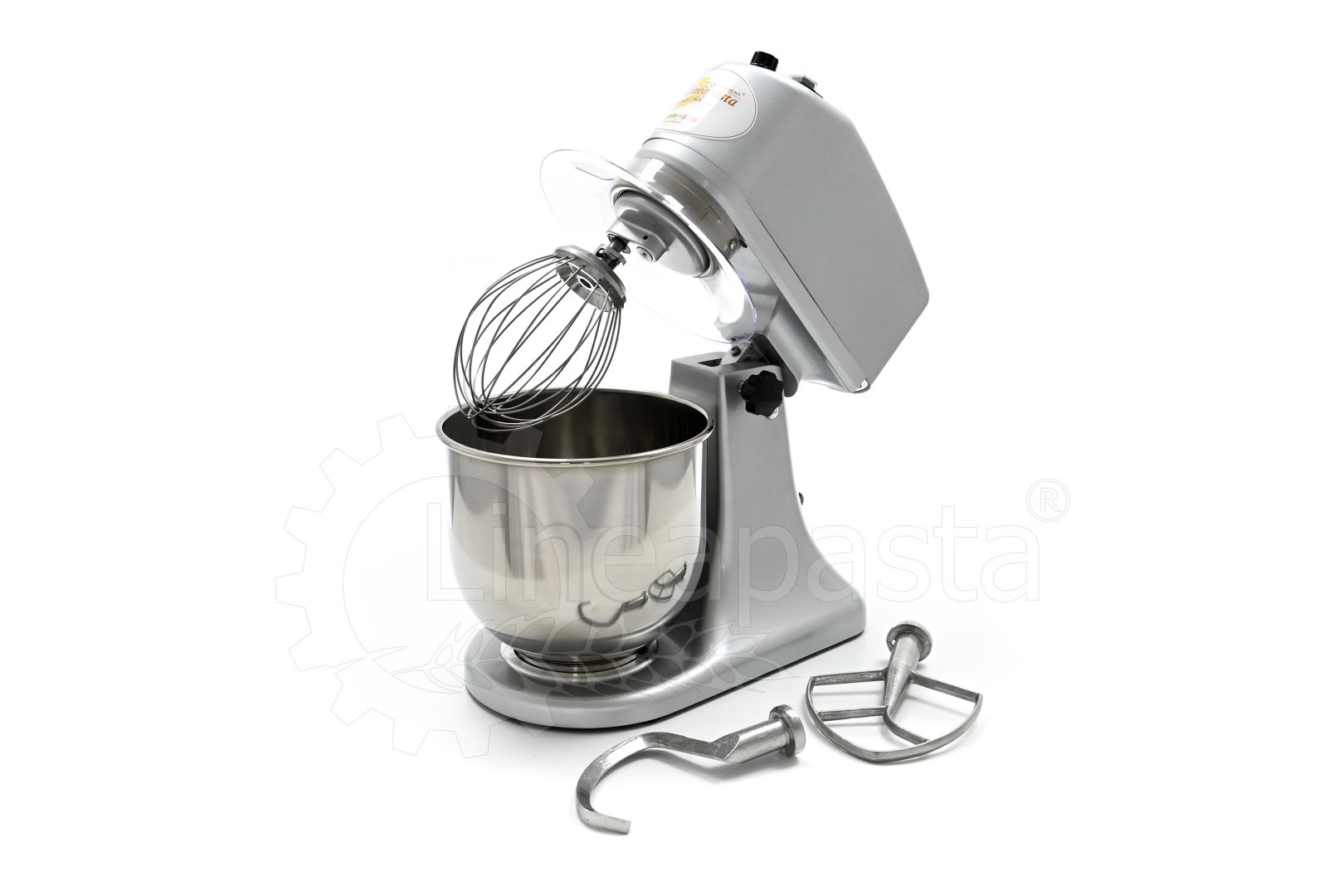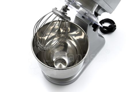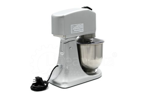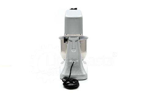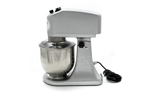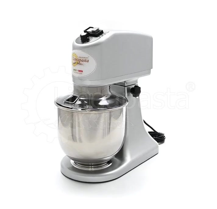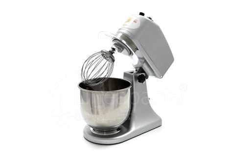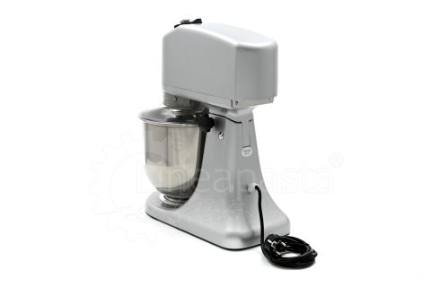 The planetary mixer IP 7 is suitable for the preparation of soft and medium-consistency dough like bread and pasta. Built entirely of metal, the IP 7 model is equipped with a removable stainless steel vat of 7 liters, an NVR device and micro switches for adjusting the speed placed on the head lift. The planetary kneader IP 7 is equipped with a reclining head, useful to facilitate the replacement of tools and the cleaning of the machinery, while the CC motor is equipped with a speed variator and a gear transmission lubricated with grease, that allow the whip to perform up to 75 revolutions per minute. Together with the planetary mixer IP 7 are included three interchangeable accessories suitable for dough processing: a whisk, a spatula and an aluminum hook.