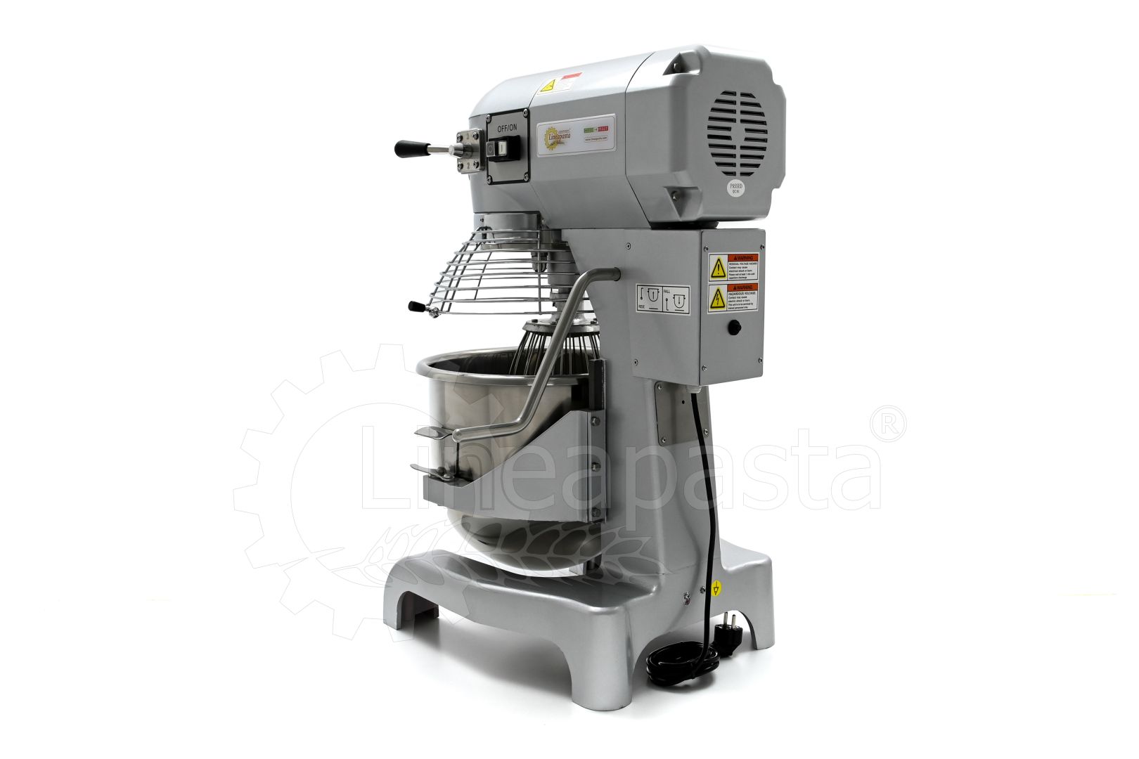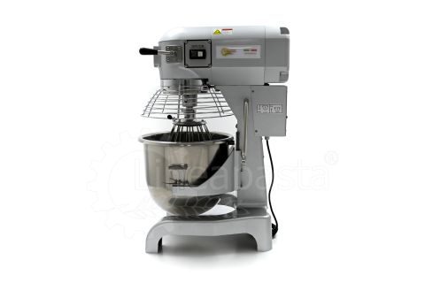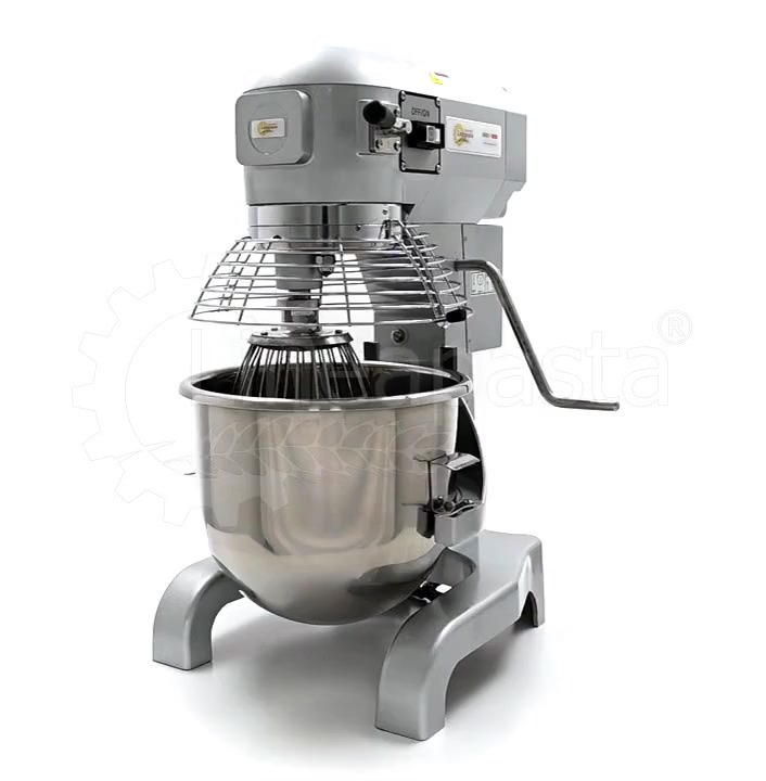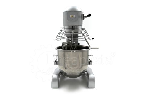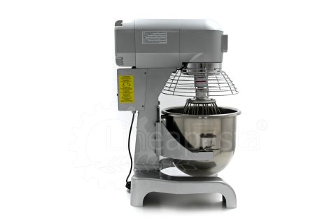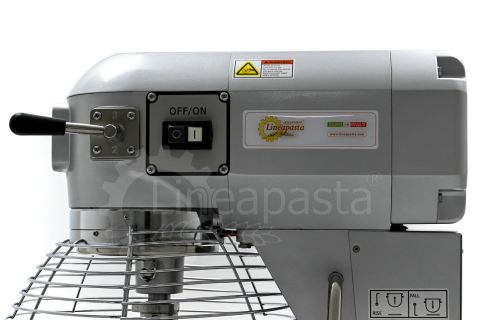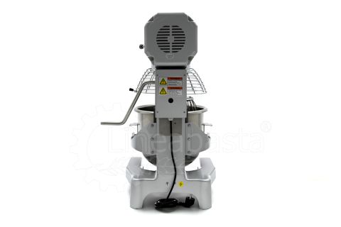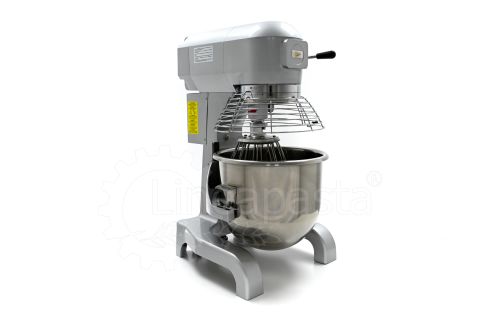 The IP 20 planetary mixer is suitable for the production of yeast-based dough such as bread and pizza. The IP 20 planetary mixer is equipped with a three-speed mechanical gearbox motor, a cooling fan and a reduction system with steel gears. The IP 20 model consists of a vat with a capacity of 20 liters made of stainless steel, which is easily removable and allows a quick cleaning of the machinery. The bowl of the mixer is protected by a wire grid, equipped with a safety device that is activated when the vat is lowered and the grid is opened. Together with the planetary mixer IP 20 are included three interchangeable accessories suitable for dough processing: a hook and an aluminum spatula and an aluminum and steel whisk.
