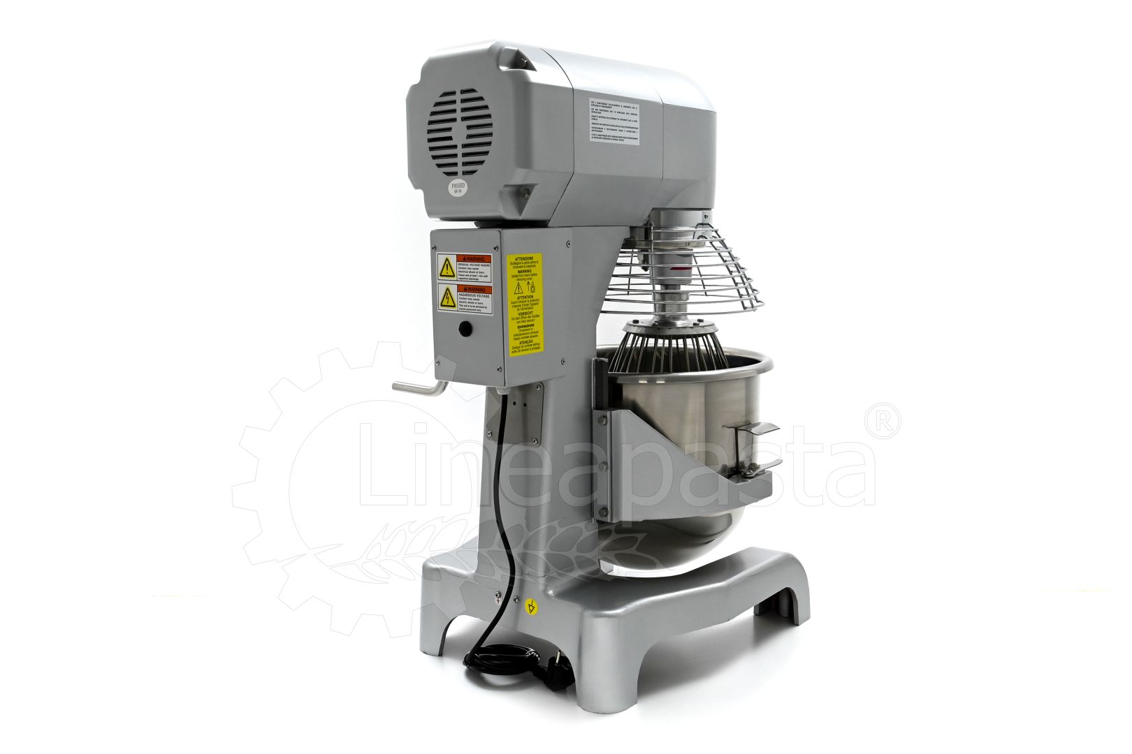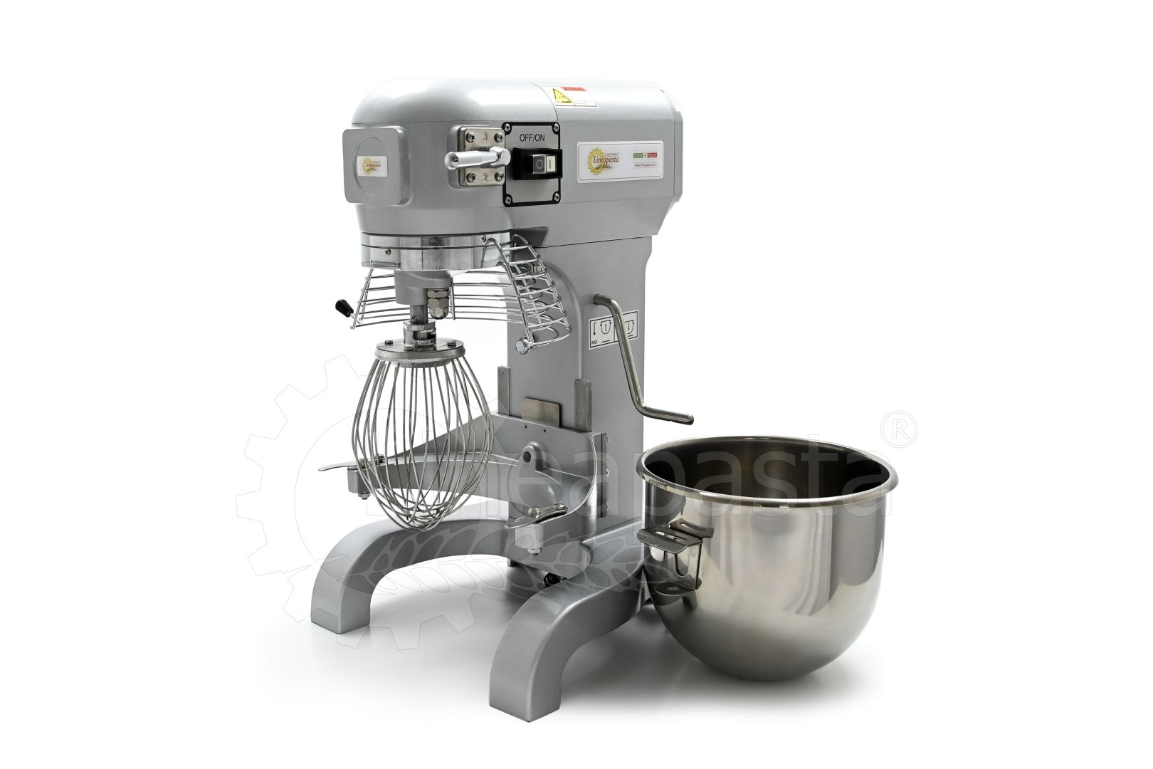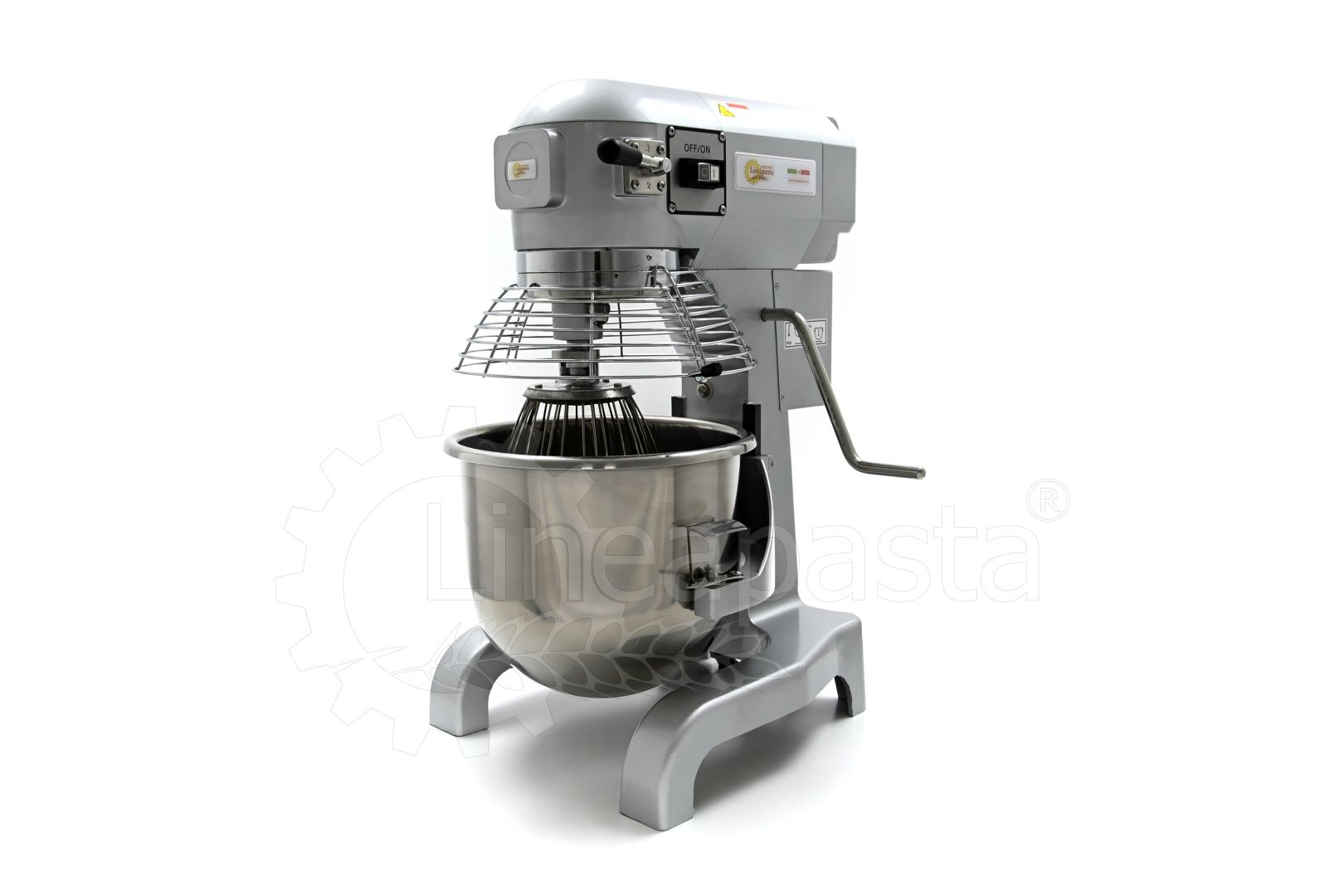 The IP 20 planetary mixer is suitable for the production of yeast-based dough such as bread and pizza. The IP 20 planetary mixer is equipped with a three-speed mechanical gearbox motor, a cooling fan and a reduction system with steel gears. The IP 20 model consists of a vat with a capacity of 20 liters made of stainless steel, which is easily removable and allows a quick cleaning of the machinery. The bowl of the mixer is protected by a wire grid, equipped with a safety device that is activated when the vat is lowered and the grid is opened. Together with the planetary mixer IP 20 are included three interchangeable accessories suitable for dough processing: a hook and an aluminum spatula and an aluminum and steel whisk.