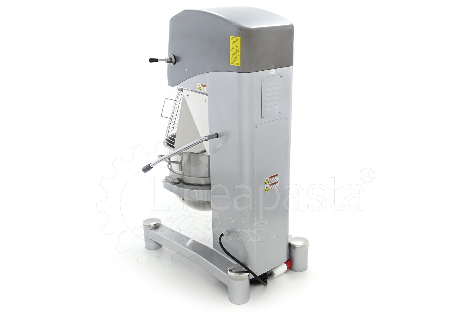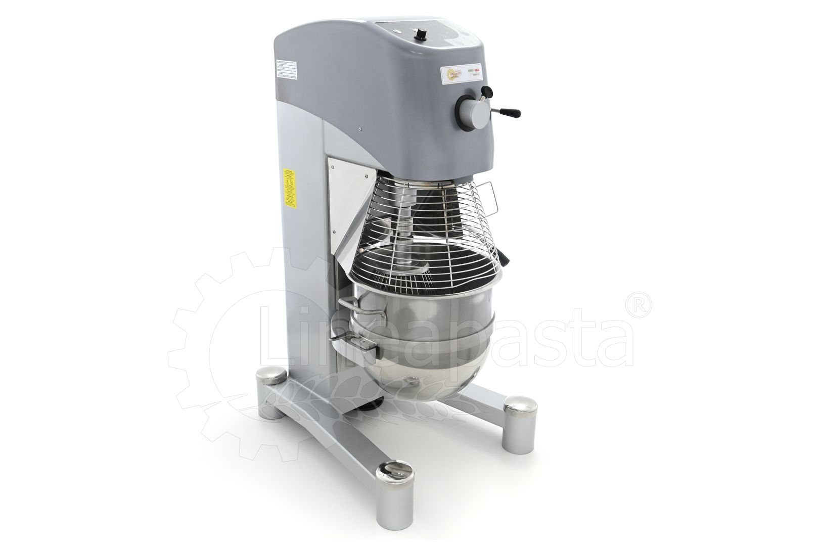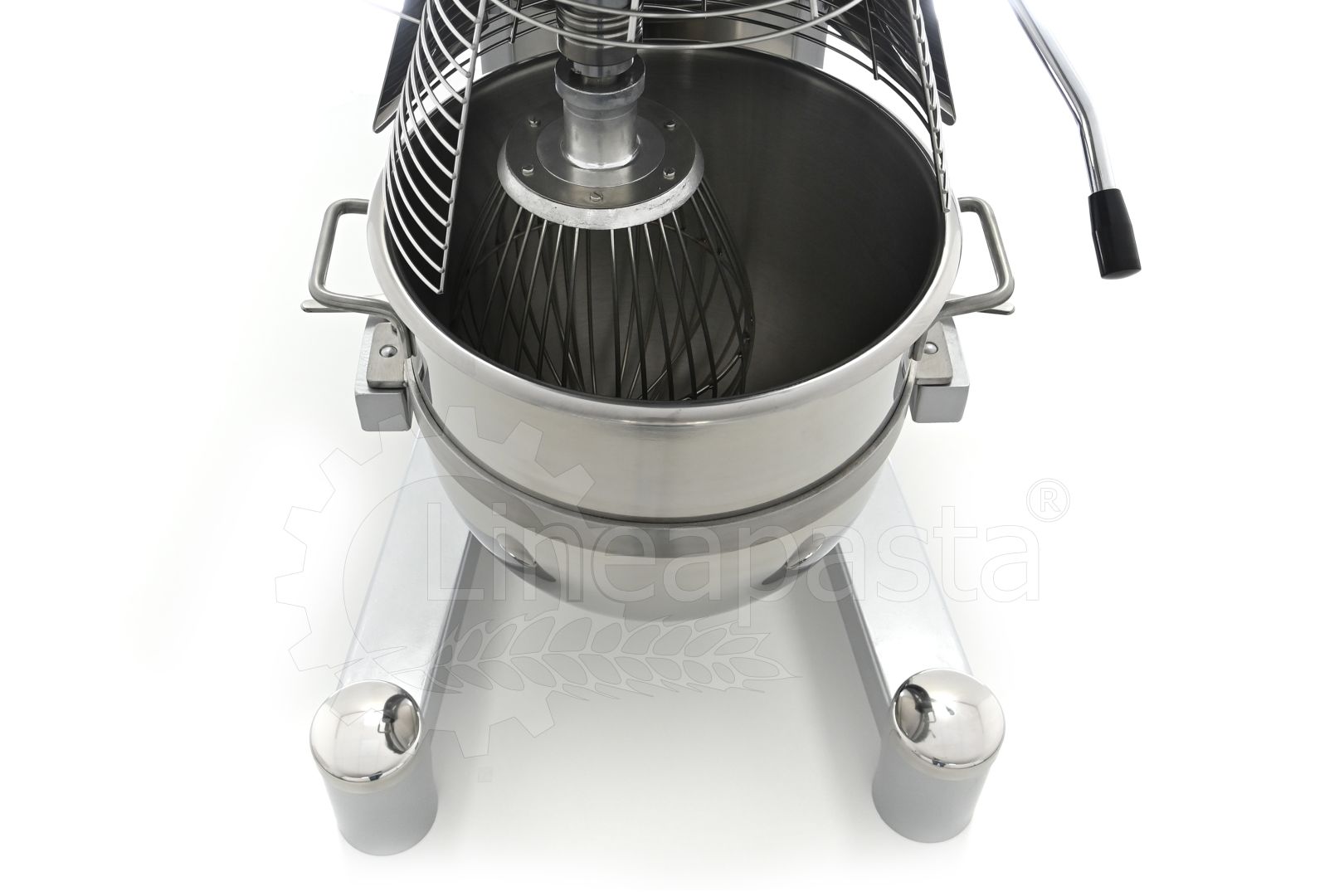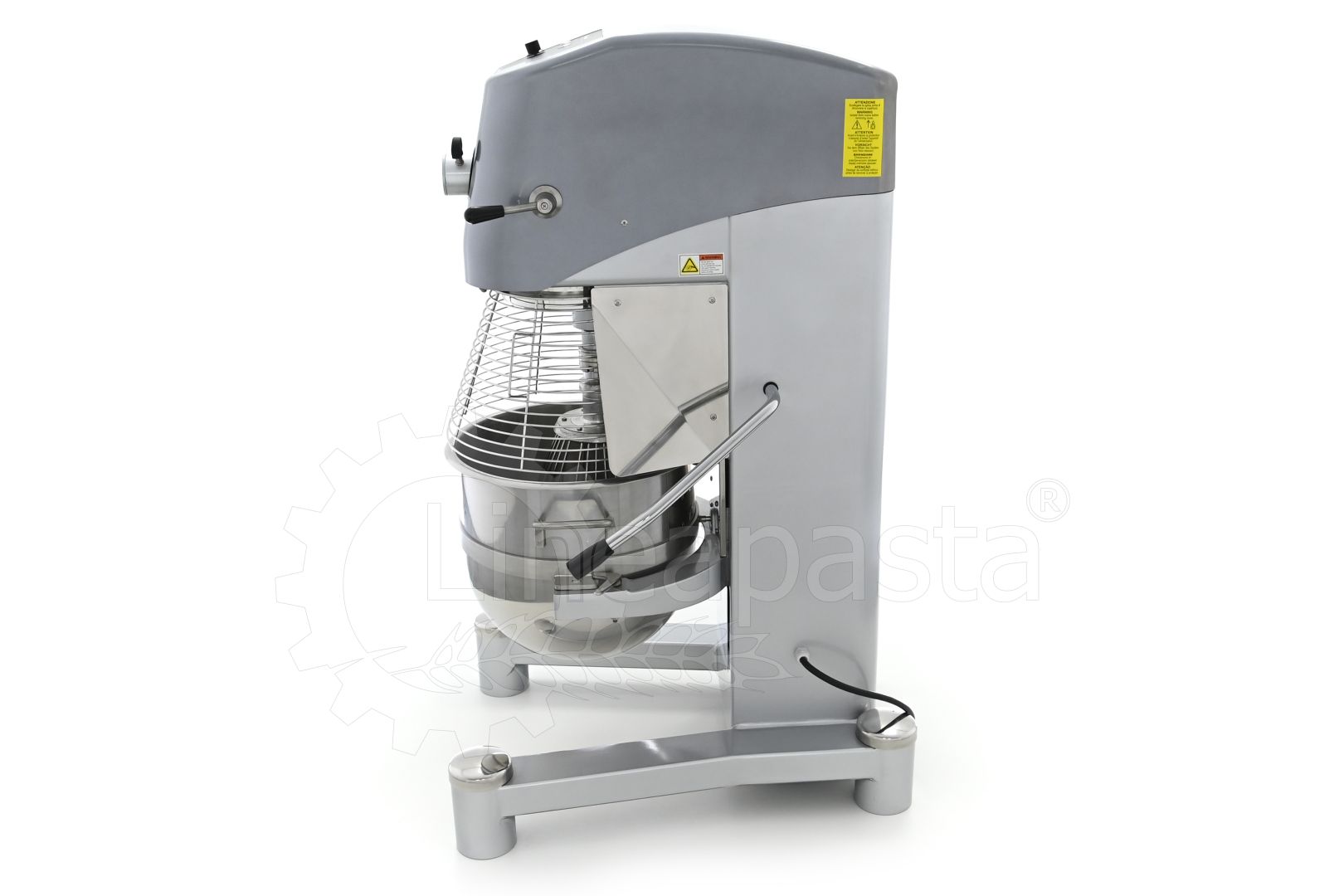 IP 40 planetary mixer ideal for the needs of restaurants, bars, pastry shops, bakeries and professional activities in general. The planetary IP 40 is equipped with a reduction system with steel gears, a ventilated motor with three-speed mechanical transmission, a power take-off and a control panel with timer. The IP 40 model has a 40-liter stainless steel vat easily removable, topped by a wire grid with a security system that comes into operation when the vat is lowered and the protection is opened. Three interchangeable dough processing accessories are included with the IP 40 planetary mixer: an aluminum spatula and hook and an aluminum and steel whisk.