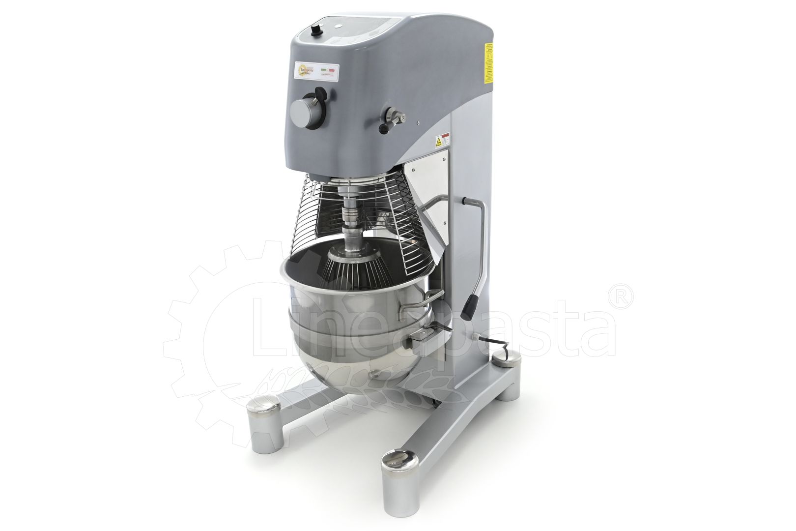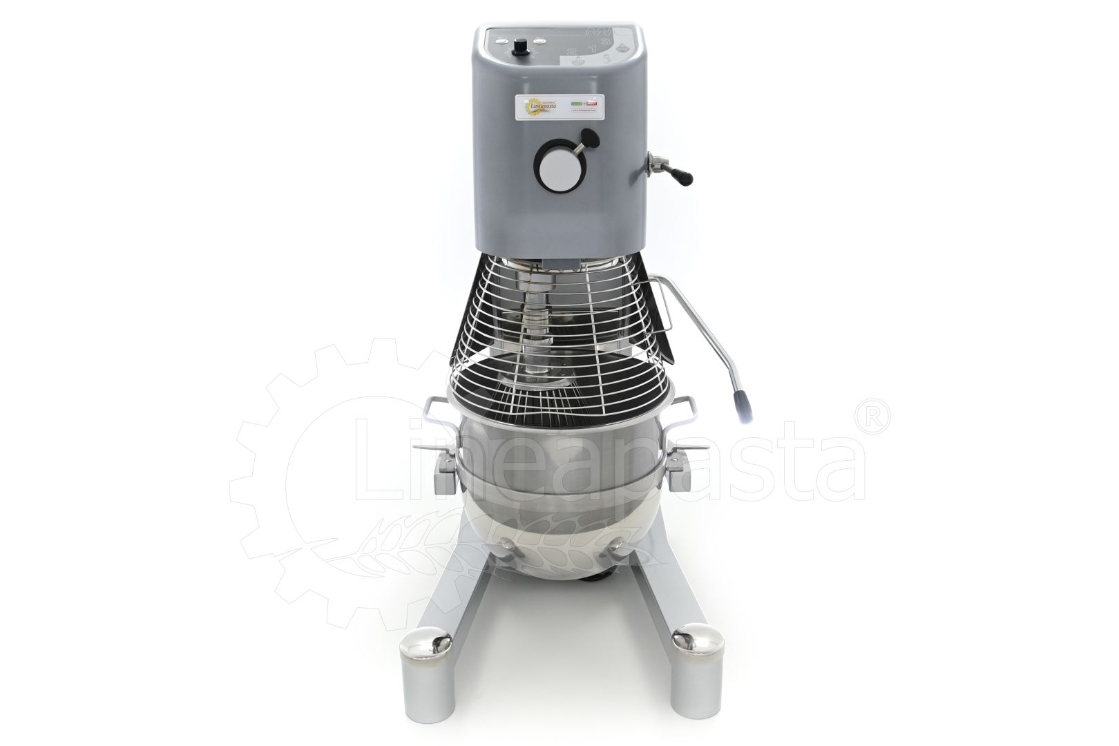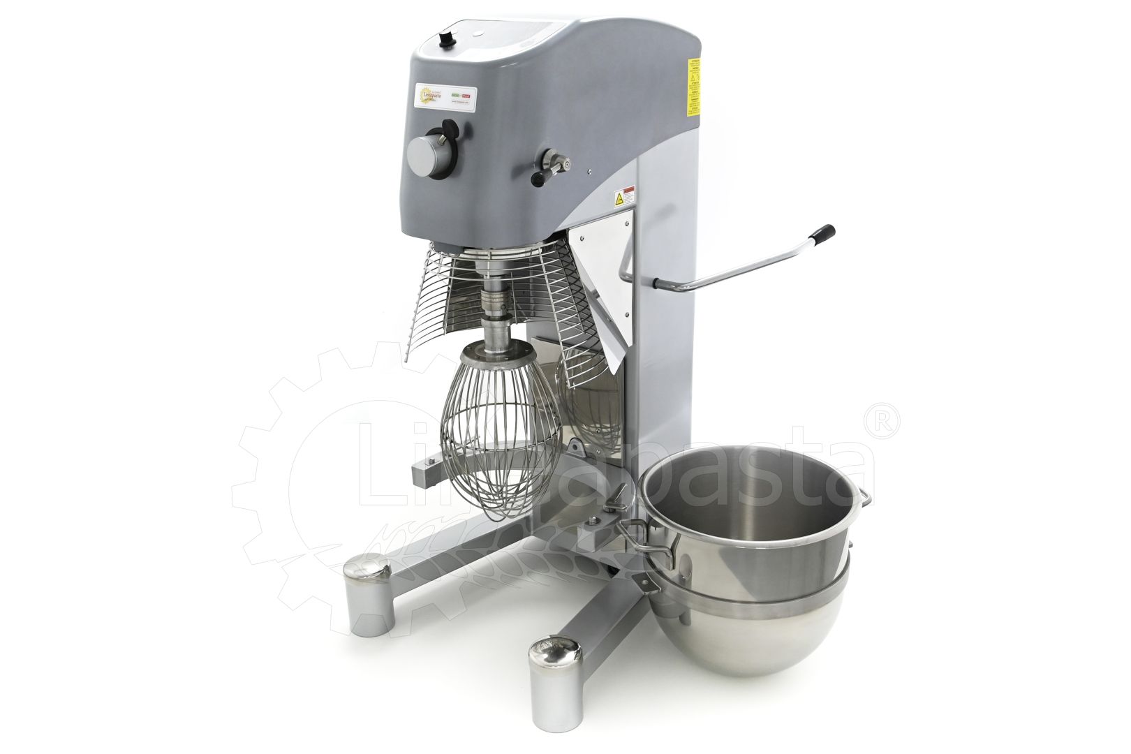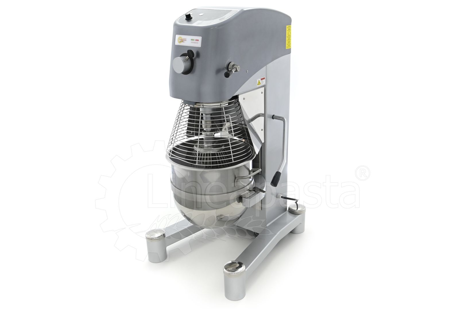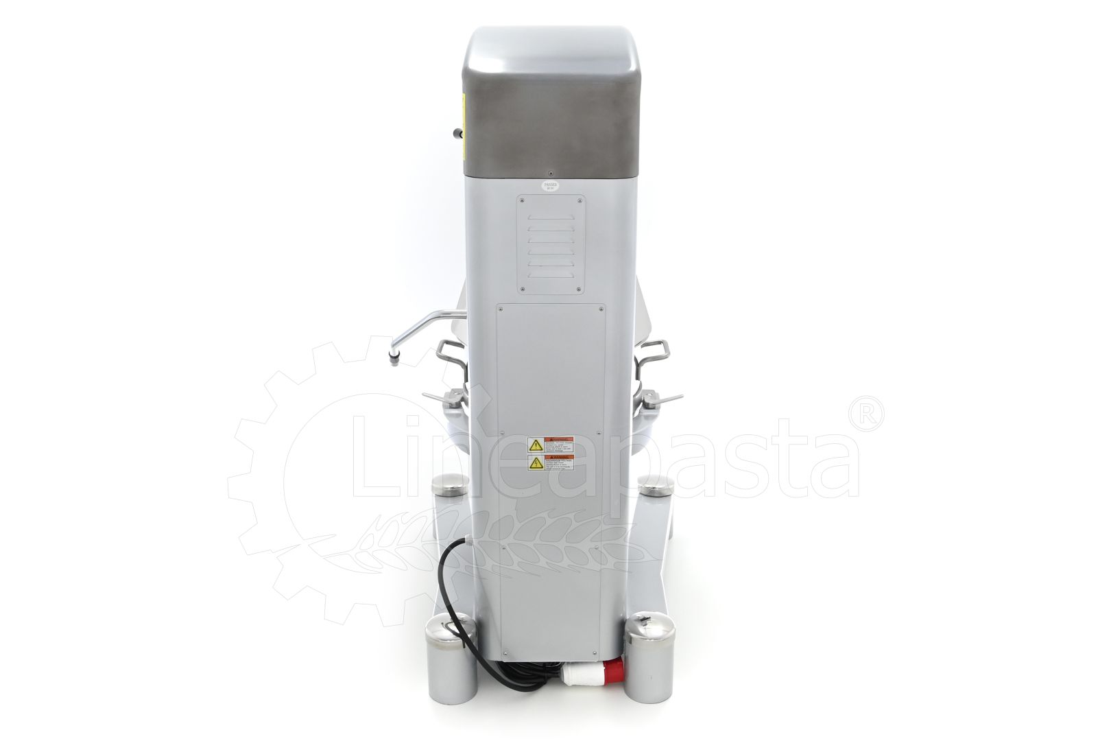 IP 40 planetary mixer ideal for the needs of restaurants, bars, pastry shops, bakeries and professional activities in general. The planetary IP 40 is equipped with a reduction system with steel gears, a ventilated motor with three-speed mechanical transmission, a power take-off and a control panel with timer. The IP 40 model has a 40-liter stainless steel vat easily removable, topped by a wire grid with a security system that comes into operation when the vat is lowered and the protection is opened. Three interchangeable dough processing accessories are included with the IP 40 planetary mixer: an aluminum spatula and hook and an aluminum and steel whisk.