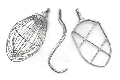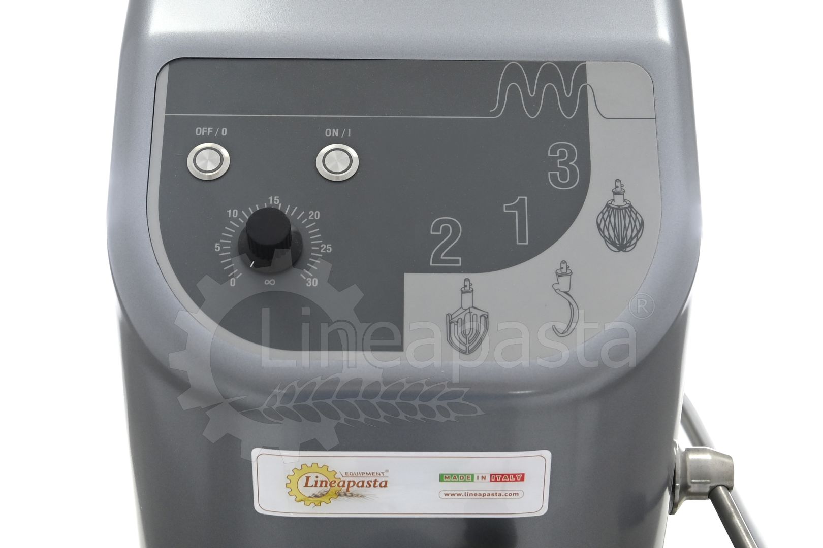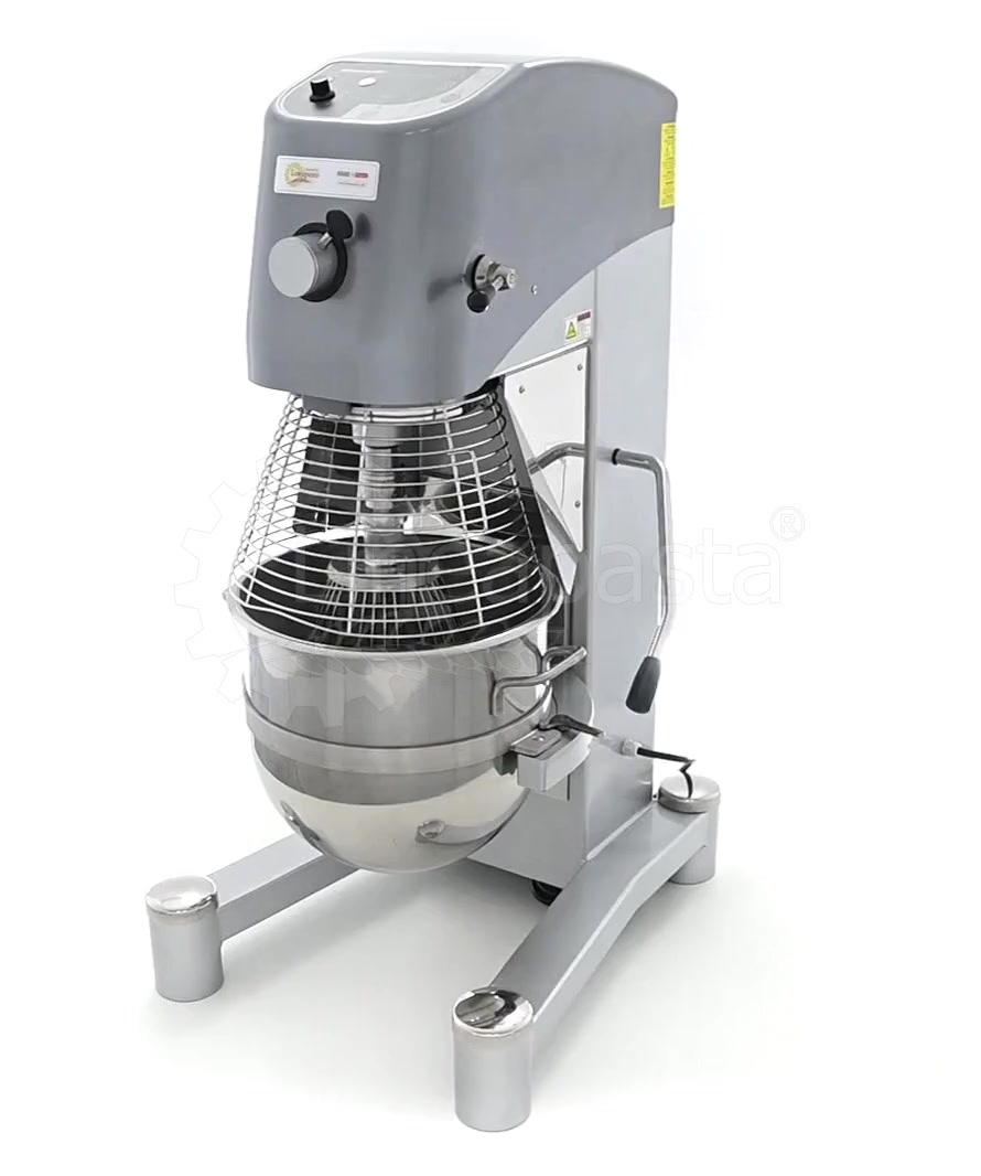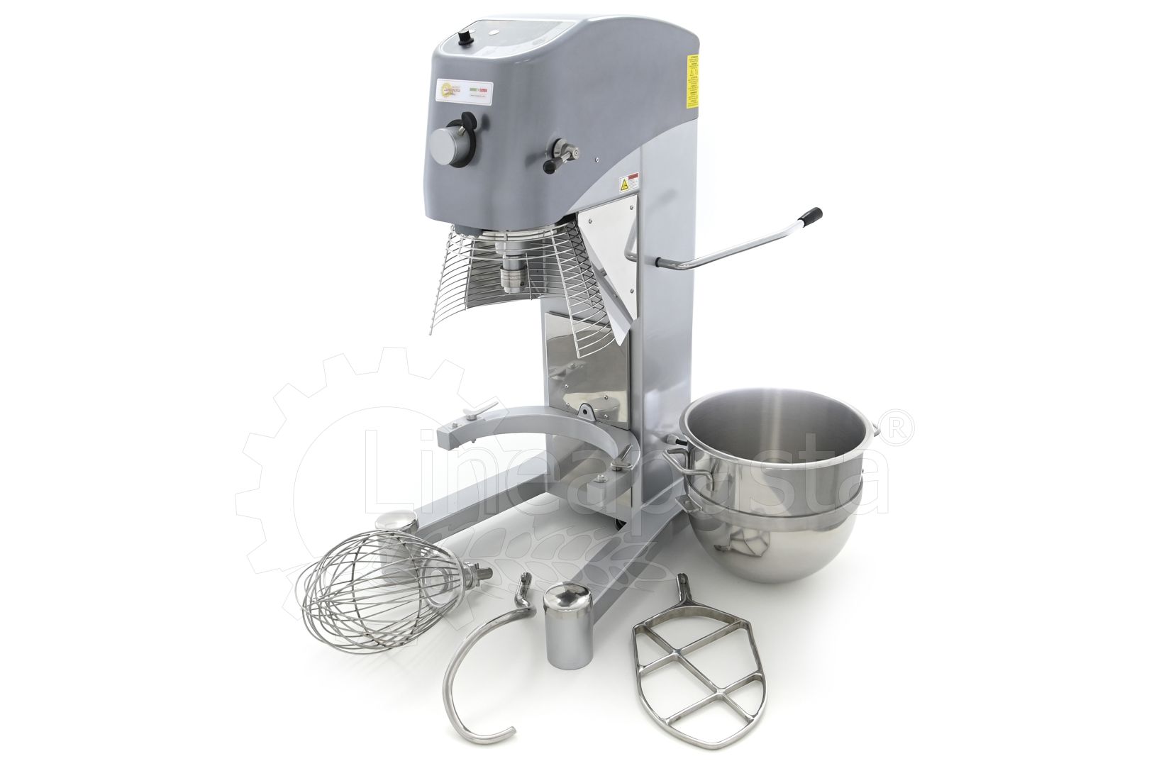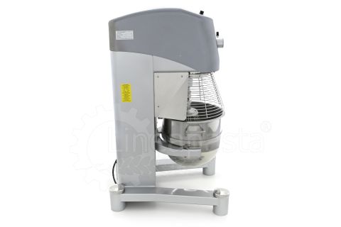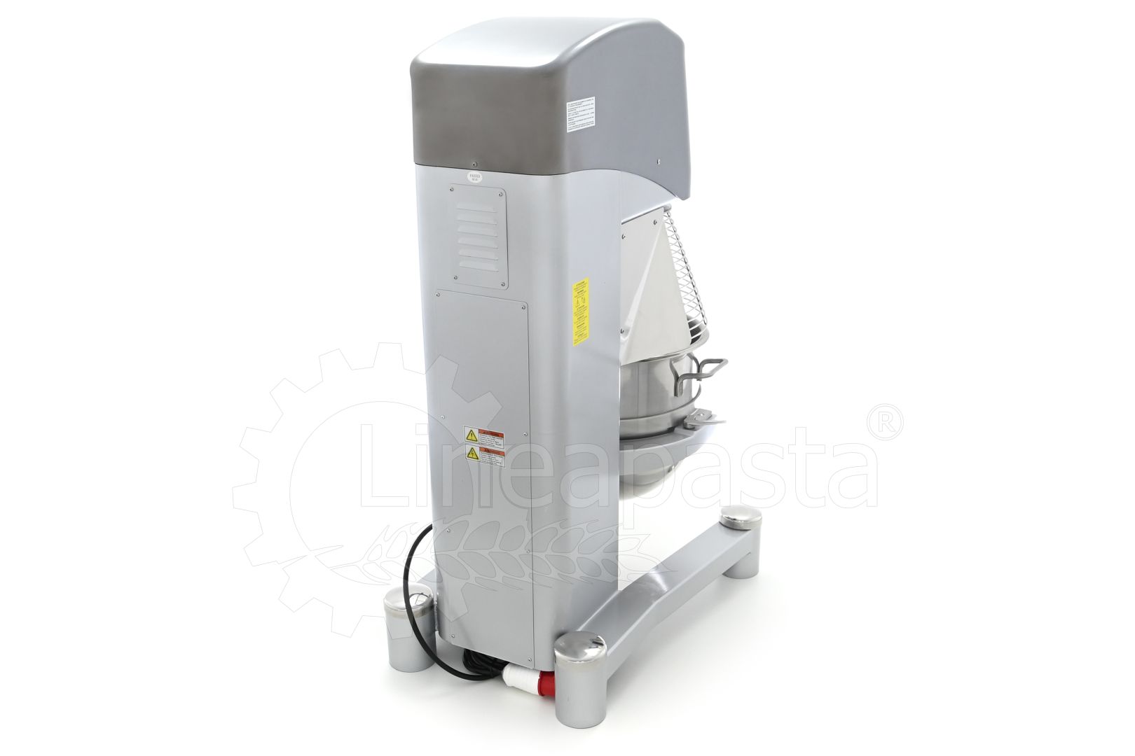 IP 40 planetary mixer ideal for the needs of restaurants, bars, pastry shops, bakeries and professional activities in general. The planetary IP 40 is equipped with a reduction system with steel gears, a ventilated motor with three-speed mechanical transmission, a power take-off and a control panel with timer. The IP 40 model has a 40-liter stainless steel vat easily removable, topped by a wire grid with a security system that comes into operation when the vat is lowered and the protection is opened. Three interchangeable dough processing accessories are included with the IP 40 planetary mixer: an aluminum spatula and hook and an aluminum and steel whisk.