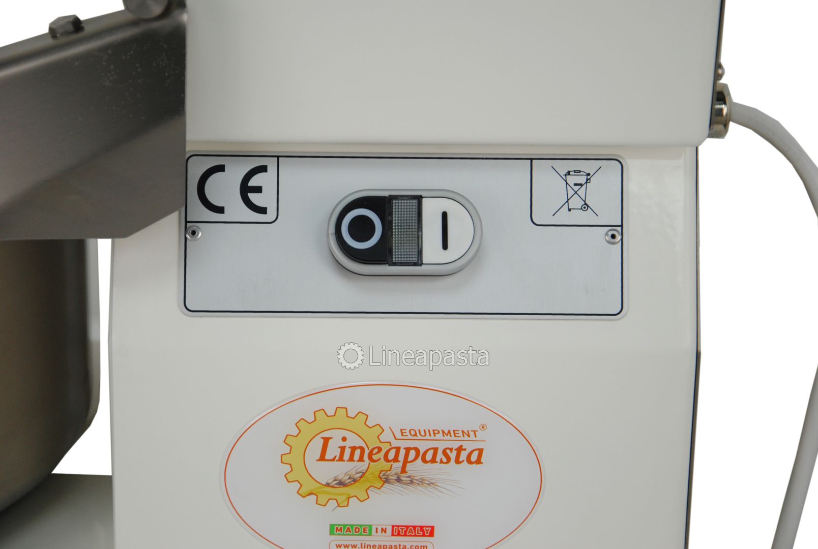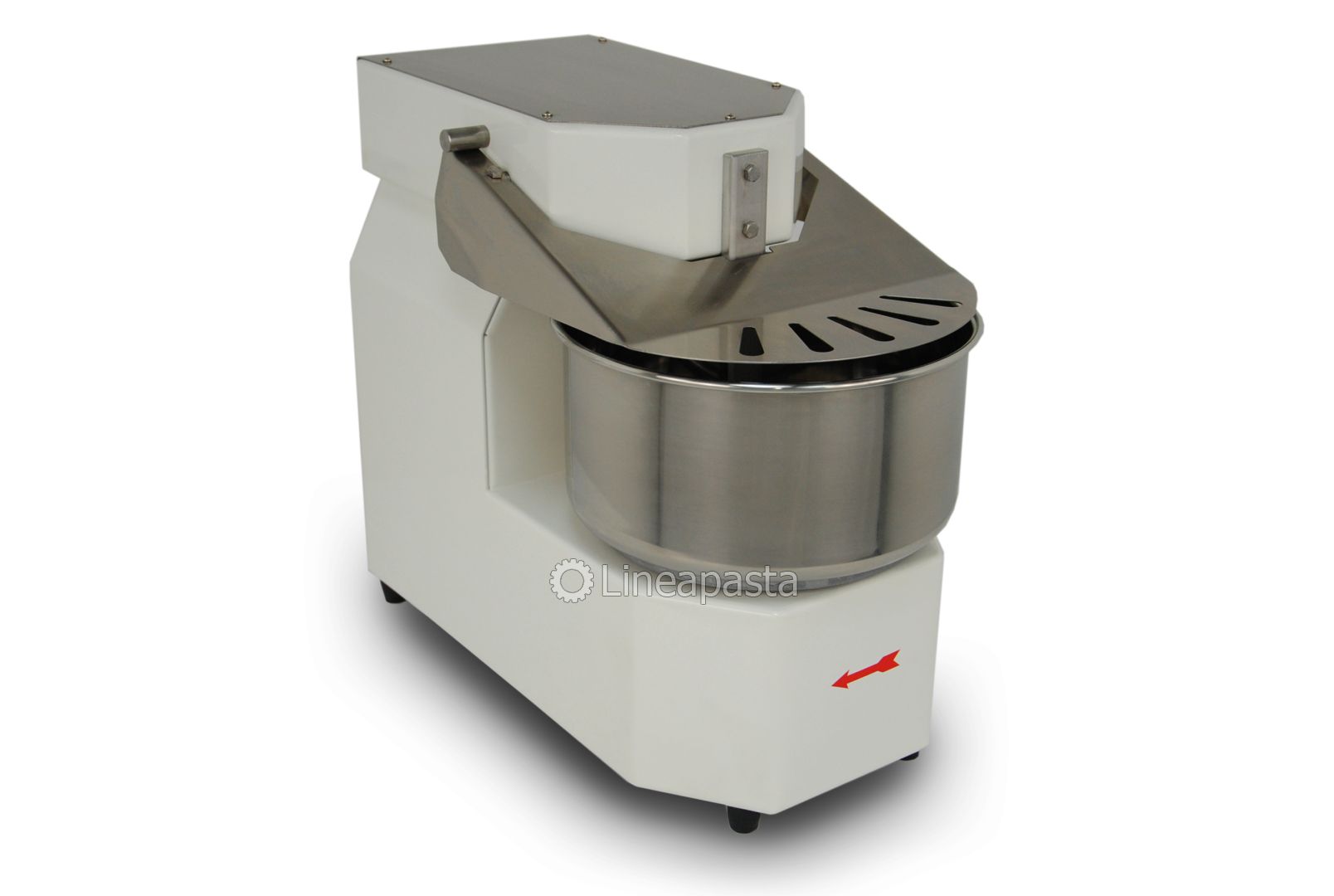 The spiral kneader IS 10 is a kneader equipped with a stainless steel 304 tank with kneading capacity up to 8 kg. This machine is equipped with a spiral, a column "split dough" and a stainless steel tank protection suitable for food contact and designed to withstand strong stresses. The transmission takes place with chains and belt, so as to eliminate both the tedious noise and expensive maintenance and the need to lubricate the mechanical parts with oil. The machine is equipped with a control panel and a start button, as well as a protection with micron locking for user safety. In particular, this version allows the tank to complete 20 laps per minute, while the spiral performs 129 laps. Spiral kneader is a machine suitable for processing ingredients such as flour, sugar, fat, salt, yeast etc. to obtain dough for pasta, bread and pizza (suitable for high hydration dough, from 55-65% water).