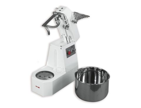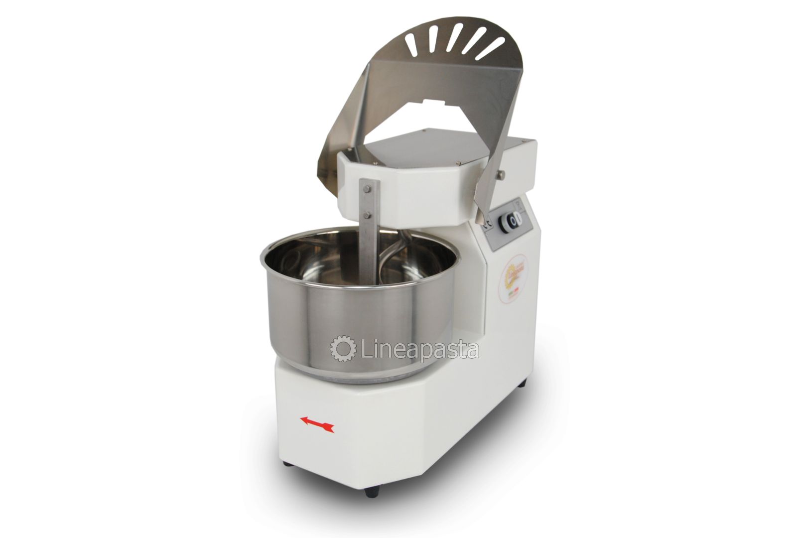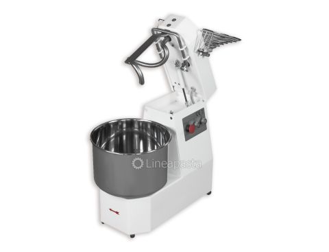 The spiral kneader IS 15 is a kneader equipped with a stainless steel 304 tank with kneading capacity up to 12 kg. This machine is equipped with a spiral, a column "split dough" and a stainless steel tank protection suitable for food contact and designed to withstand strong stresses. The transmission takes place with chains and belt, so as to eliminate both the tedious noise and expensive maintenance and the need to lubricate the mechanical parts with oil. The machine is equipped with a control panel and a start button, as well as a protection with micron locking for the user's safety. In particular, this version allows the tank to complete 20 laps per minute, while the spiral performs 129 laps. Spiral kneader is a machine suitable for processing ingredients such as flour, sugar, fat, salt, yeast etc. to obtain dough for pasta, bread and pizza (suitable for high hydration dough, from 55-65% water).