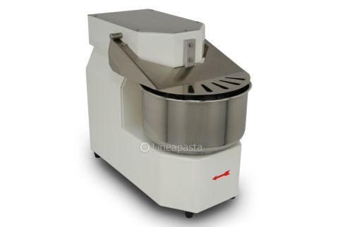 The spiral kneader IS 20 is a kneader equipped with a stainless steel 304 tank with kneading capacity up to 17 kg. This machine is equipped with a spiral, a column "split dough" and a stainless steel tank protection suitable for food contact and designed to withstand strong stresses. The transmission takes place with chains and belt, so as to eliminate both the tedious noise and expensive maintenance and the need to lubricate the mechanical parts with oil. The machine is equipped with a control panel and a start button, as well as a protection with micron blocking for user safety. In particular, this version allows the tank to complete 19 turns per minute, while the spiral performs 160 laps. The spiral kneader is a machine suitable for processing ingredients such as flour, sugar, fat, salt, yeast etc. to obtain dough for pasta, bread and pizza (suitable for high hydration dough, from 55-65% water).