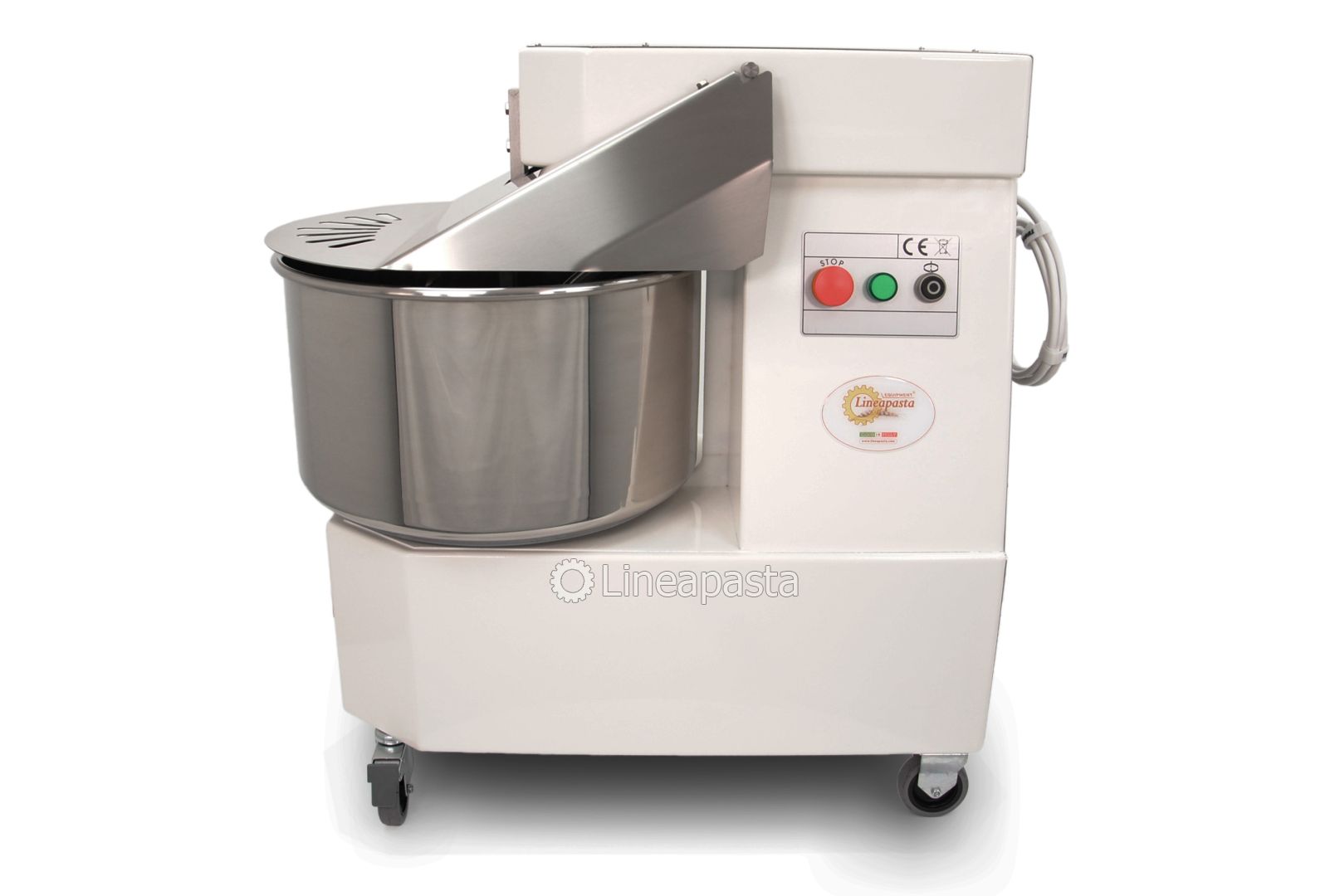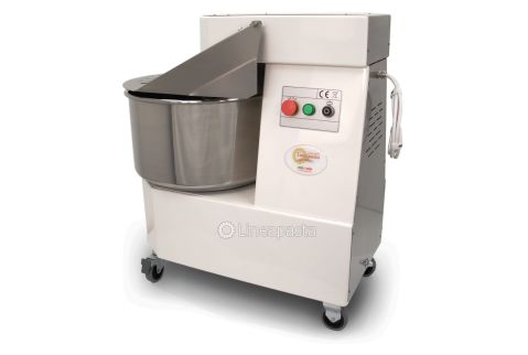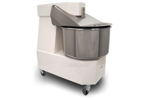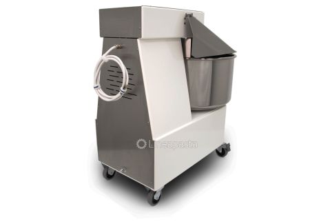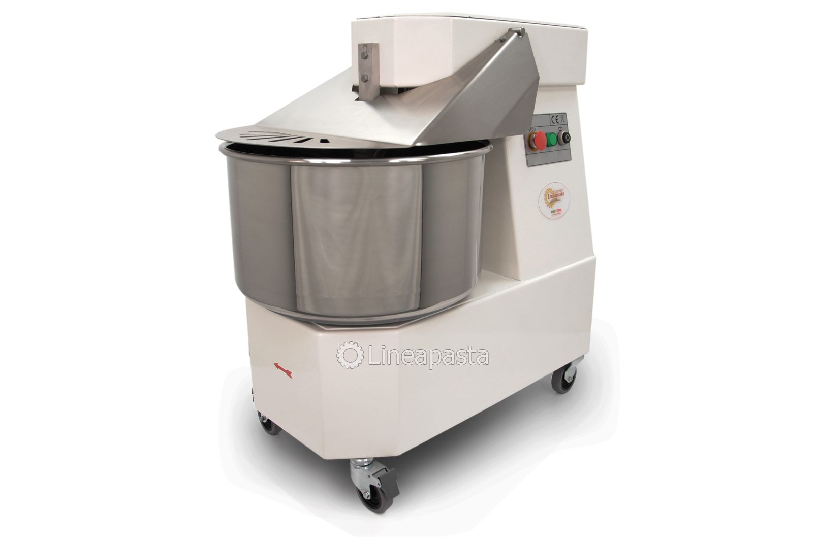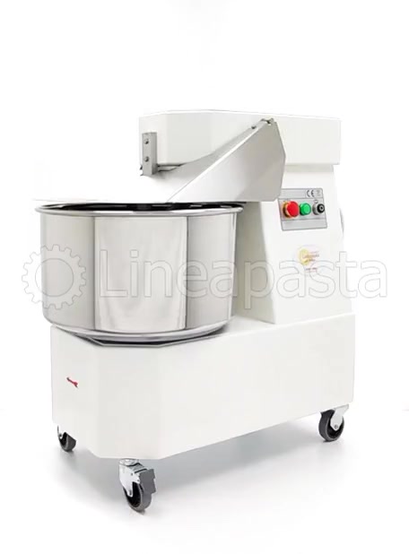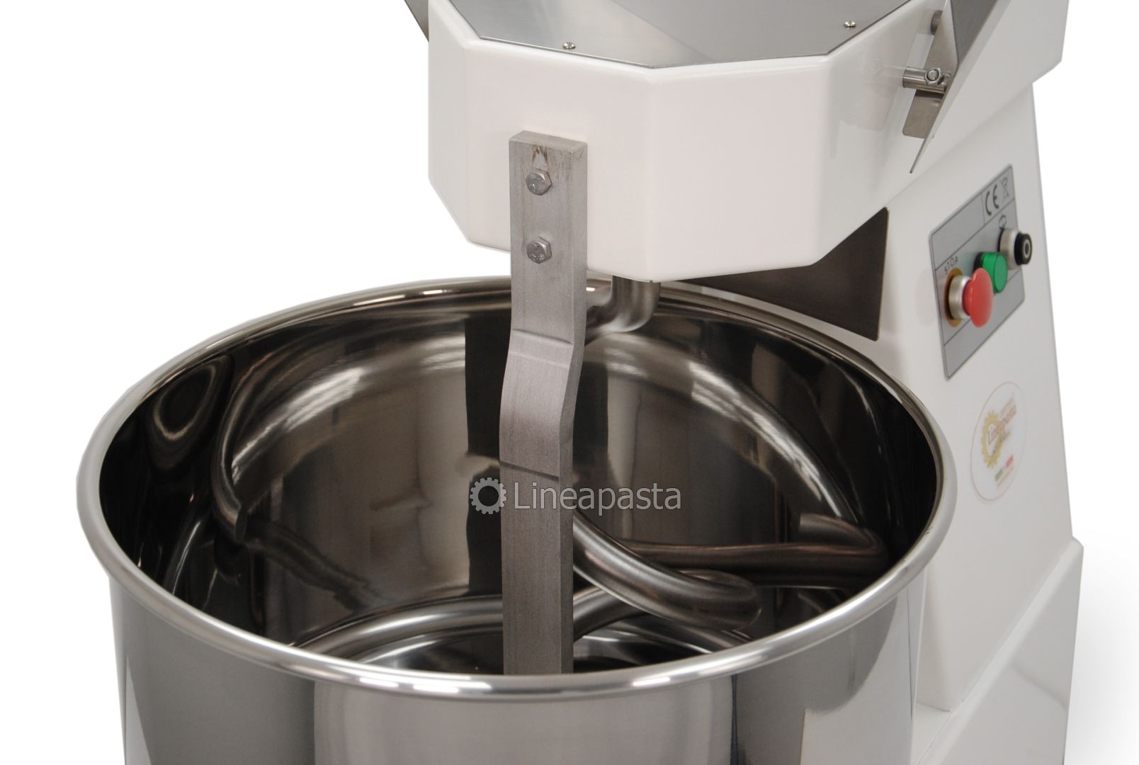 The spiral kneader IS 30 is a kneader equipped with a stainless steel 304 tank with kneading capacity up to 25 kg. This machine is equipped with a spiral, a column "split dough" and a stainless steel tank protection suitable for food contact and designed to withstand strong stresses. The transmission takes place with chains and belt, so as to eliminate both the tedious noise and expensive maintenance and the need to lubricate the mechanical parts with oil. The machine is equipped with a control panel and a start button, as well as a protection with micron blocking for user safety. In particular, this version allows the tank to complete 19 laps per minute, while the spiral performs 160 laps. Spiral kneader is a machine suitable for processing ingredients such as flour, sugar, fat, salt, yeast etc. to obtain dough for pasta, bread and pizza (suitable for high hydration dough, from 55-65% water).