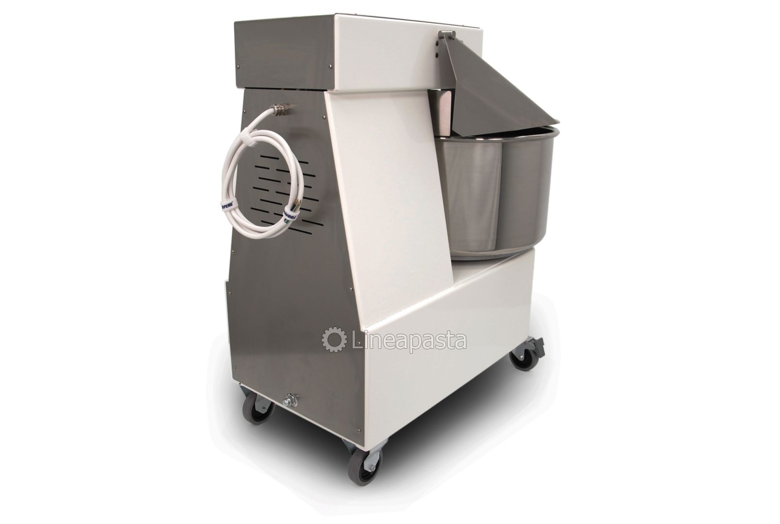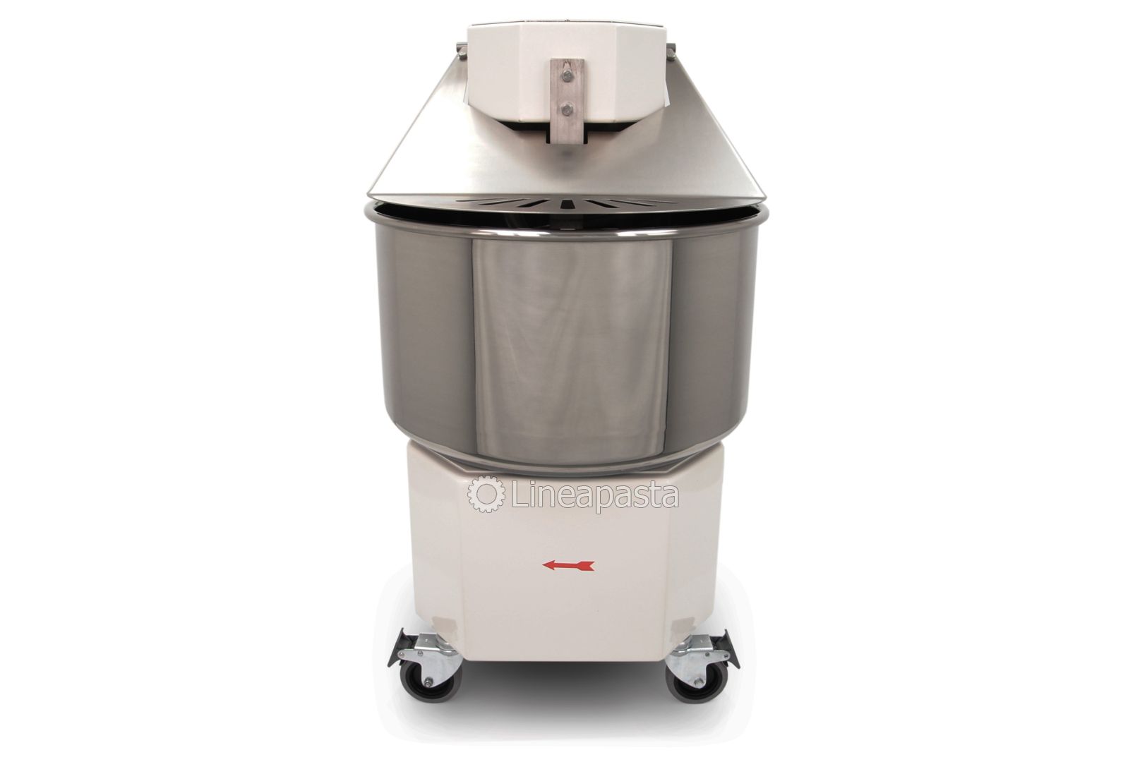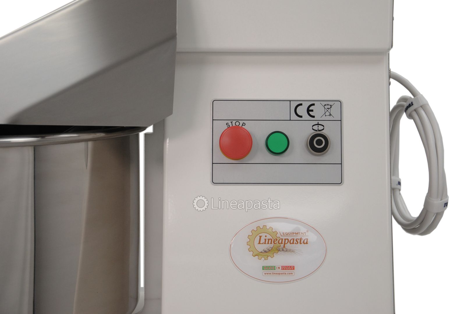 The spiral kneader IS 30 is a kneader equipped with a stainless steel 304 tank with kneading capacity up to 25 kg. This machine is equipped with a spiral, a column "split dough" and a stainless steel tank protection suitable for food contact and designed to withstand strong stresses. The transmission takes place with chains and belt, so as to eliminate both the tedious noise and expensive maintenance and the need to lubricate the mechanical parts with oil. The machine is equipped with a control panel and a start button, as well as a protection with micron blocking for user safety. In particular, this version allows the tank to complete 19 laps per minute, while the spiral performs 160 laps. Spiral kneader is a machine suitable for processing ingredients such as flour, sugar, fat, salt, yeast etc. to obtain dough for pasta, bread and pizza (suitable for high hydration dough, from 55-65% water).