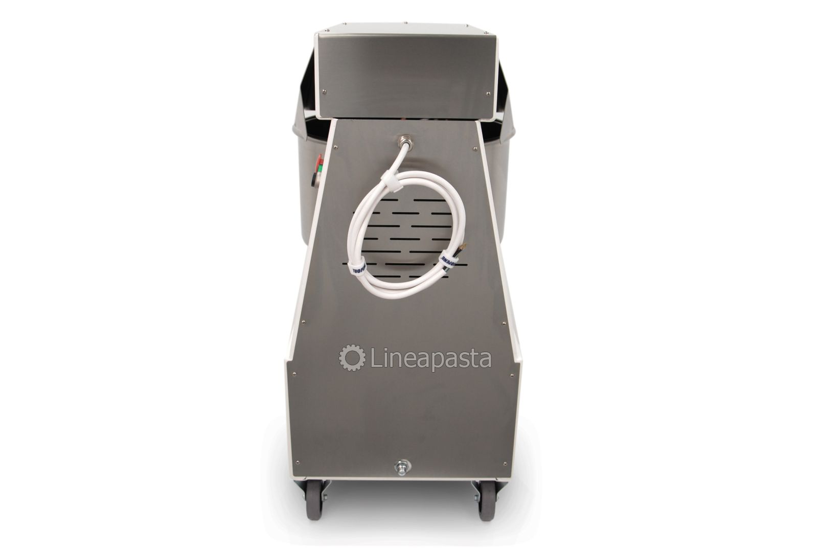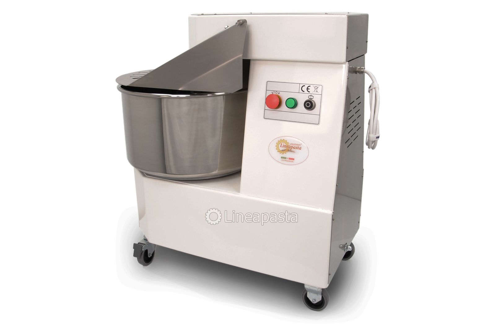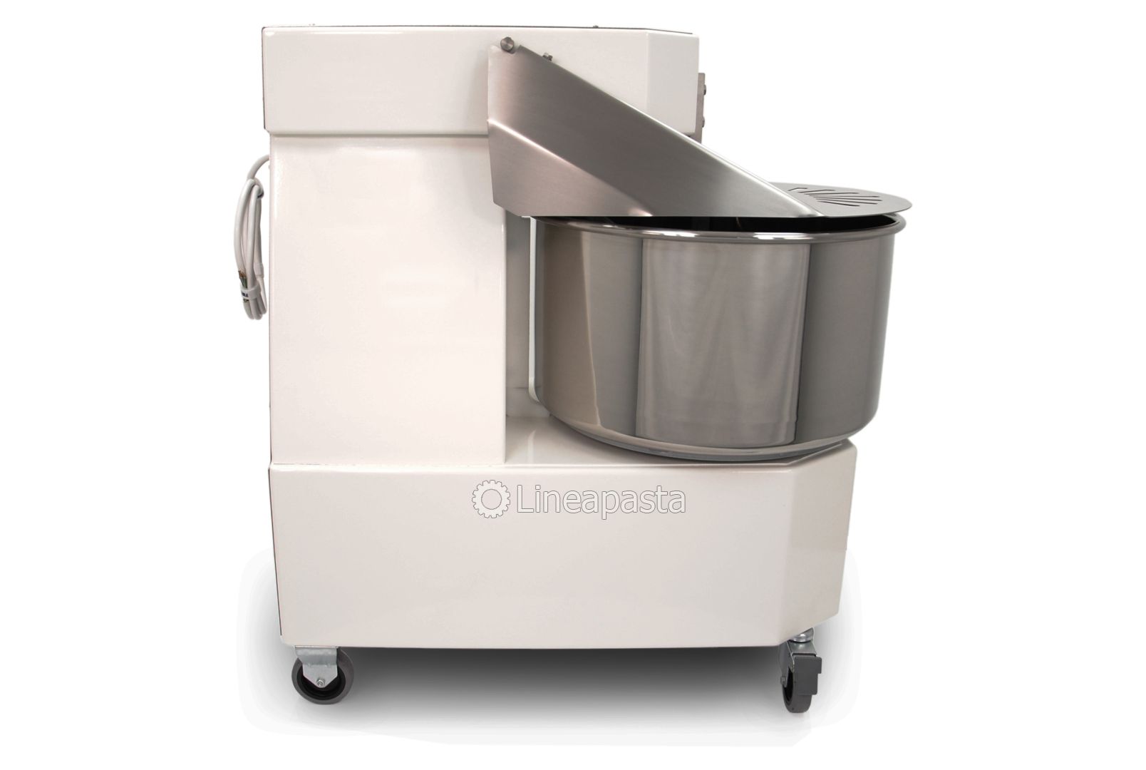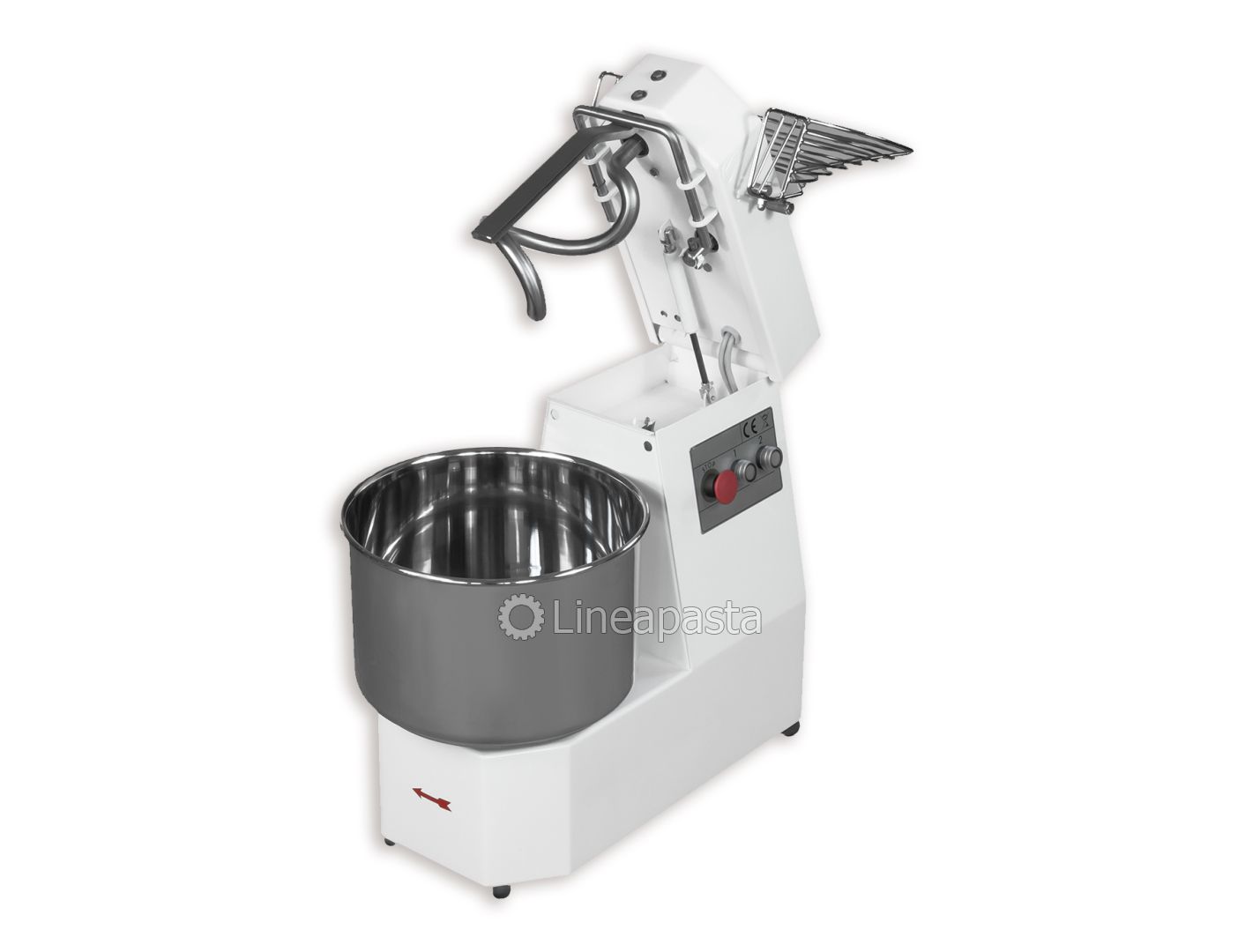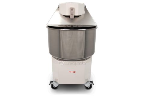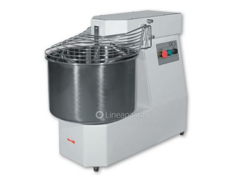 The spiral kneader IS 40 is a kneader equipped with a stainless steel 304 tank with kneading capacity up to 35 kg. This machine is equipped with a spiral, a column "split dough" and a stainless steel tank protection suitable for food contact and designed to withstand strong stresses. The transmission takes place with chains and belt, so as to eliminate both the tedious noise and expensive maintenance and the need to lubricate the mechanical parts with oil. The machine is equipped with a control panel and a start button, as well as a protection with micron locking for user safety. In particular, this version allows the tank to complete 16 laps per minute, while the spiral performs 137. Spiral kneader is a machine suitable for processing ingredients such as flour, sugar, fat, salt, yeast etc. to obtain dough for pasta, bread and pizza (suitable for high hydration dough, from 55-65% water).