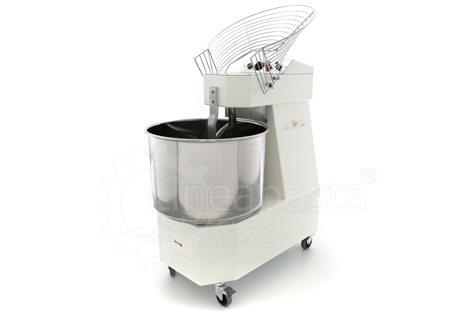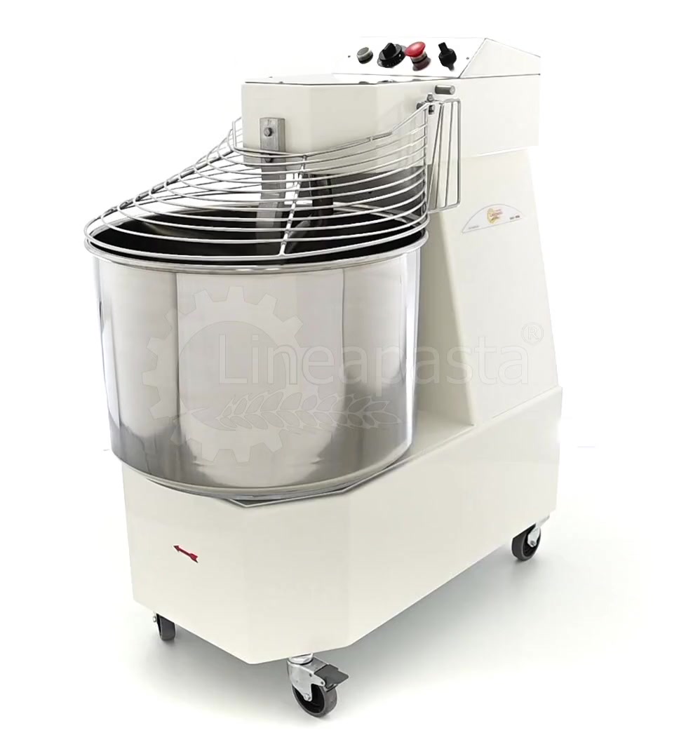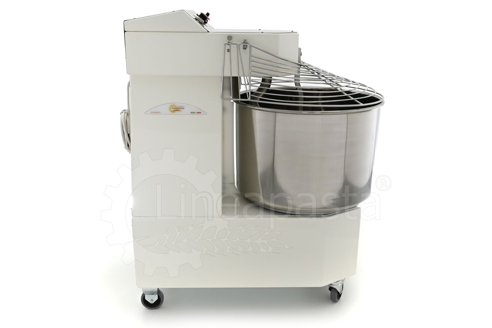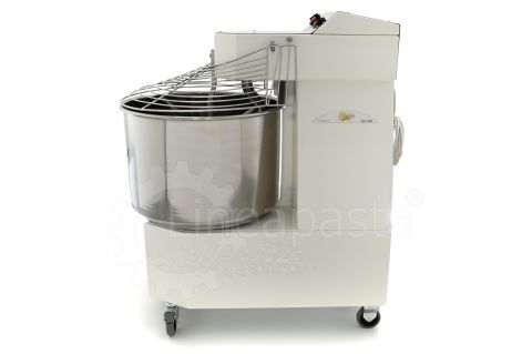 The spiral kneader IS 50 is a kneader equipped with a stainless steel 304 tank with kneading capacity up to 45 kg. This machine is equipped with a spiral, a column "split dough" and a stainless steel tank protection suitable for food contact and designed to withstand strong stresses. The transmission takes place with chains and belt, so as to eliminate both the tedious noise and expensive maintenance and the need to lubricate the mechanical parts with oil. The machine is equipped with a control panel and a start button, as well as a protection with micron locking for user safety. In particular, this version allows the tank to complete 16 laps per minute, while the spiral performs 137. Spiral kneader is a machine suitable for processing ingredients such as flour, sugar, fat, salt, yeast etc. to obtain dough for pasta, bread and pizza (suitable for high hydration dough, from 55-65% water).