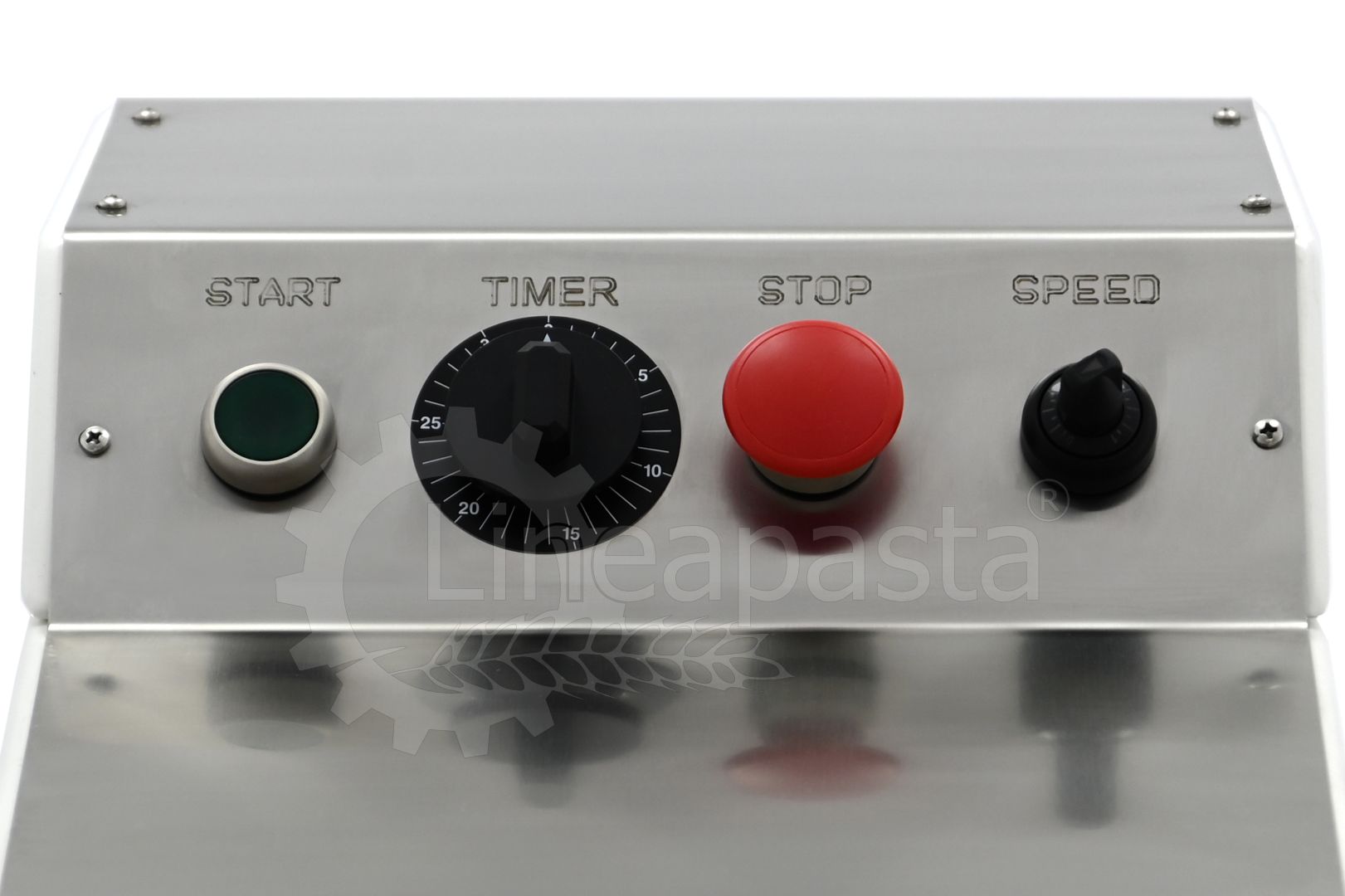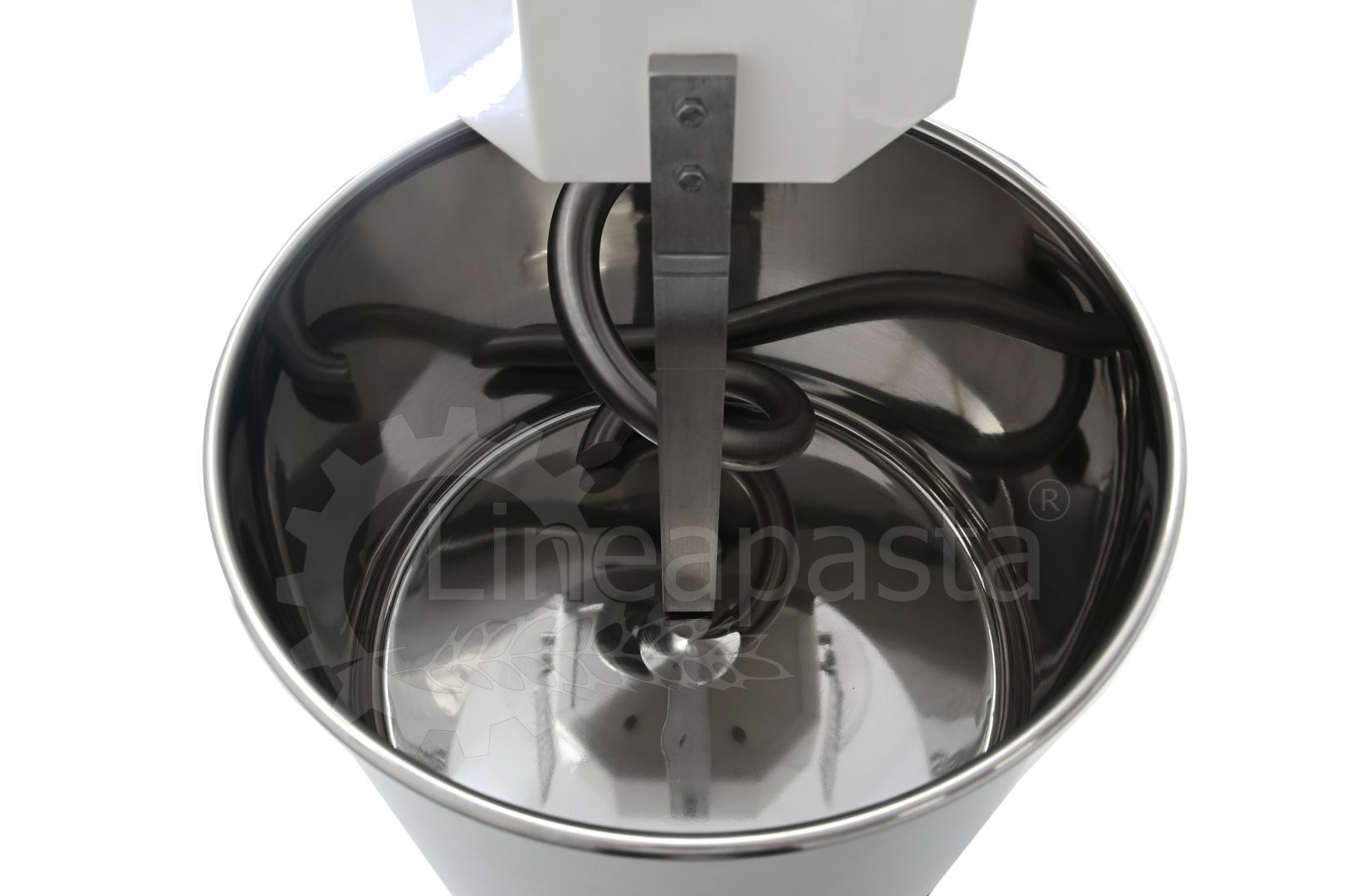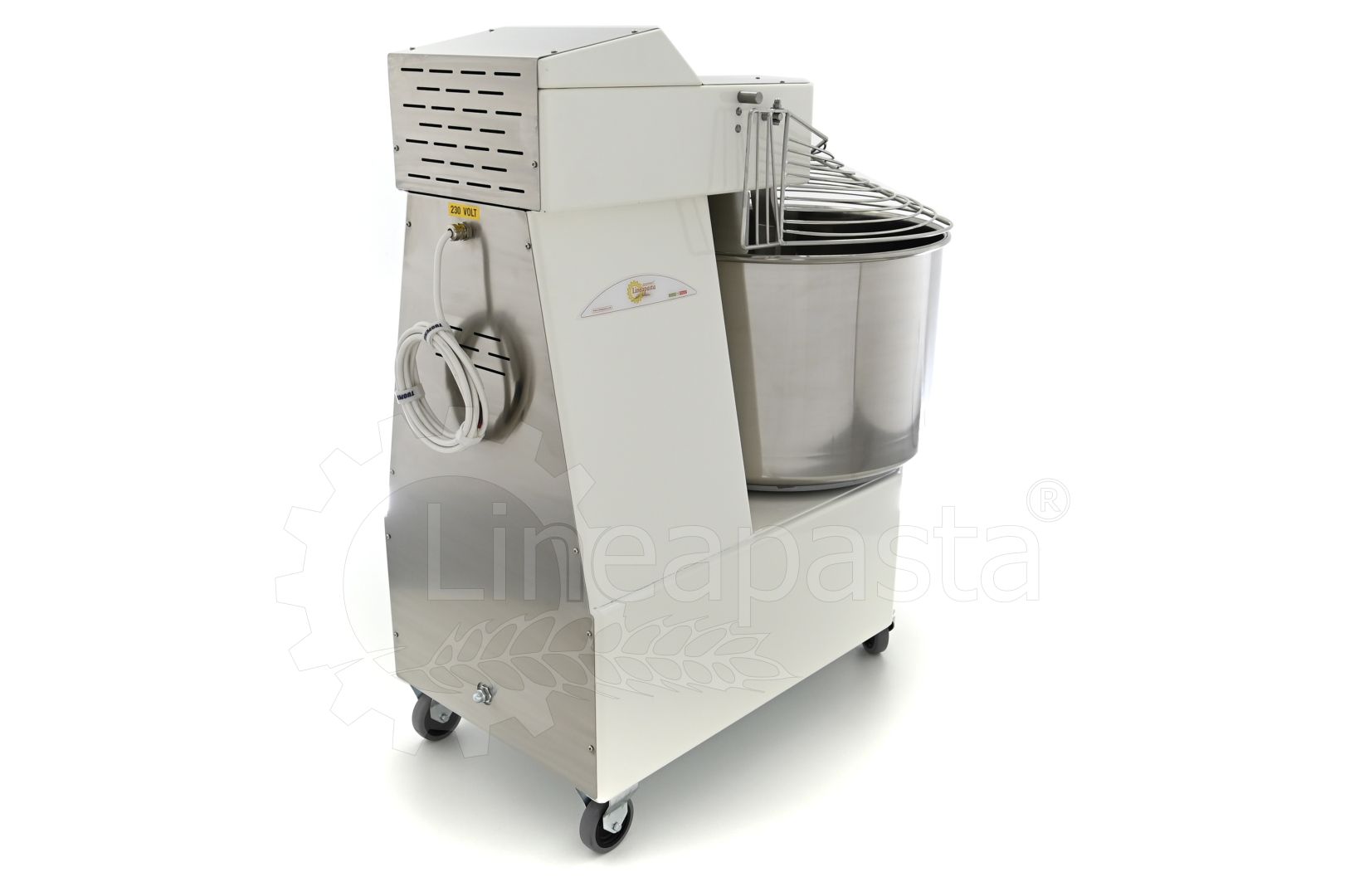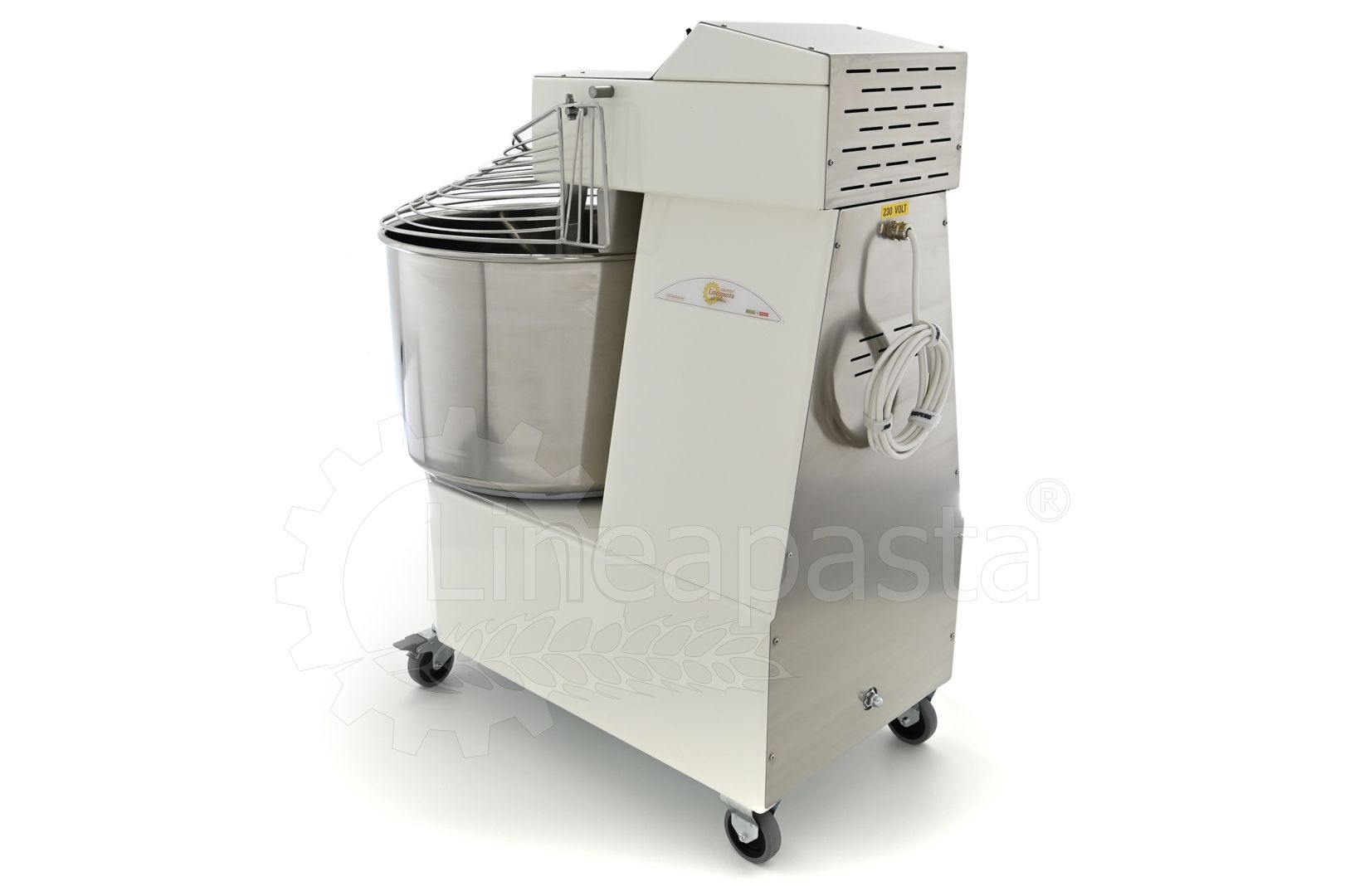 The spiral kneader IS 50 is a kneader equipped with a stainless steel 304 tank with kneading capacity up to 45 kg. This machine is equipped with a spiral, a column "split dough" and a stainless steel tank protection suitable for food contact and designed to withstand strong stresses. The transmission takes place with chains and belt, so as to eliminate both the tedious noise and expensive maintenance and the need to lubricate the mechanical parts with oil. The machine is equipped with a control panel and a start button, as well as a protection with micron locking for user safety. In particular, this version allows the tank to complete 16 laps per minute, while the spiral performs 137. Spiral kneader is a machine suitable for processing ingredients such as flour, sugar, fat, salt, yeast etc. to obtain dough for pasta, bread and pizza (suitable for high hydration dough, from 55-65% water).