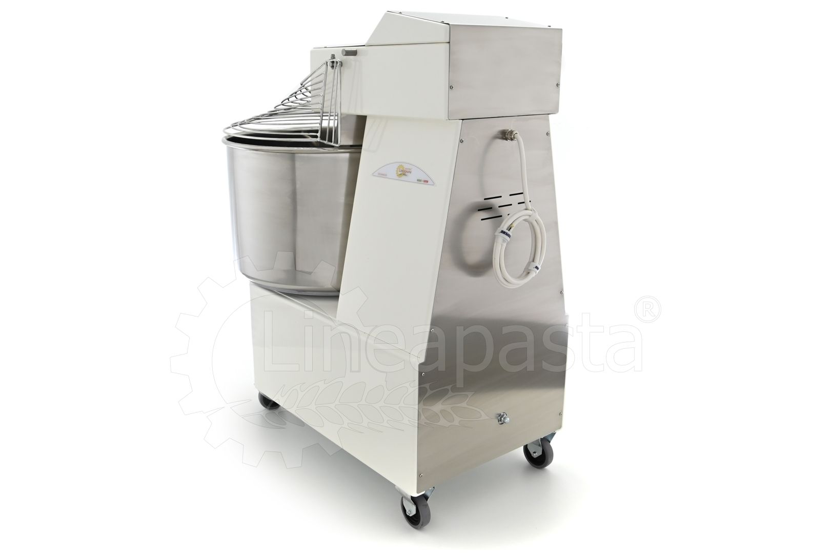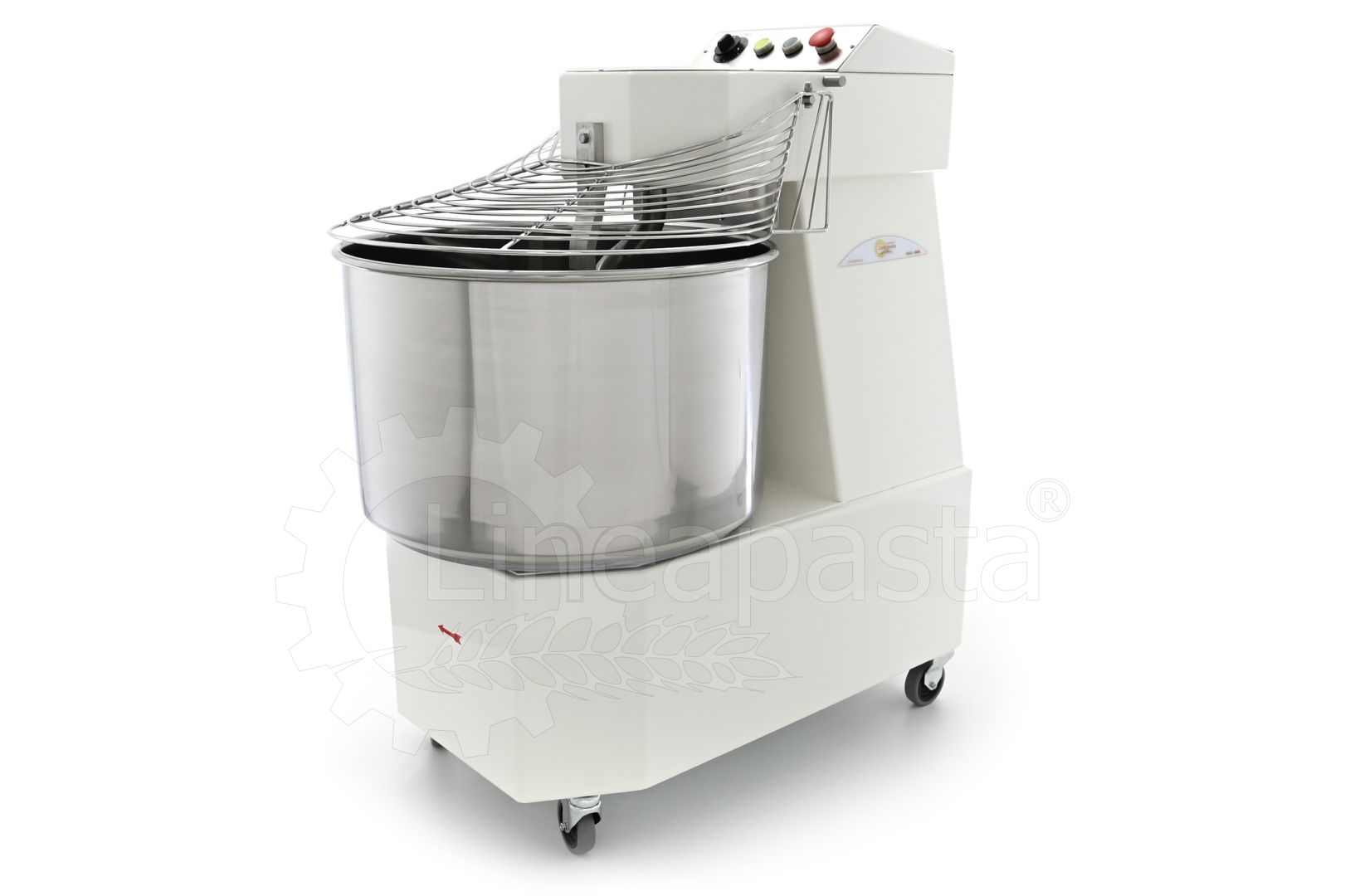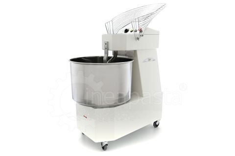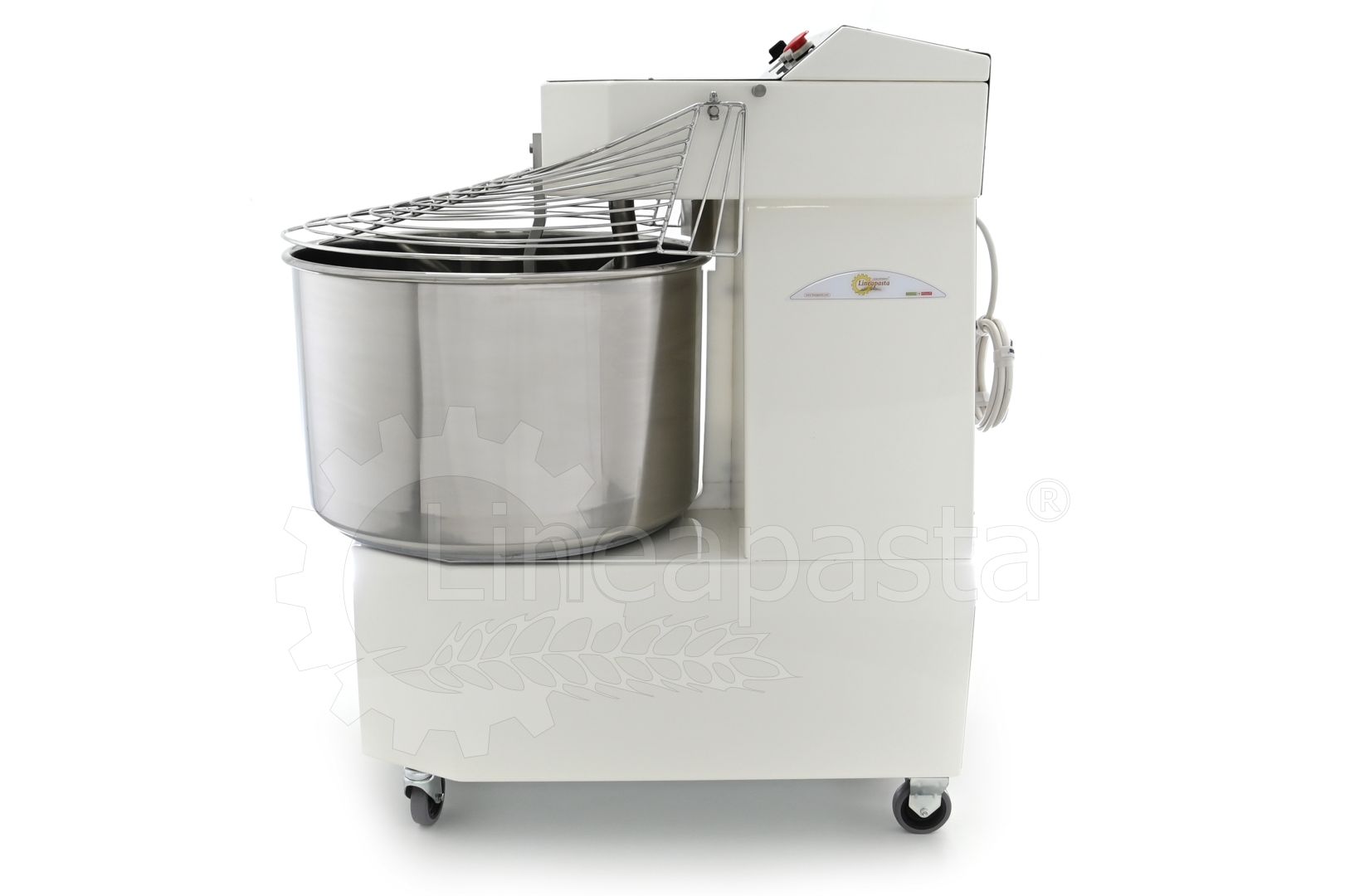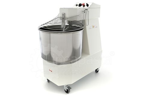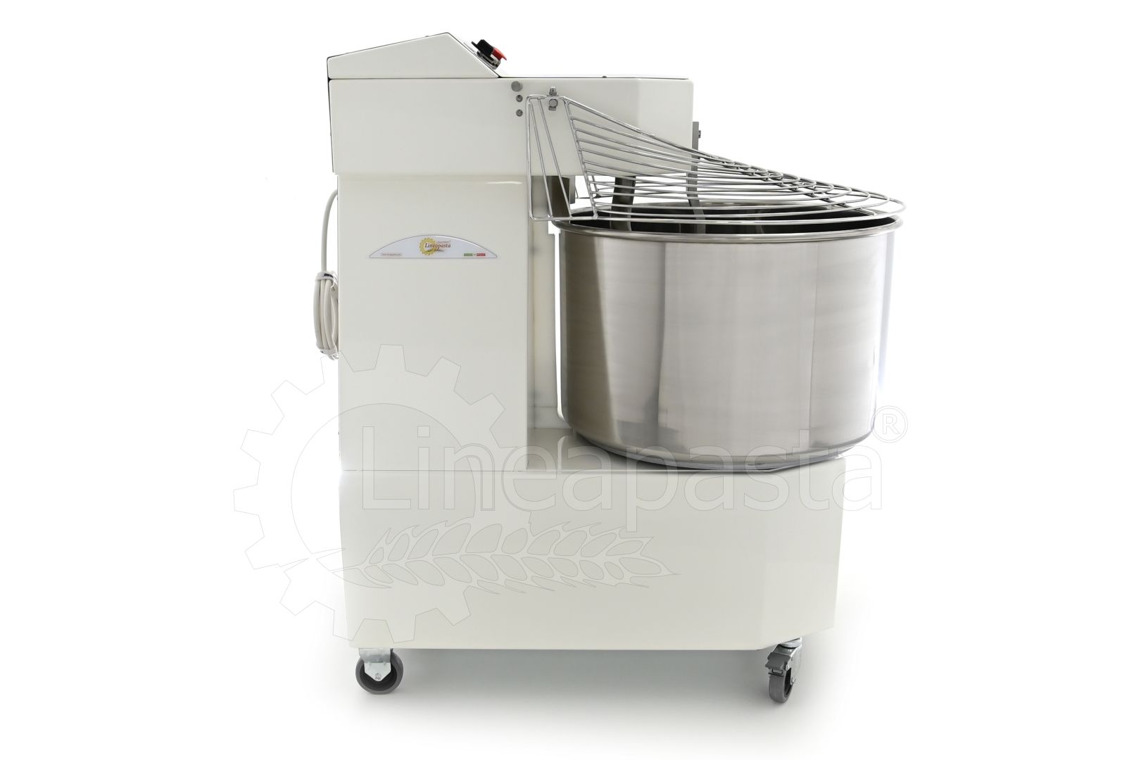 The spiral kneader IS 70 inverter is a kneader equipped with a stainless steel 304 tank with kneading capacity up to 60 kg. This machine is equipped with a spiral, a tank protection and a column "split dough" stainless steel suitable for food contact and designed to withstand strong stresses. The transmission takes place with chains and belt, in such a way as to eliminate both the need to lubricate the mechanical parts with oil and the tedious noises and expensive maintenance. The machine is equipped with a control panel and a start button, as well as a protection with micron blocking for user safety. In particular, this version is equipped with an inverter that allows you to adjust the speed through a potentiometer, up to a maximum of 8.50 beats per minute (tank/spiral ratio). The inverter spiral kneader is a machine suitable for processing ingredients such as flour, sugar, fat, salt, yeast etc. for the production of dough for bread and pizza (suitable for high hydration dough, from 65% water).
