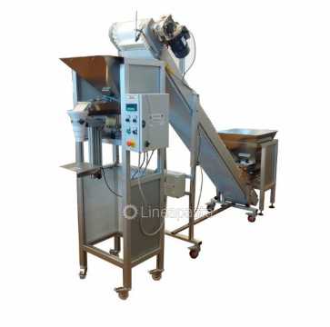 Complete with loading hopper, a weighing plane. Available in counter-top version (Photo 1) or with support and wheels (Photo 2). On request available with loading hopper and elevator belt (Photo 3).