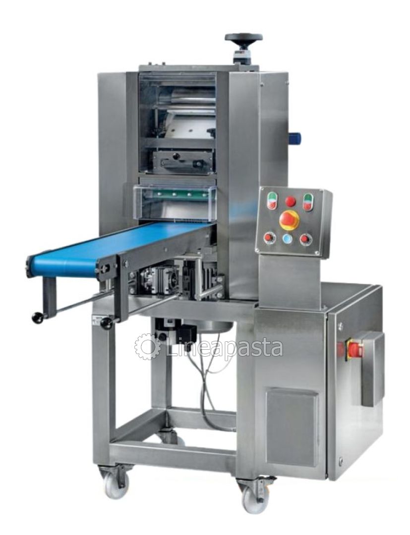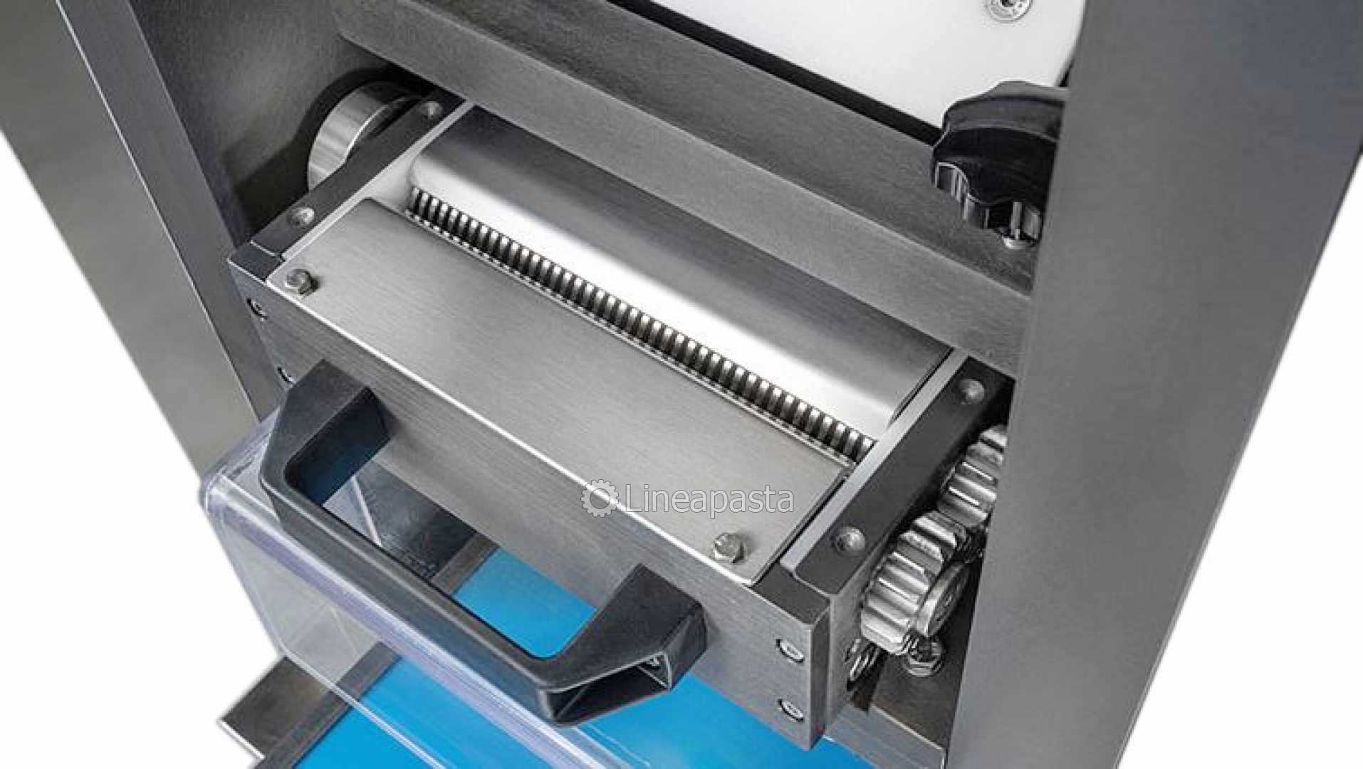 The machine is equipped with a pair of inverter-controlled laminating rollers, which allow the thickness of the pasta to be adjusted as desired. The conveyor belt also allows the product to be flattened and facilitates collection.