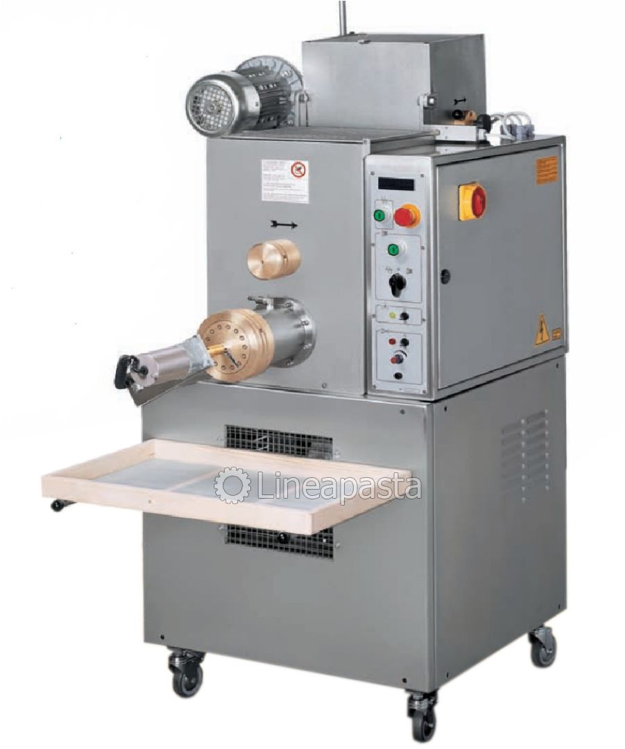 Bottene PM 120 is a complete machine with double vat for the continuous production of long or short pasta shapes depending on the die used; it is also equipped with a water cooling system in the extrusion cylinder that allows it to maintain a constant temperature. It is possible to use different types of flour (soft wheat, durum wheat, whole wheat, gluten-free, etc.) combined with eggs or just water; furthermore, thanks to the addition of optional ingredients such as tomato, spinach or cocoa, it is also possible to obtain excellent colored pasta.