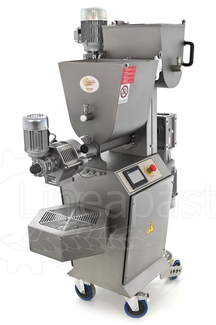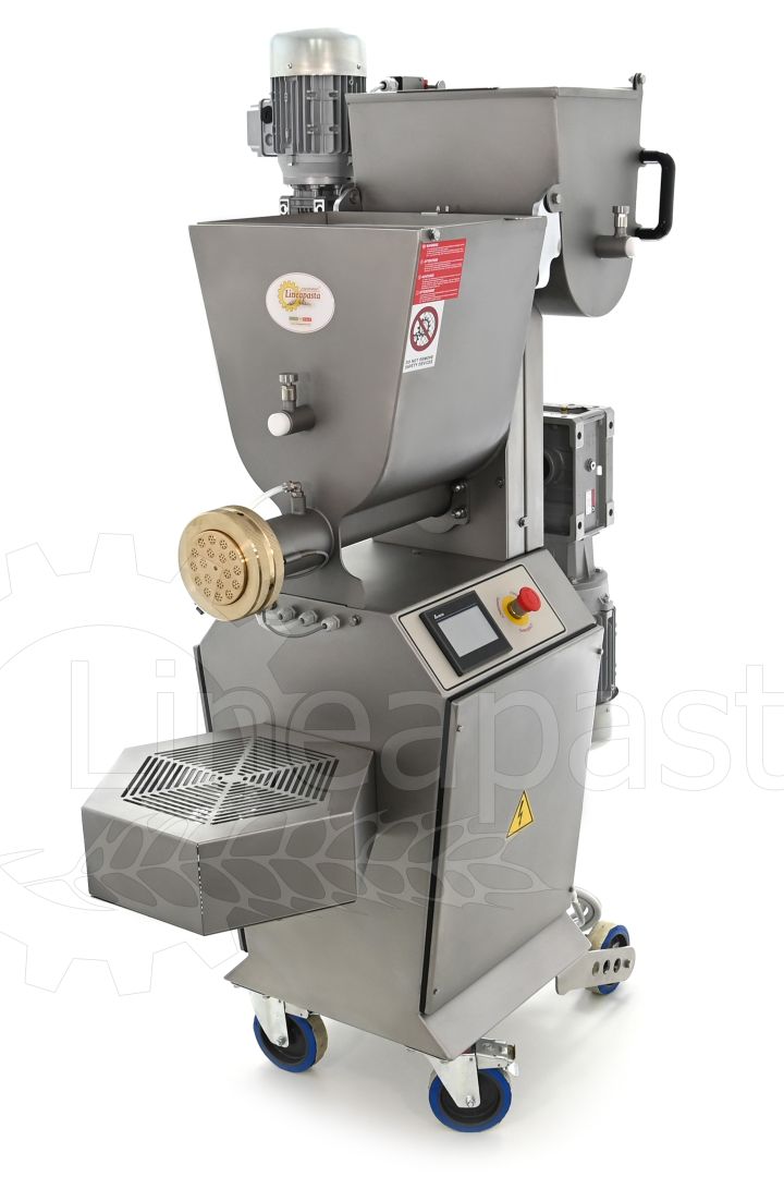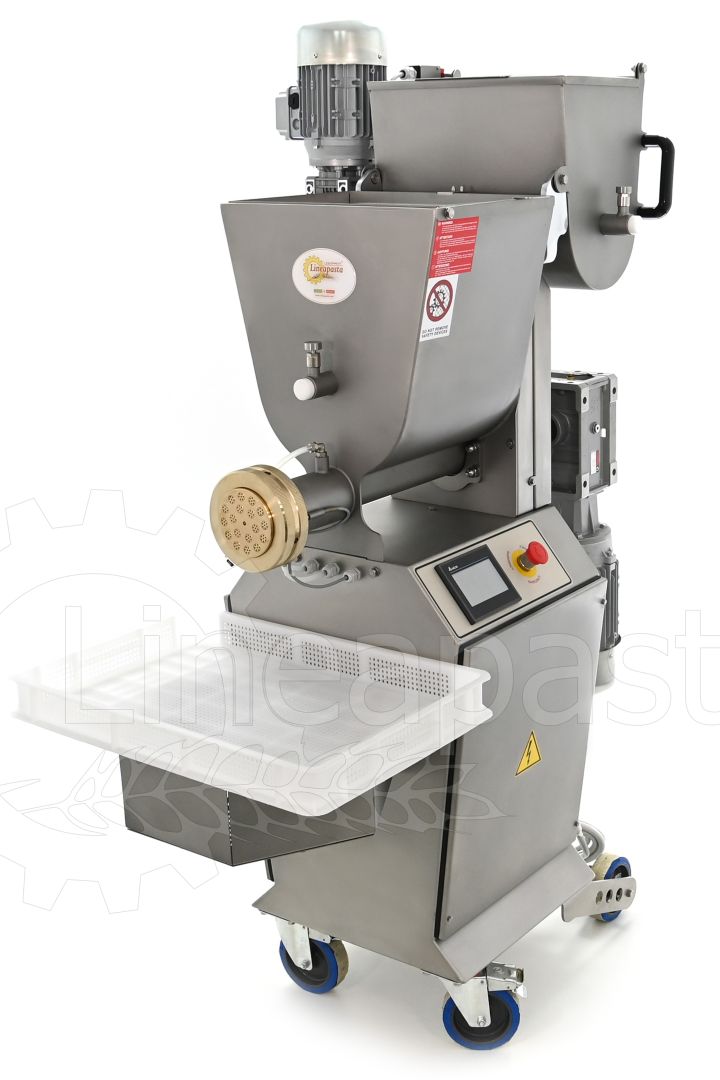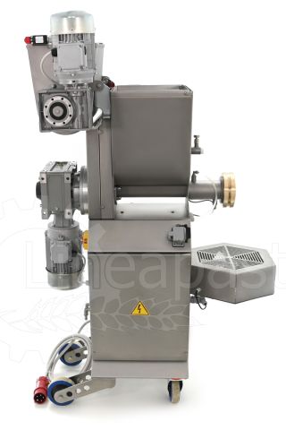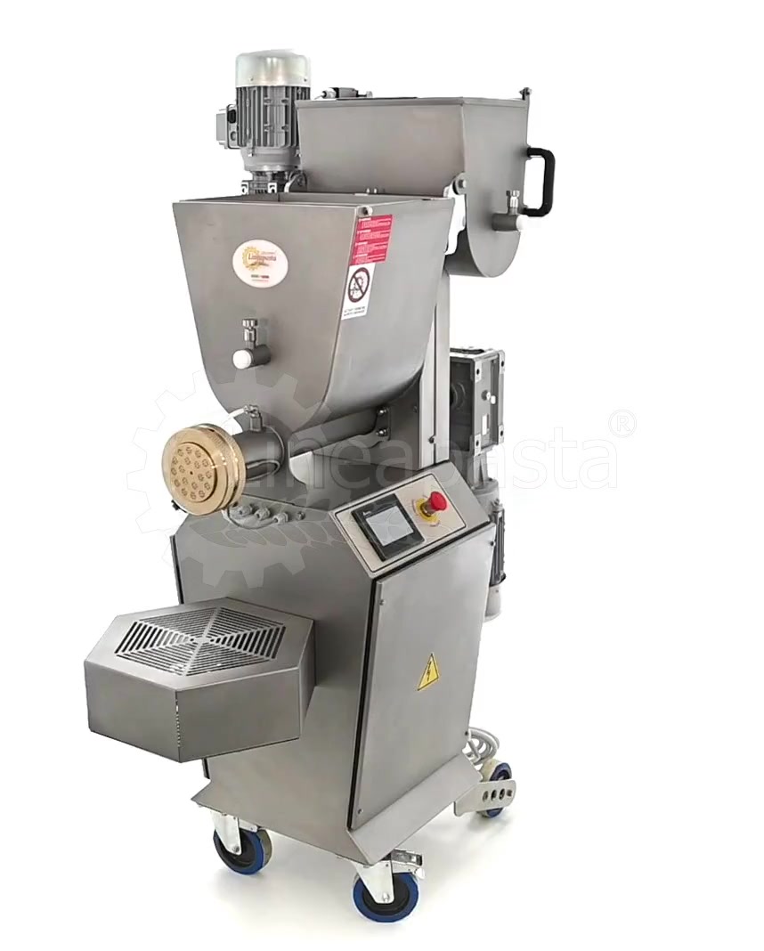 The PS 40DV double vat fresh pasta machine is a machine for the production of fresh pasta suitable for semi-industrial productions, consisting of an 8 kg capacity kneading vat and a 10 kg vat that kneads and extrudes. The double vat allows you to extrude while you are already kneading the dough for the next production, in this way once the extrusion vat is almost empty, you just need to pour the ready-made dough from the kneading vat to the extrusion vat in order to restart immediately the production. The PS 40DV has a production of 40 kg/h, and thanks to the water cooling system that keeps the temperature of the extrusion cylinder low, it is possible to extrude for many consecutive hours without having to stop to wait for it to cool. The PS 40DV pasta machine is built entirely in stainless steel, and it is mounted on swivel wheels and locking feet. The machine is equipped with a touch screen control system with the ability to load and customize recipes according to your production needs, customizing the extrusion speed, the knife speed and the temperature of the extrusion cylinder.