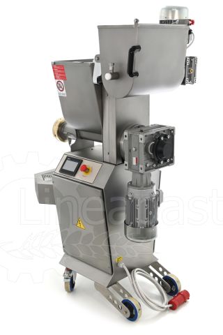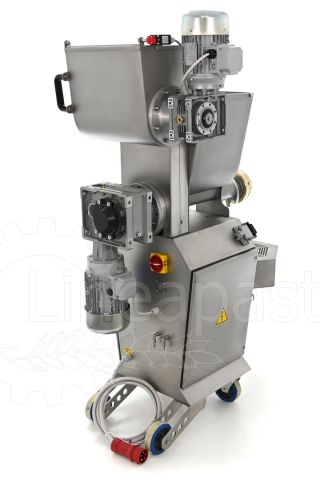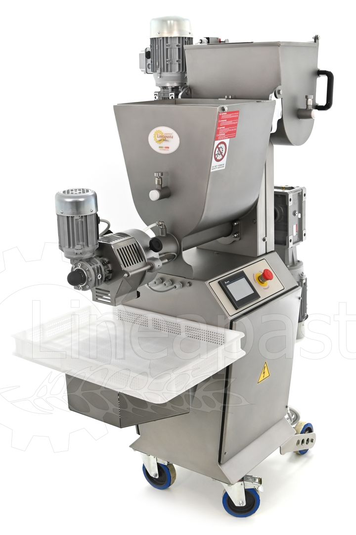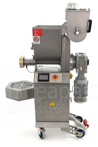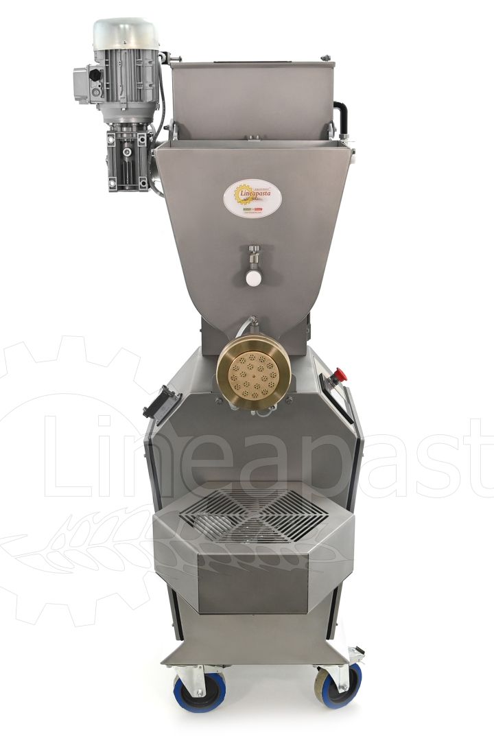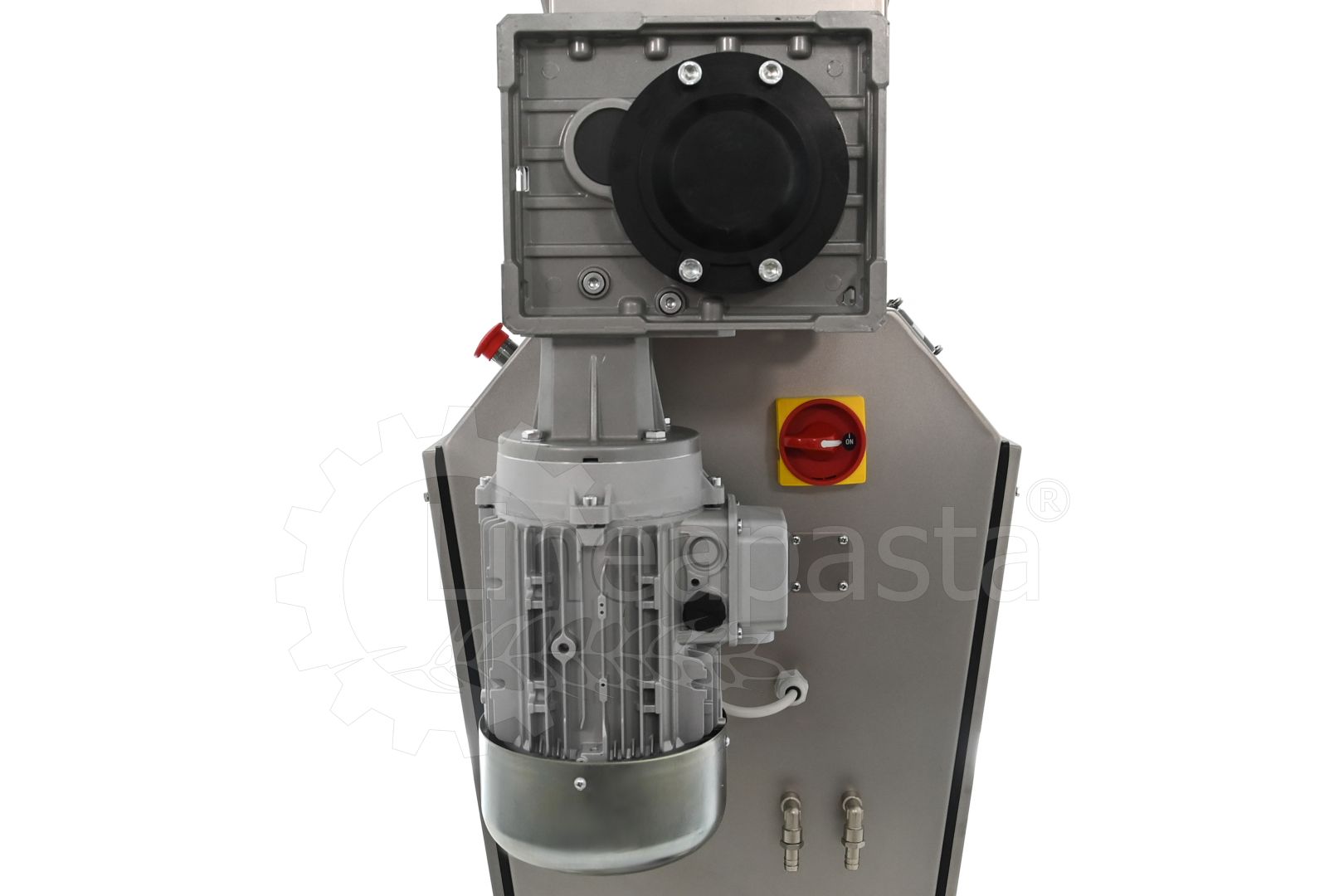 The PS 40DV double vat fresh pasta machine is a machine for the production of fresh pasta suitable for semi-industrial productions, consisting of an 8 kg capacity kneading vat and a 10 kg vat that kneads and extrudes. The double vat allows you to extrude while you are already kneading the dough for the next production, in this way once the extrusion vat is almost empty, you just need to pour the ready-made dough from the kneading vat to the extrusion vat in order to restart immediately the production. The PS 40DV has a production of 40 kg/h, and thanks to the water cooling system that keeps the temperature of the extrusion cylinder low, it is possible to extrude for many consecutive hours without having to stop to wait for it to cool. The PS 40DV pasta machine is built entirely in stainless steel, and it is mounted on swivel wheels and locking feet. The machine is equipped with a touch screen control system with the ability to load and customize recipes according to your production needs, customizing the extrusion speed, the knife speed and the temperature of the extrusion cylinder.