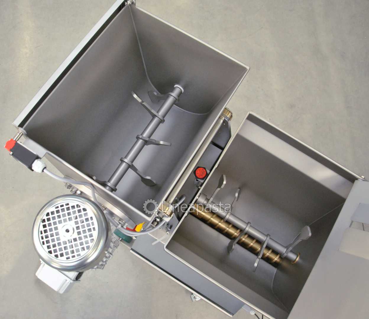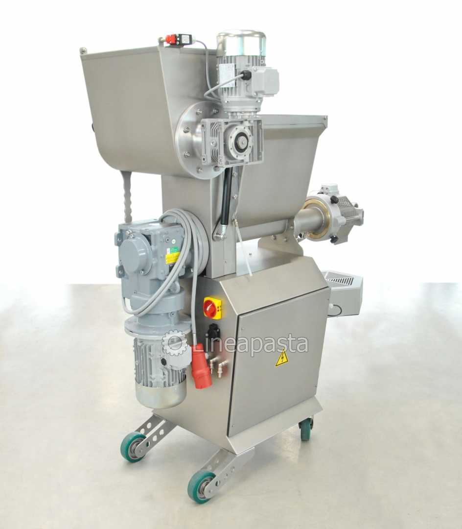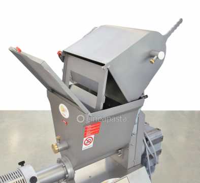 The PS 60DV pasta machine is a double vat press perfect for industrial production, with a production of 60 kg/h of fresh short pasta, long fresh pasta, pasta sheet and penne. This fresh pasta machine is equipped with a kneading vat with a capacity of 15 kg and a kneading/extruder vat of 15 kg. This model is equipped with an automatic system for the tipping over of the kneading vat in order to facilitate the pouring of the dough. Furthermore, thanks to the water cooling system that keeps the temperature of the extruder cylinder low, it is possible to produce for several consecutive hours. The PS 60DV press is entirely built in stainless steel and is mounted on swivel wheels.