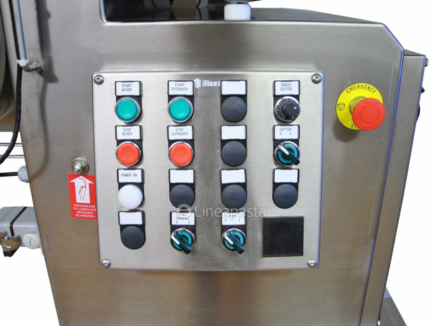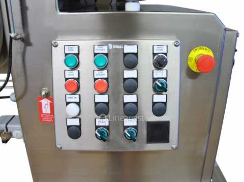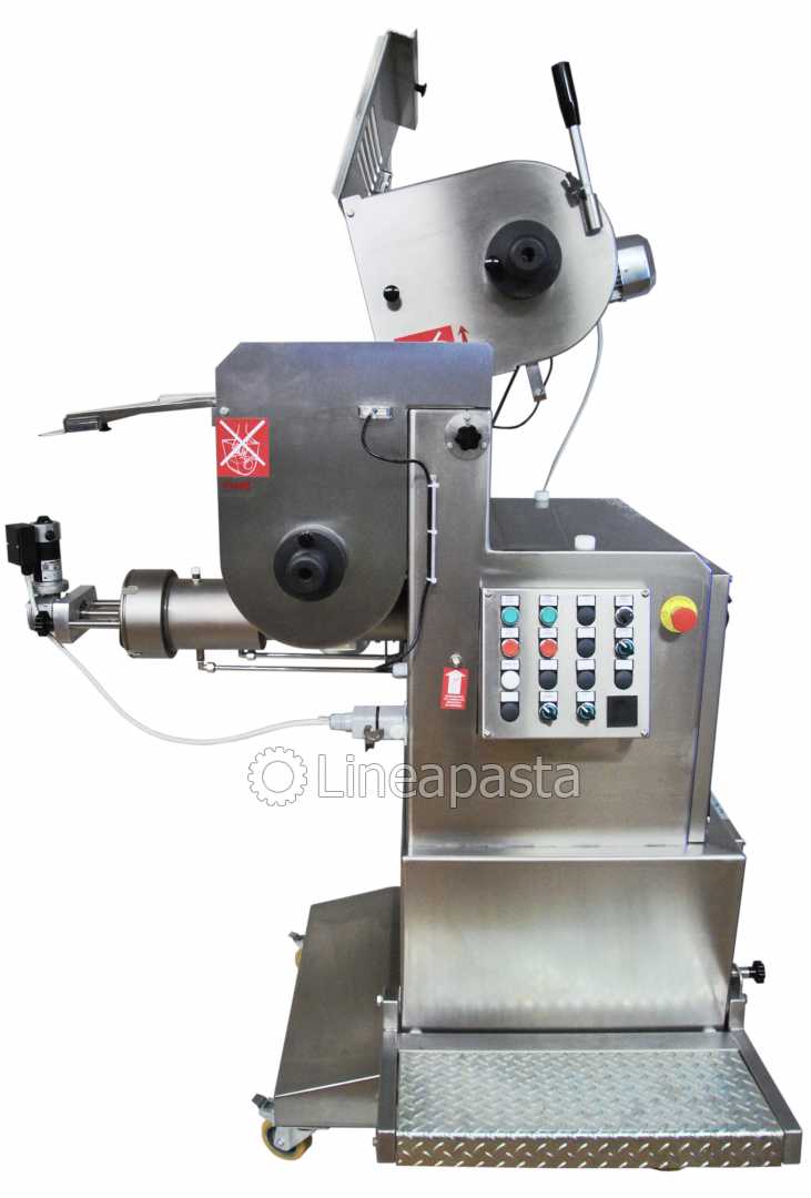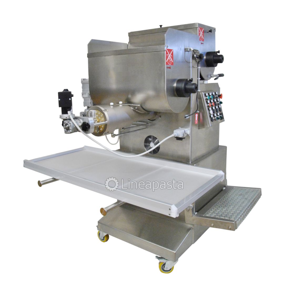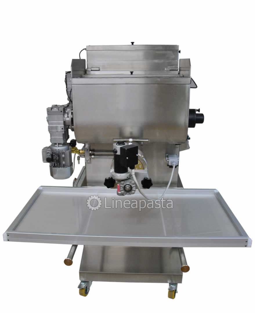 The fresh pasta maker MAC 100 is a highly reliable machine equipped with double vat which allows to knead and extrude at the same time so it allows a continuous production of short, long, and fresh pasta sheet which can be obtained with any type of flour or semolina. The dies can be supplied in brass- bronze to produce a rougher and more porous pasta, better suited to retaining the sauce, or in PTFE (teflon) for a smoother and more glossy pasta. The MAC 100 is recommended for shops and laboratories, it is built entirely of stainless steel mounted on wheels and is equipped with a control panel and complies with current accident prevention regulations. It is supplied with an automatic pasta cutter for short pasta with speed variator with 1, 2 and 4 blade knives and two pasta trays.