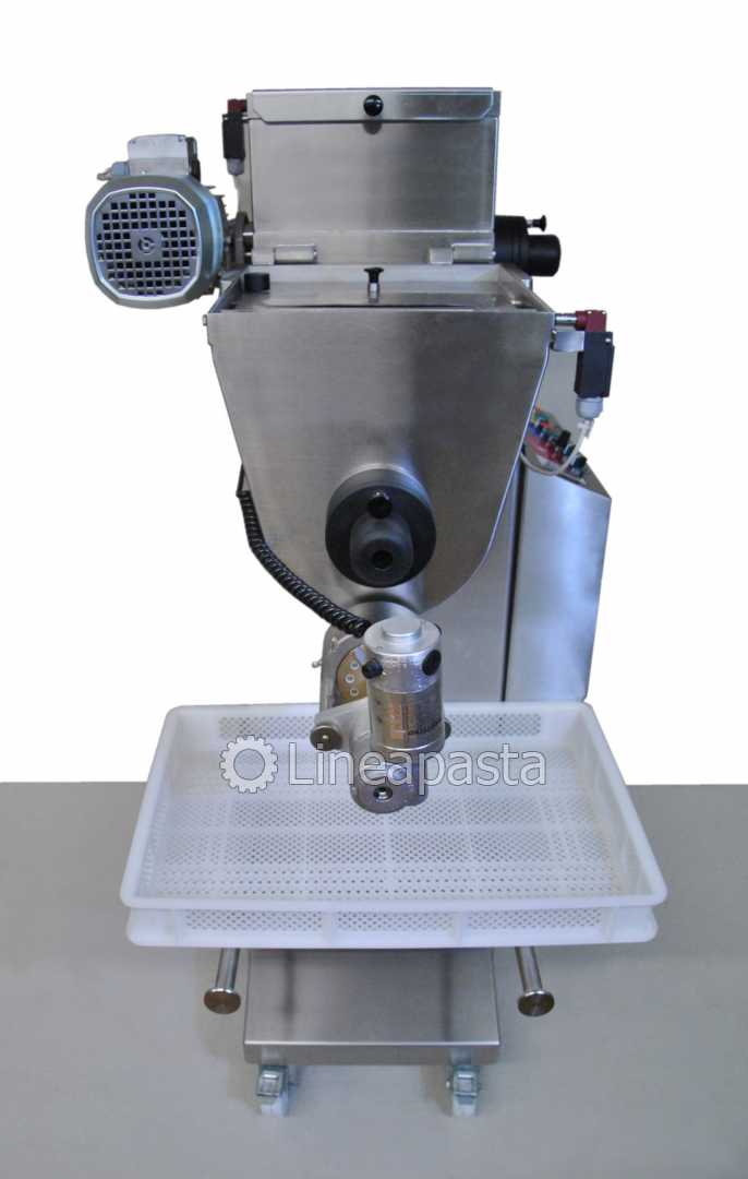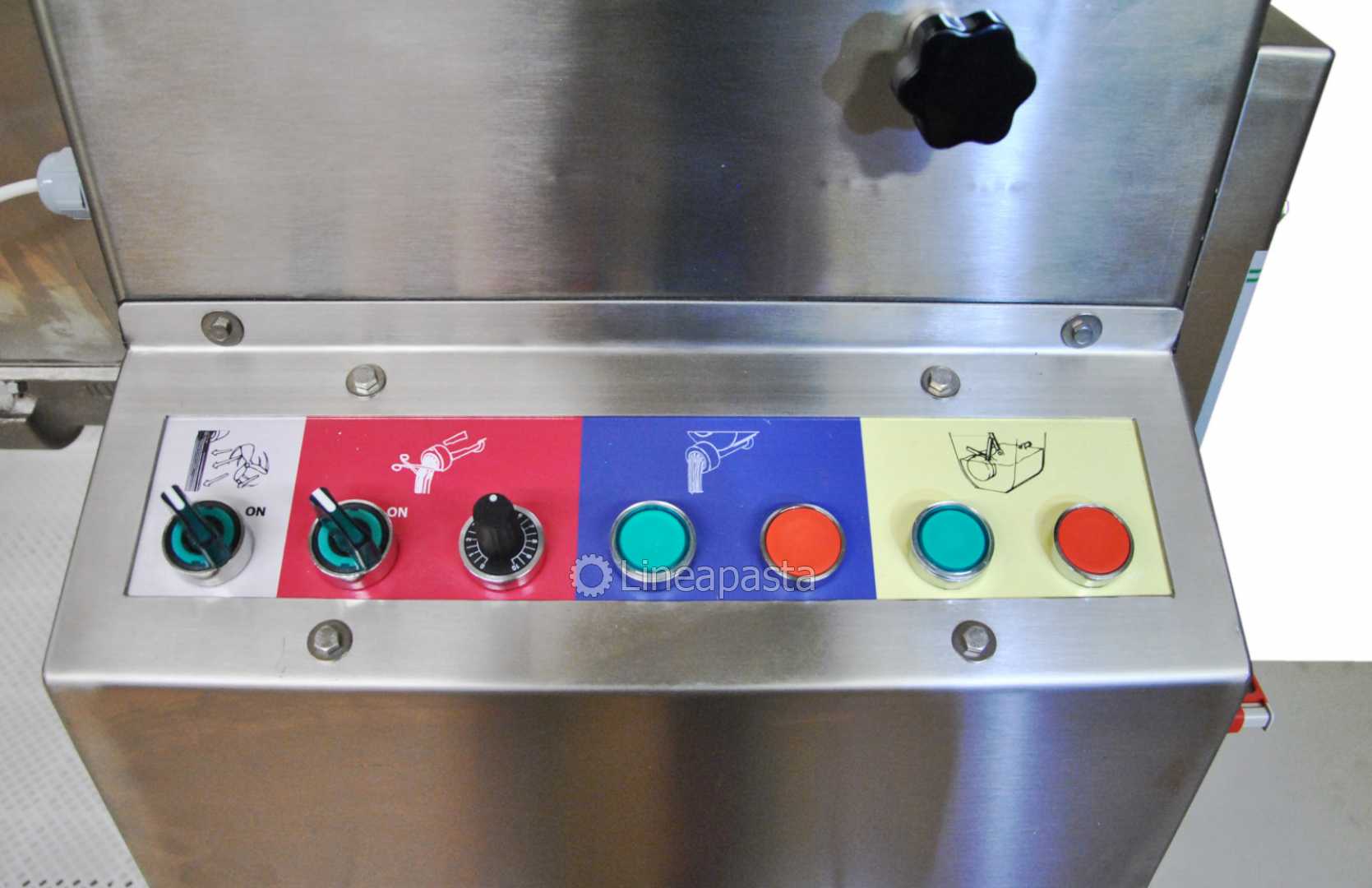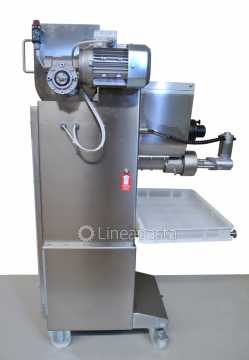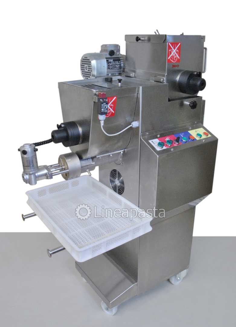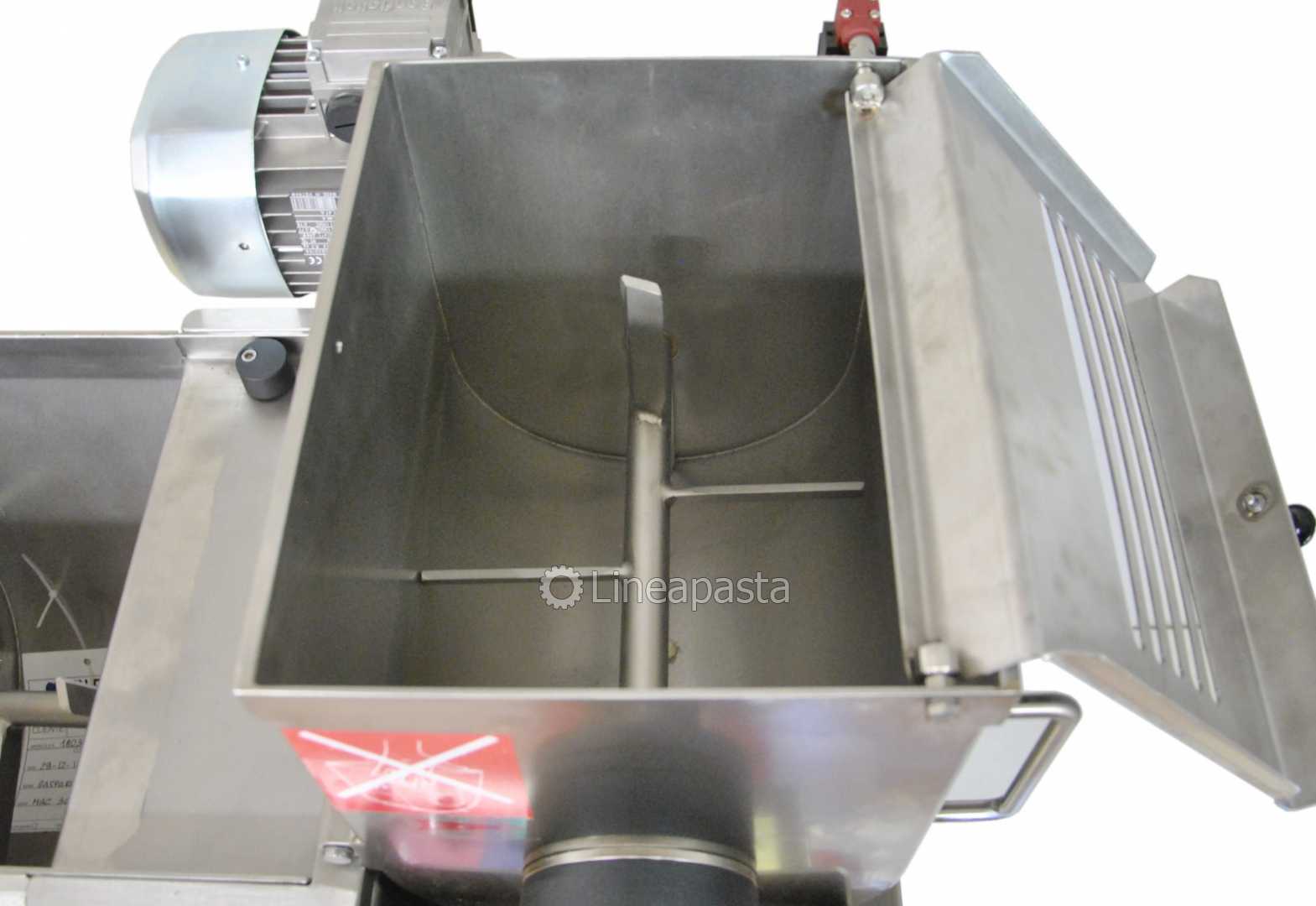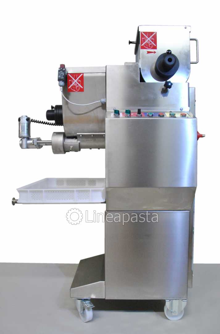 The fresh pasta maker MAC 30 is a highly reliable machine equipped with double vat which allows to knead and extrude at the same time so it allows a continuous production of short, long, and fresh pasta sheet which can be obtained with any type of flour or semolina. The dies can be supplied in brass-bronze to produce a rougher and more porous pasta, better suited to retaining the sauce, or in PTFE (teflon) for a smoother and more glossy pasta. The MAC 30 is recommended for shops and laboratories, it is built entirely of stainless steel mounted on wheels and is equipped with a control panel and complies with current accident prevention regulations. It is supplied with an automatic pasta cutter for short pasta with speed variator with 1, 2 and 4 blade knives and two pasta trays.