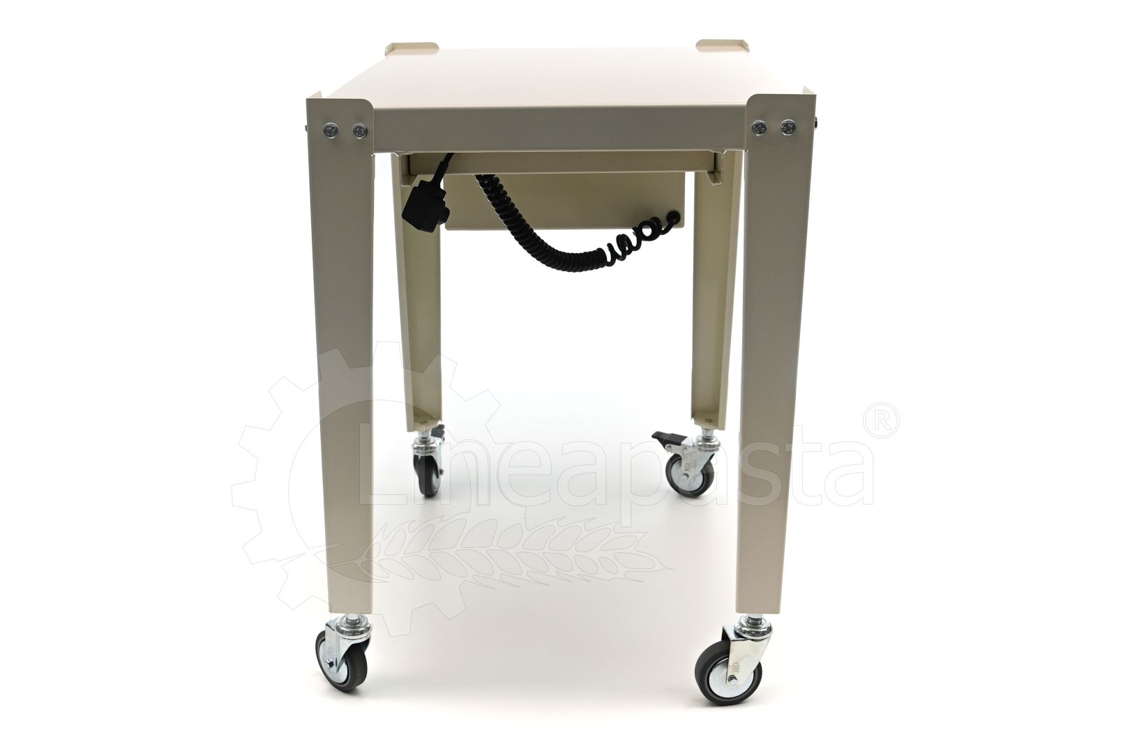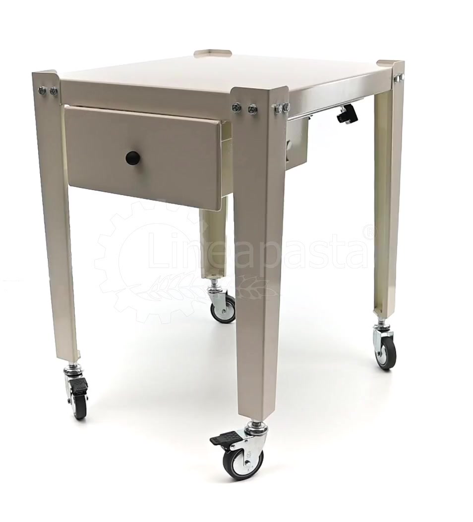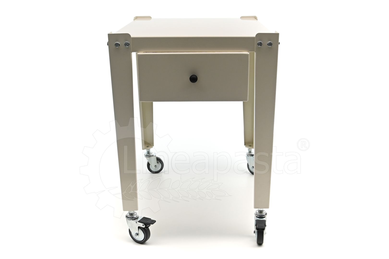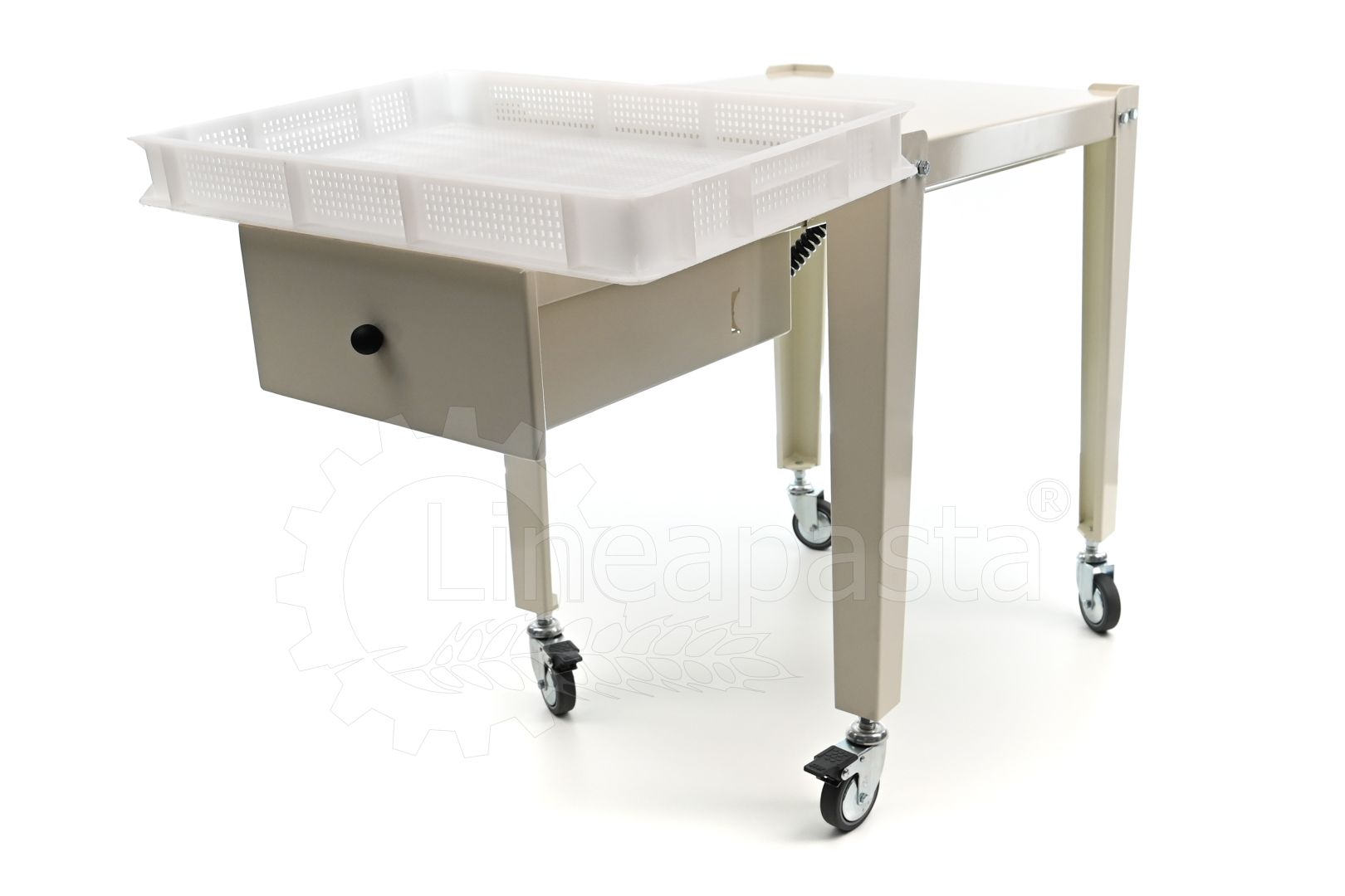 Trolley for pasta made of metal, equipped with a removable drawer fan that allows you to dry the freshly extruded pasta by placing the perforated pasta tray on top. The trolley is of robust workmanship, it is equipped with rubber wheels that allow it to move easily, which can be blocked thanks to a special integrated brake.