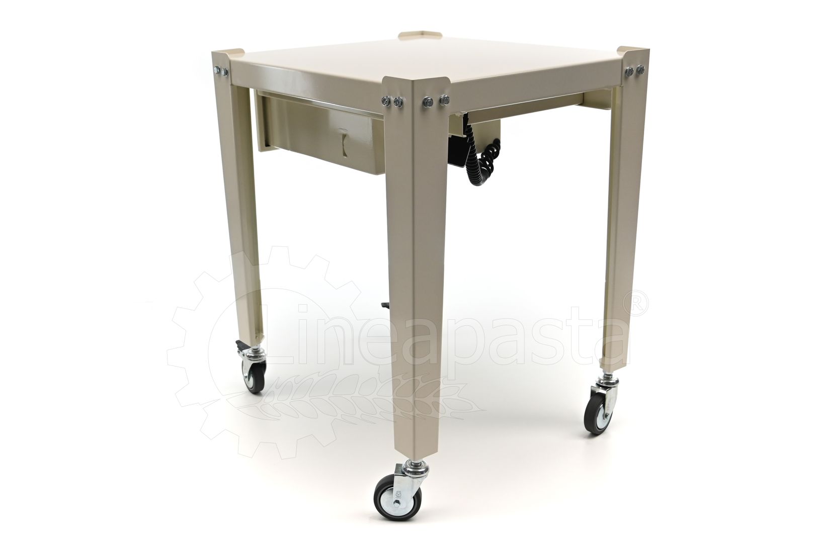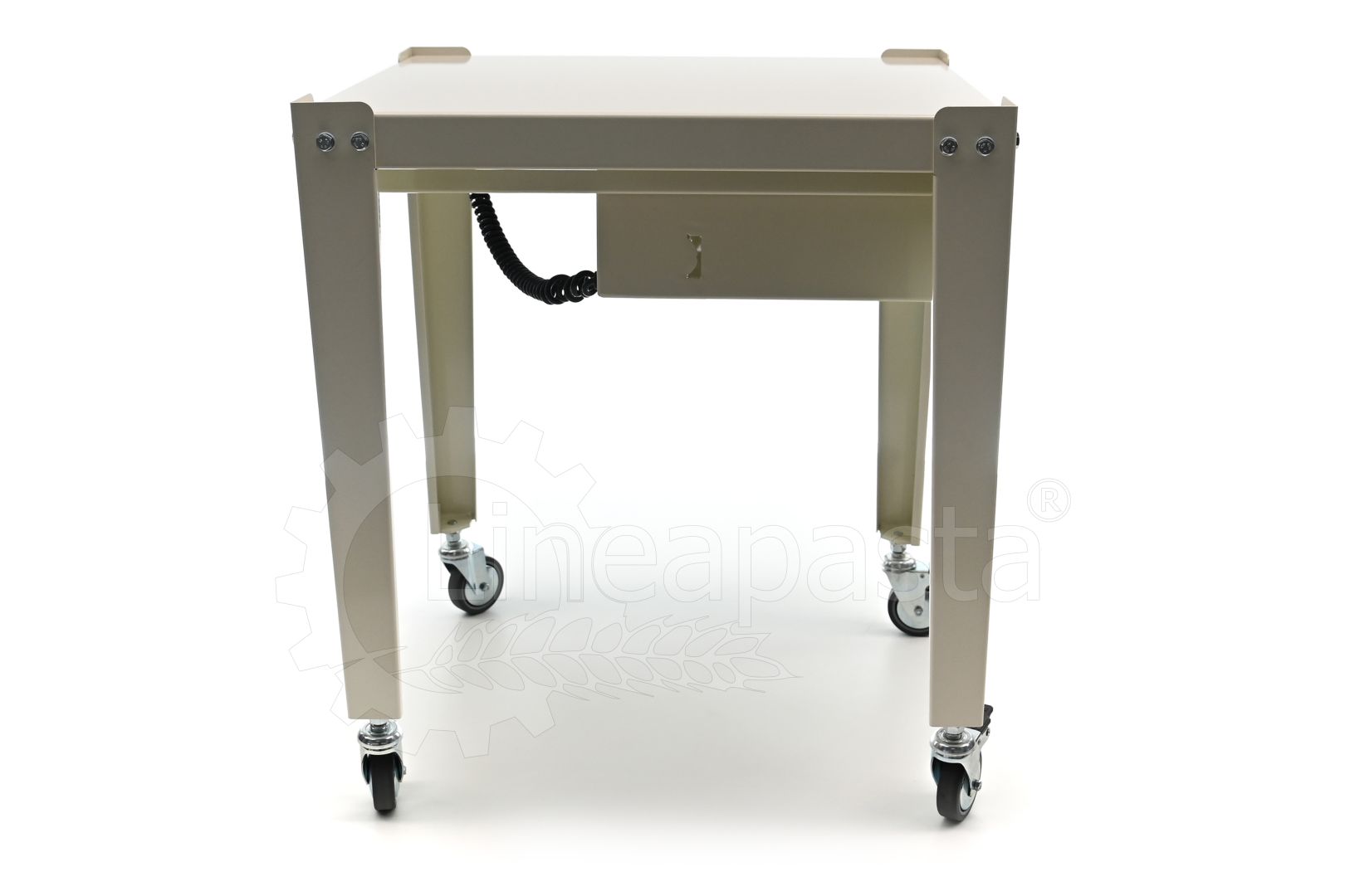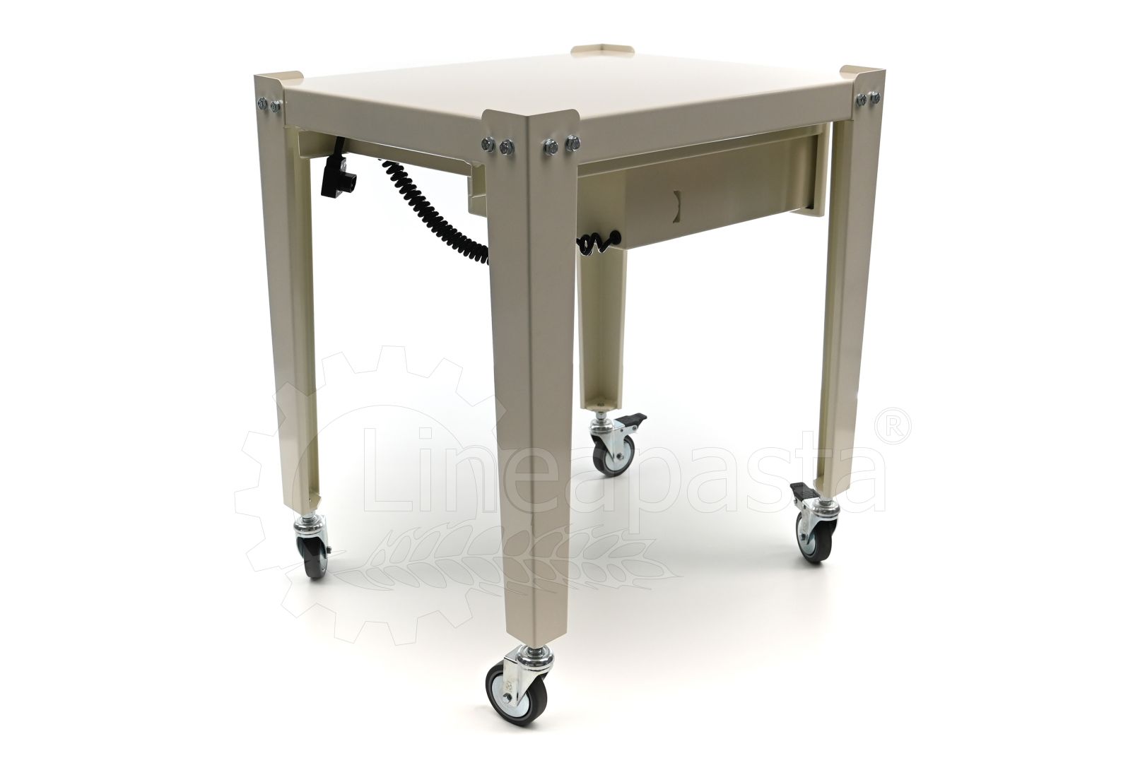 Trolley for pasta made of metal, equipped with a removable drawer fan that allows you to dry the freshly extruded pasta by placing the perforated pasta tray on top. The trolley is of robust workmanship, it is equipped with rubber wheels that allow it to move easily, which can be blocked thanks to a special integrated brake.