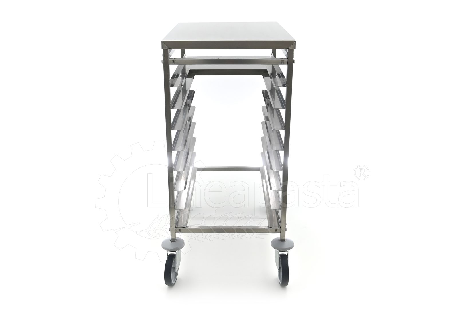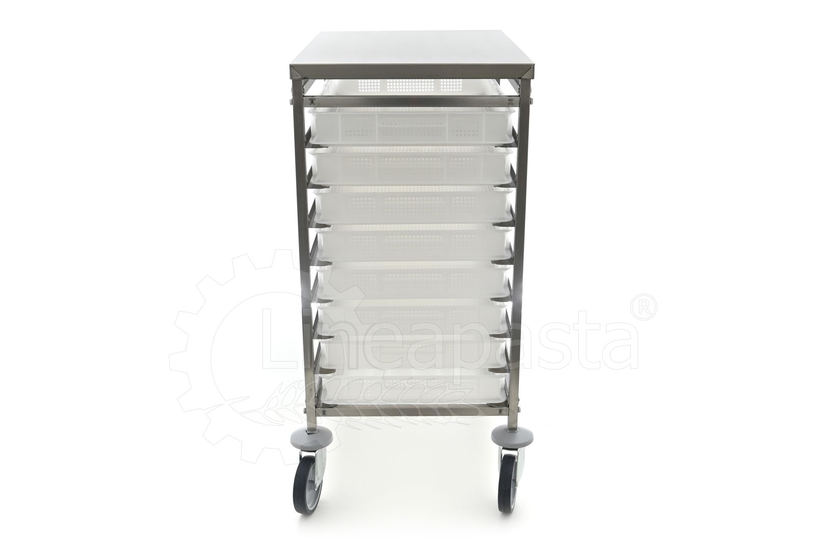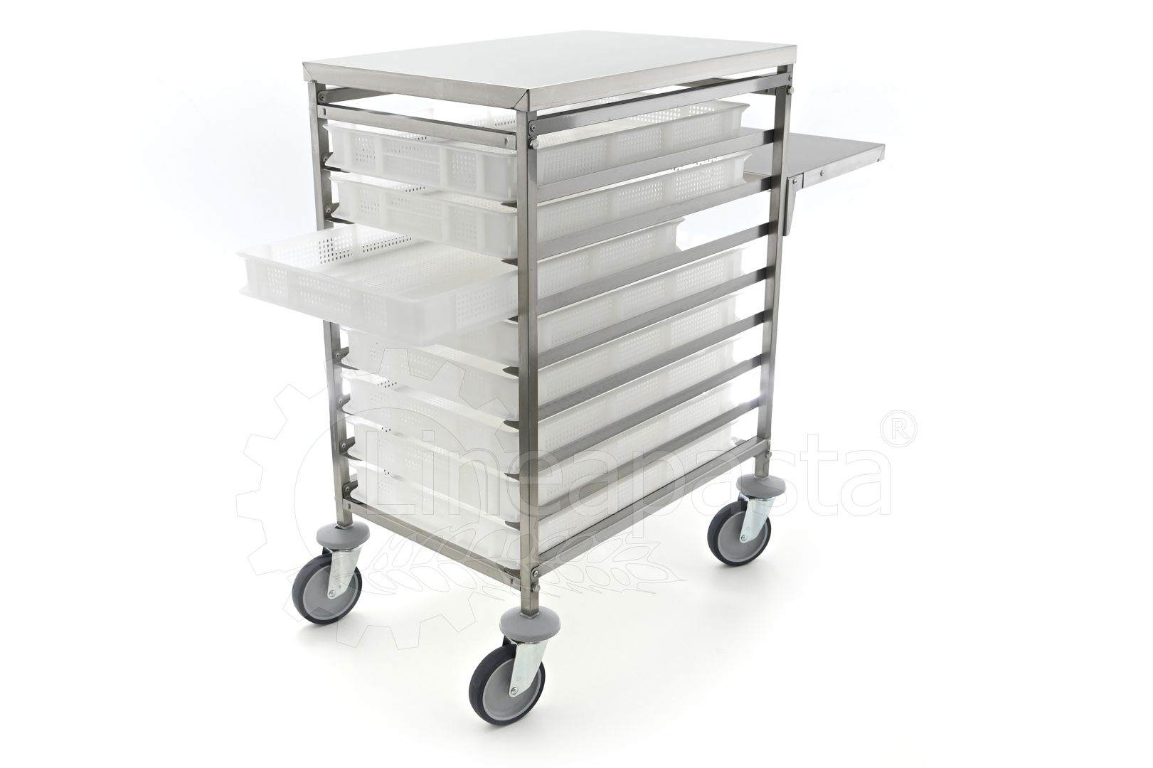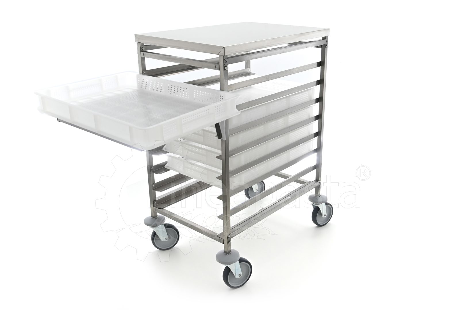 Stainless steel pasta trolley, designed to optimize the production of short, long and filled pasta. The trolley is equipped with a 46x66 cm wide support base, a 35x45 cm wide front support and is equipped with a rack that can hold up to a maximum of 8 60x40x7 cm cm perforated trays. The trolley is mounted on four wheels that allow you to move it comfortably.