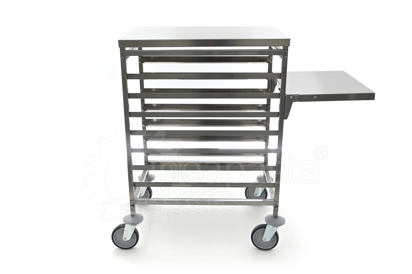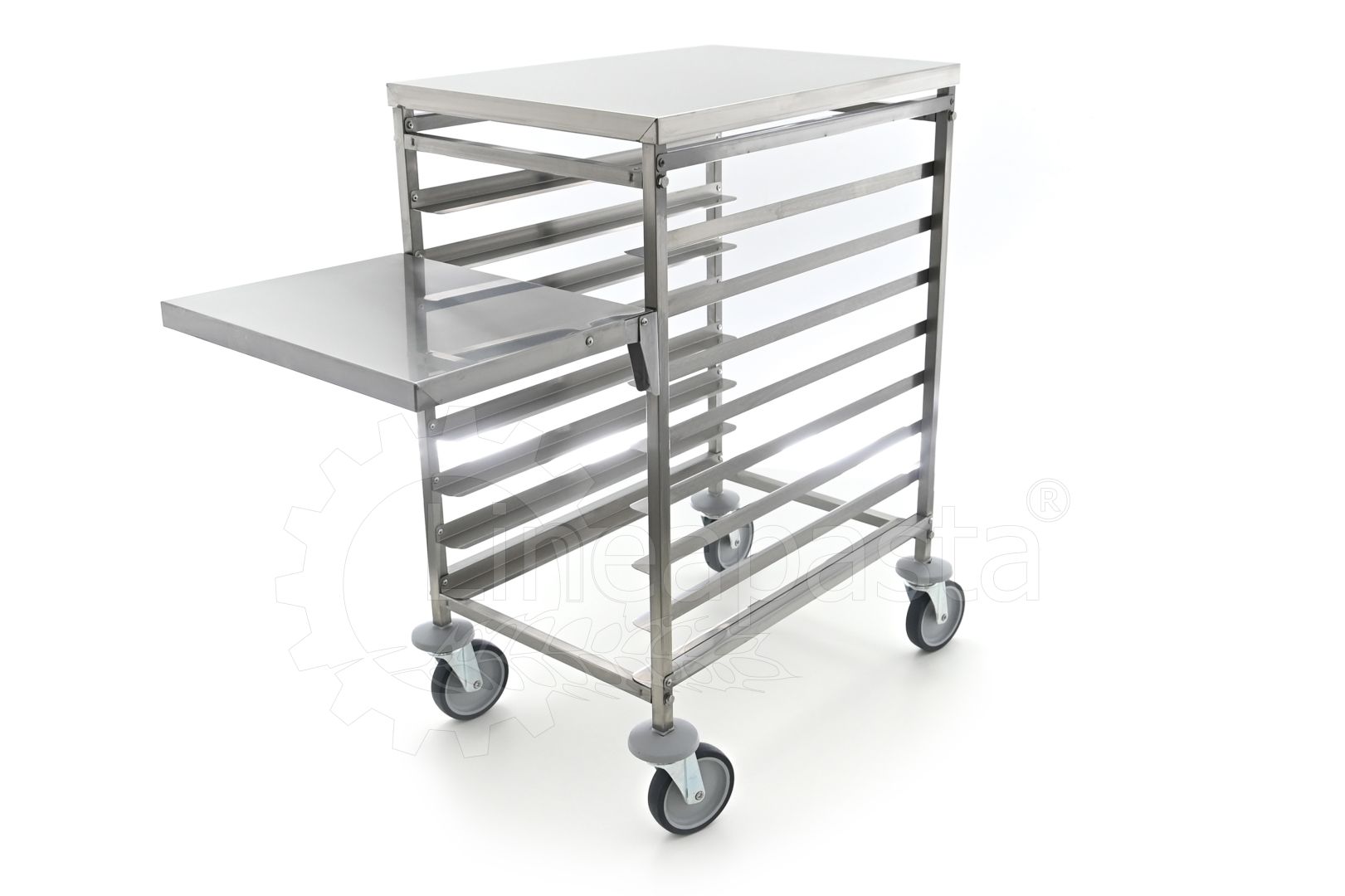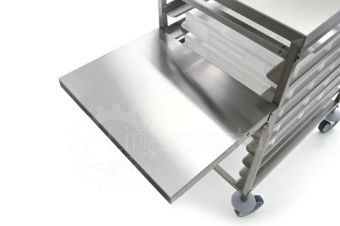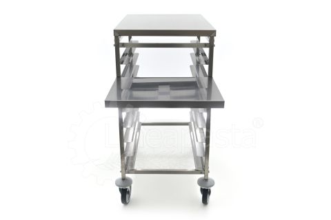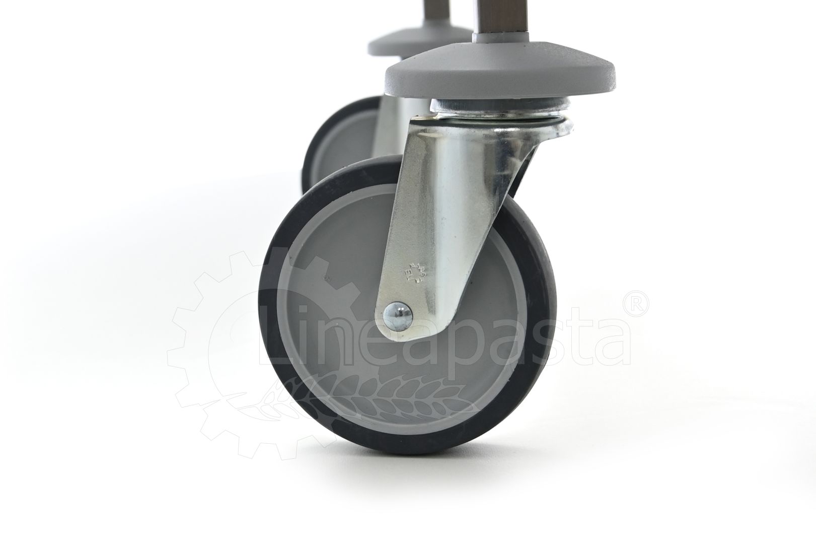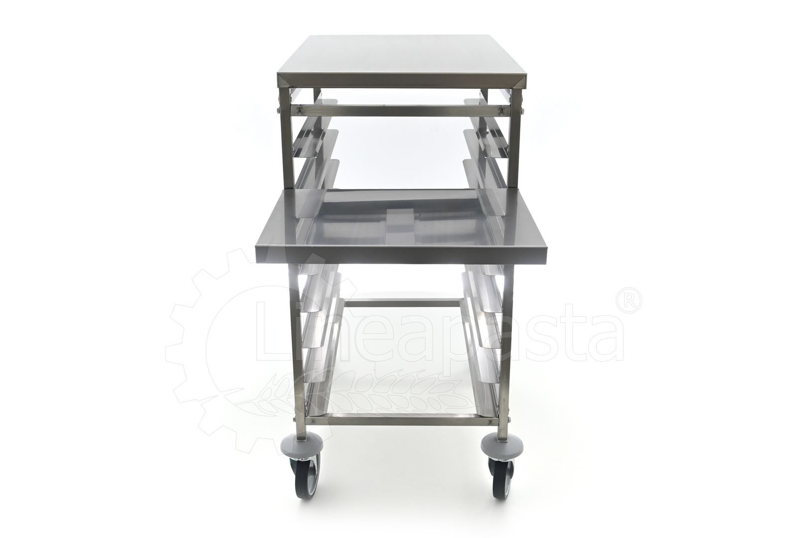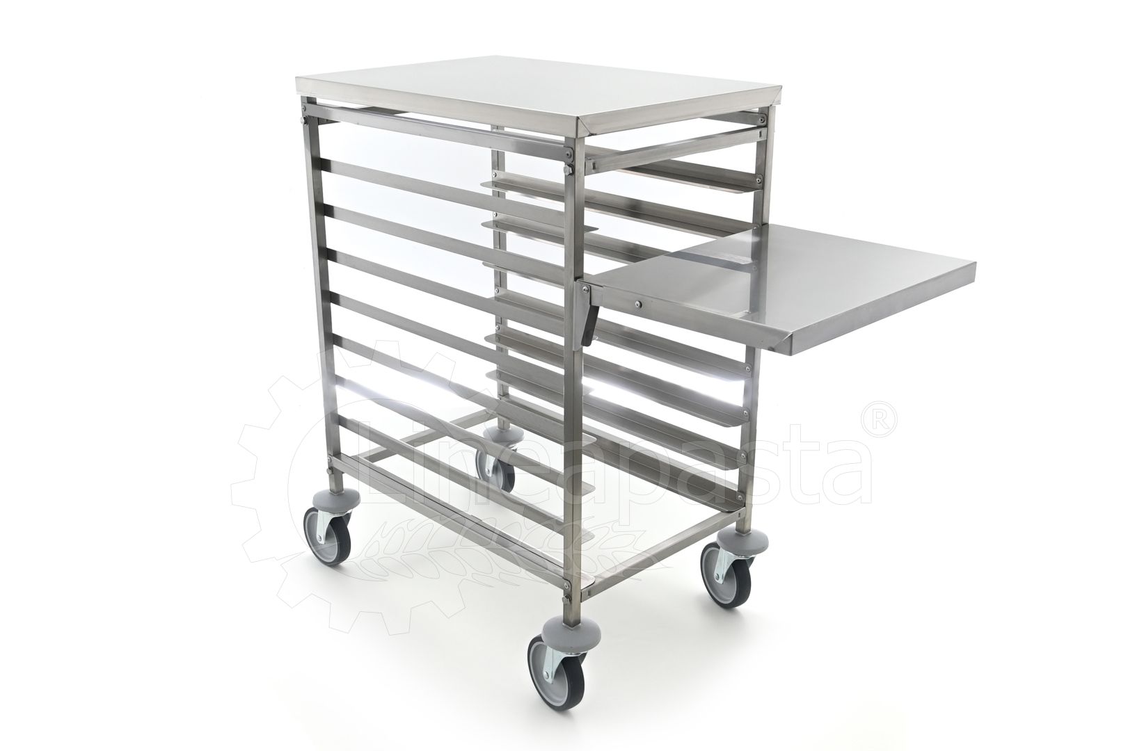 Stainless steel pasta trolley, designed to optimize the production of short, long and filled pasta. The trolley is equipped with a 46x66 cm wide support base, a 35x45 cm wide front support and is equipped with a rack that can hold up to a maximum of 8 60x40x7 cm cm perforated trays. The trolley is mounted on four wheels that allow you to move it comfortably.