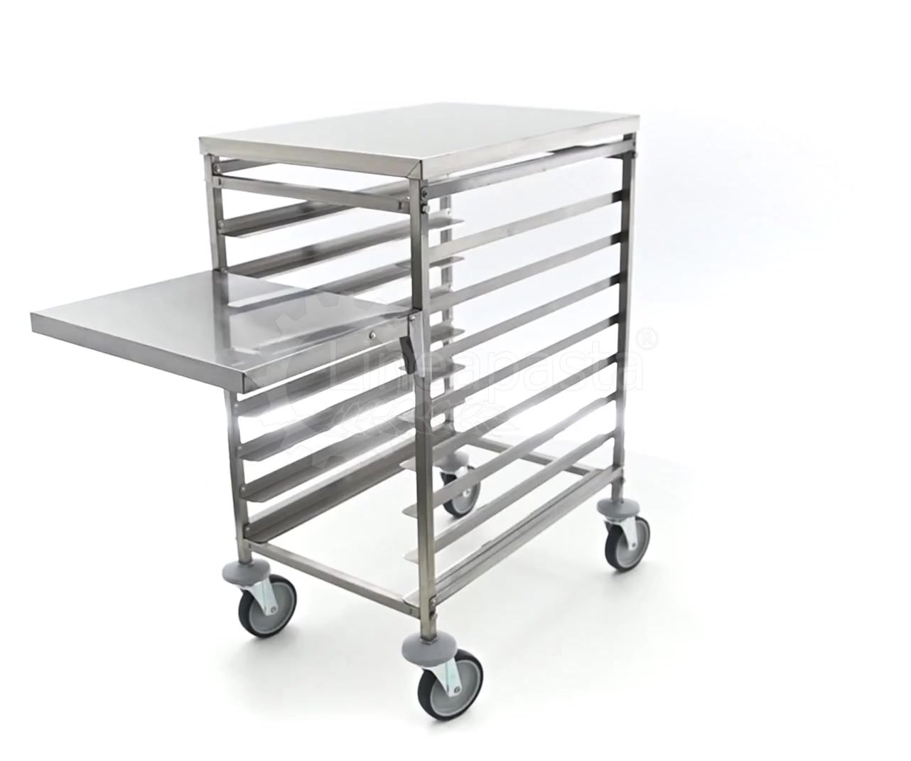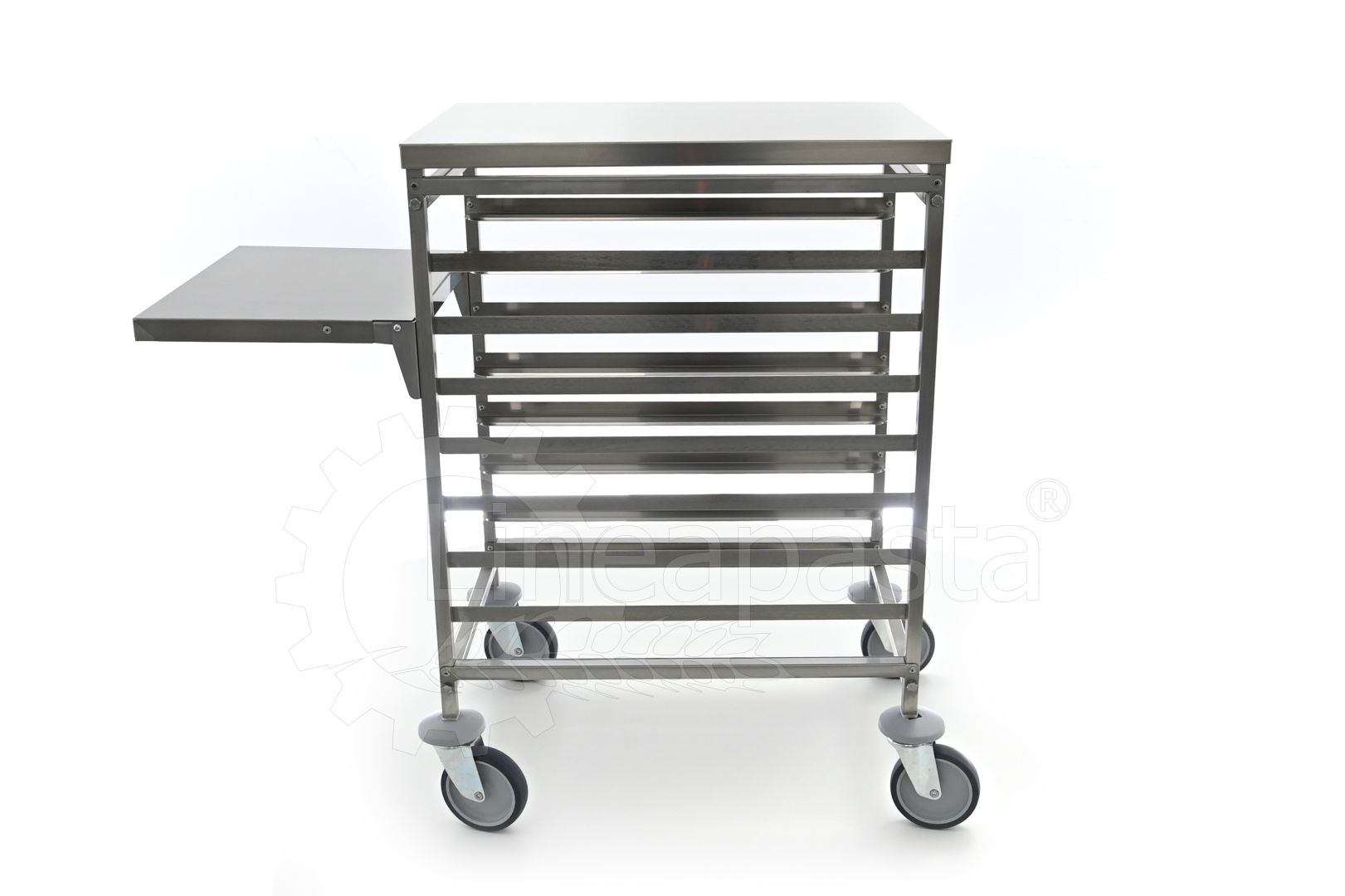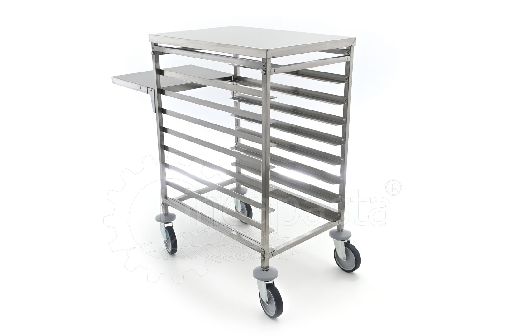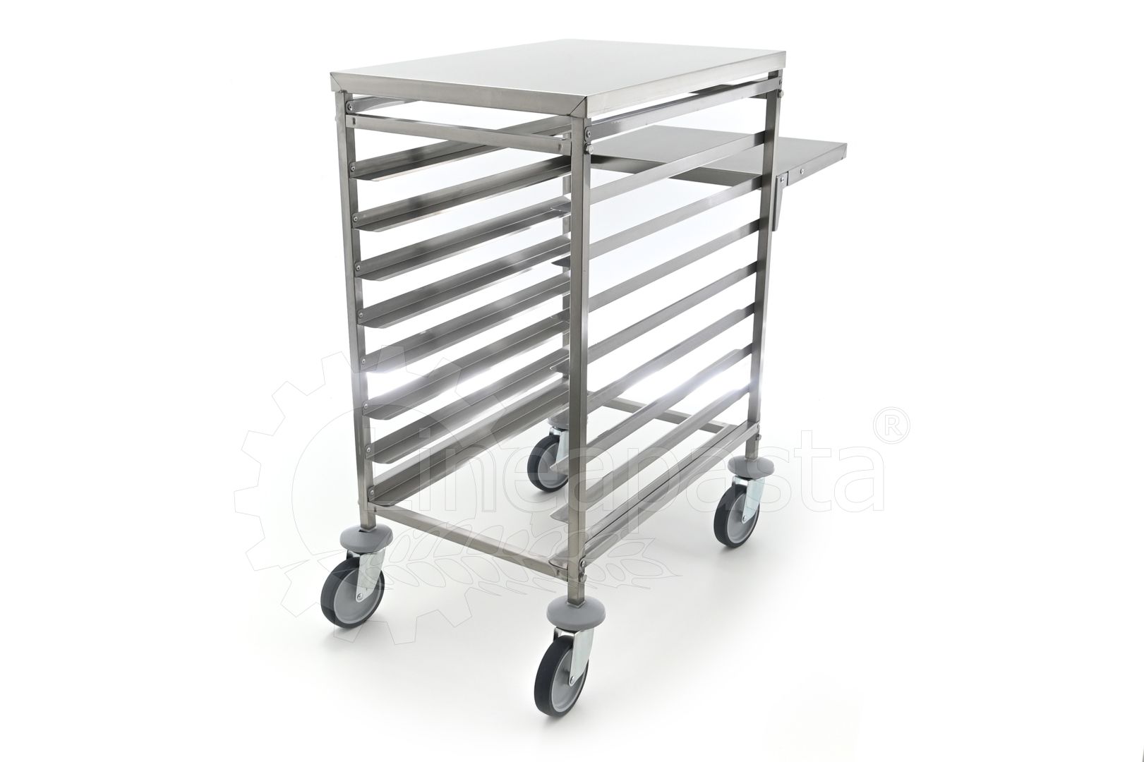 Stainless steel pasta trolley, designed to optimize the production of short, long and filled pasta. The trolley is equipped with a 46x66 cm wide support base, a 35x45 cm wide front support and is equipped with a rack that can hold up to a maximum of 8 60x40x7 cm cm perforated trays. The trolley is mounted on four wheels that allow you to move it comfortably.