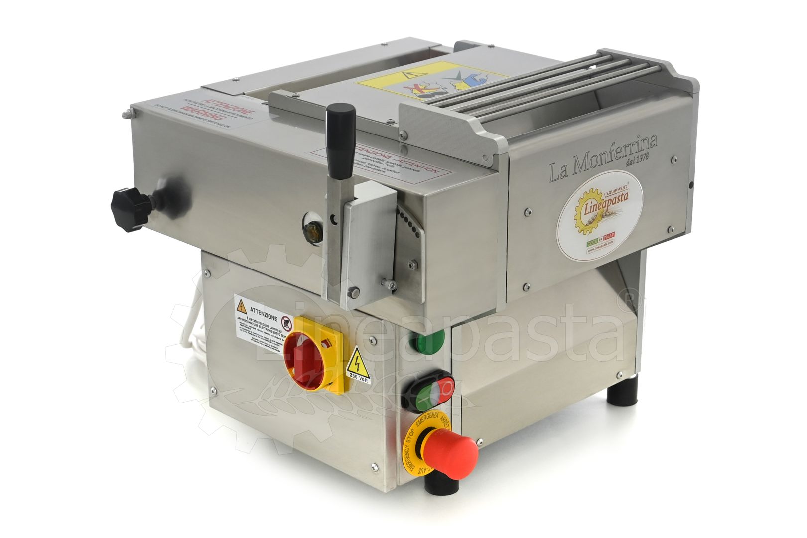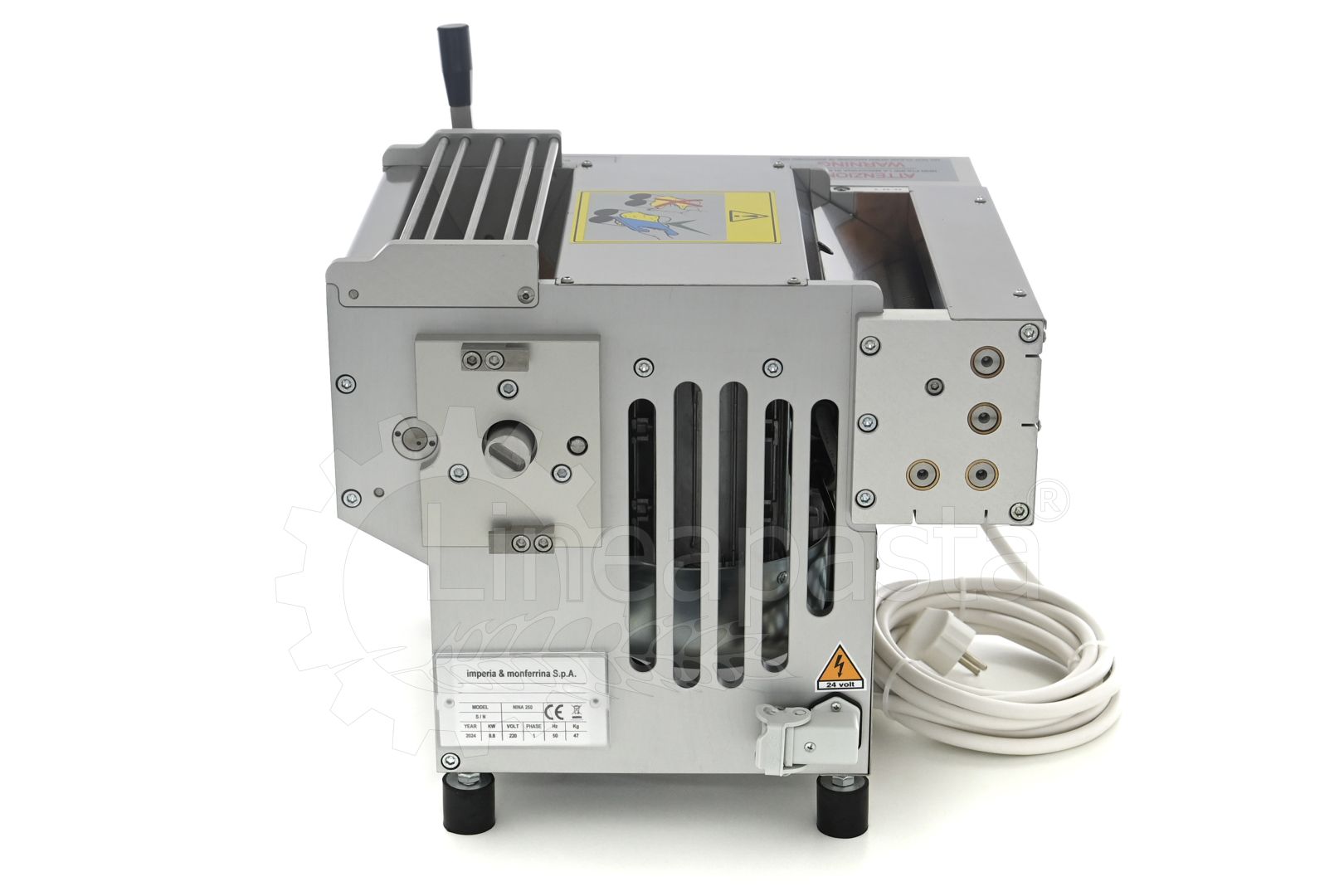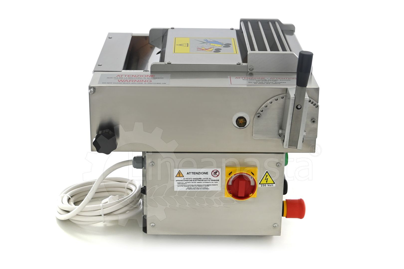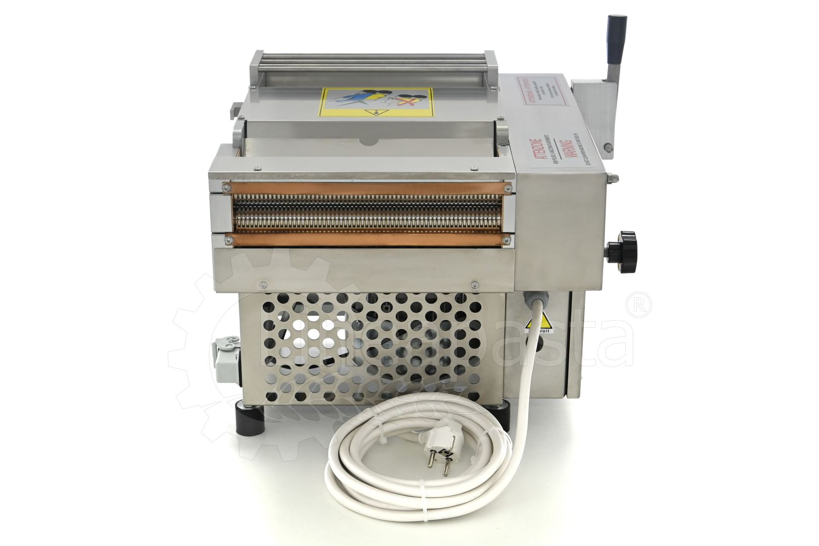 It has an external structure in anodized aluminum and the parts in contact with the pasta in stainless steel; Includes safety button and power indicator.
