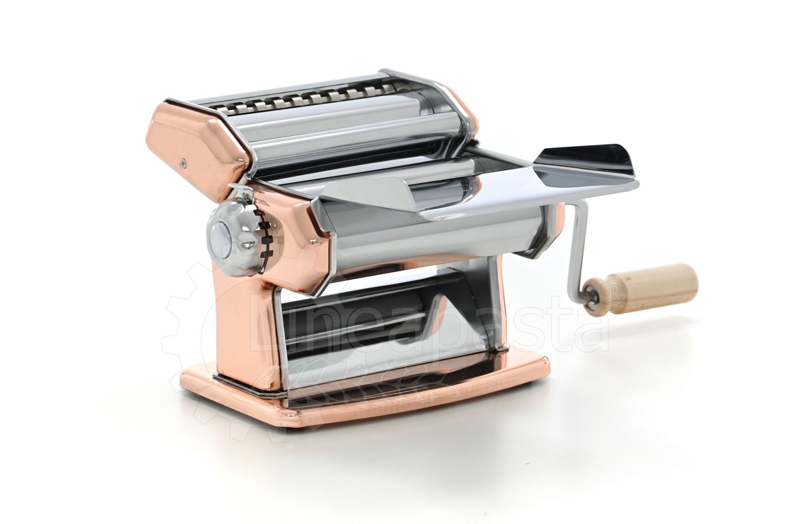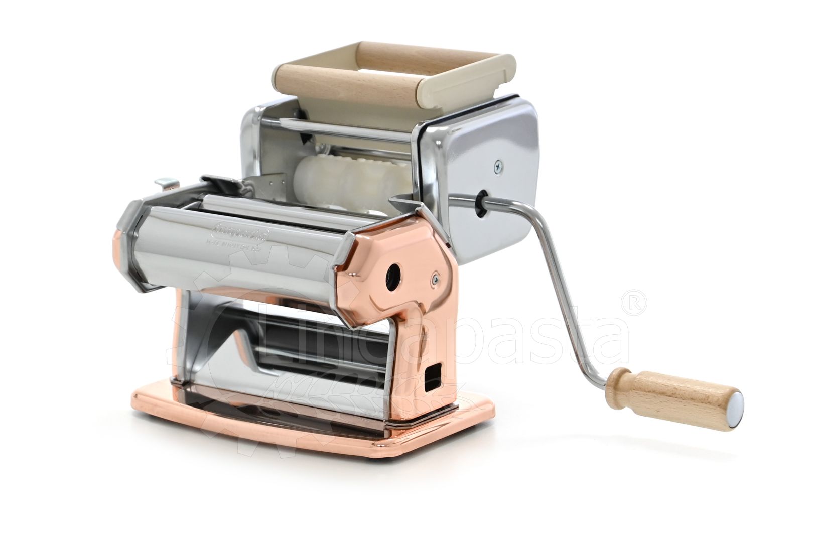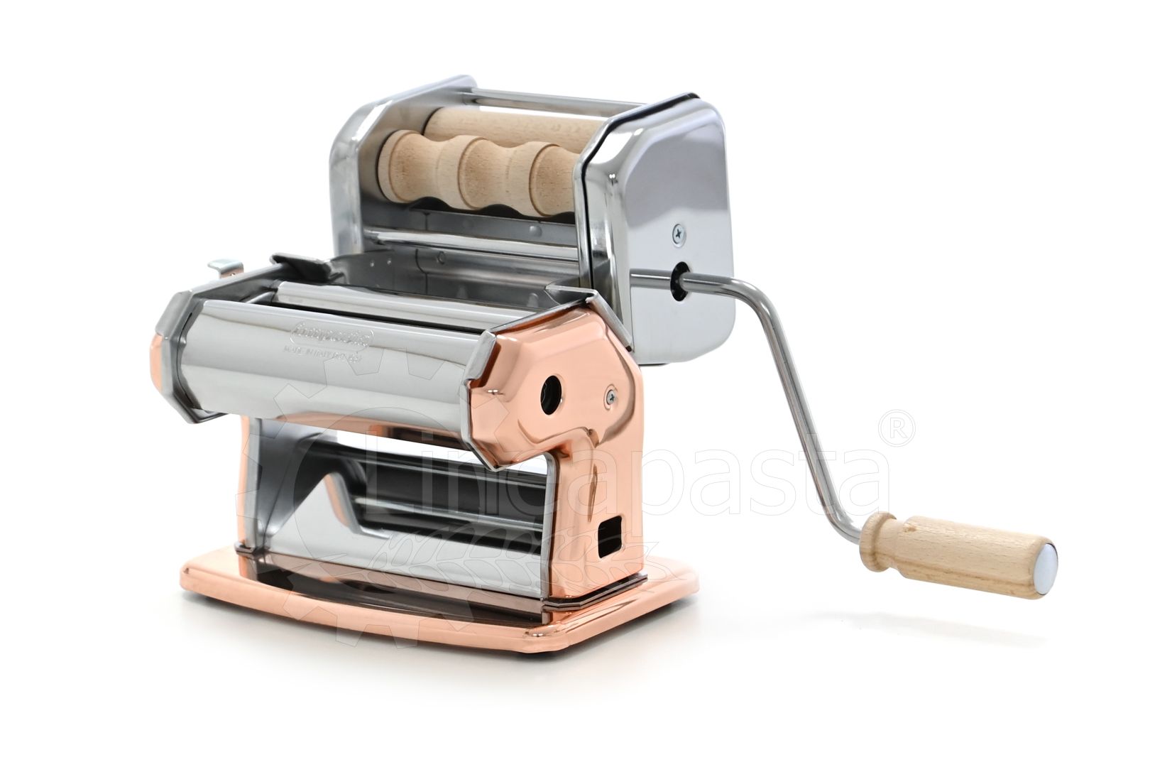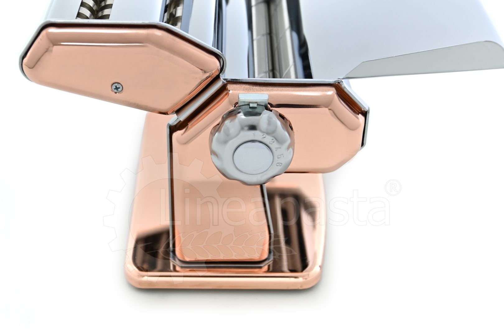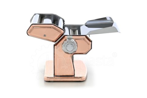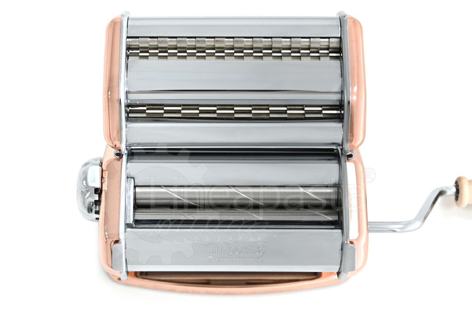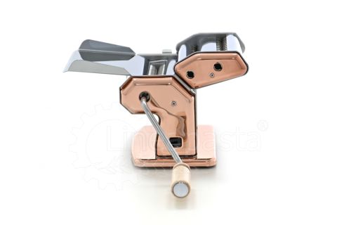 The Imperia iPasta Ruvida Gourmet Copper (Cod. 5142) machine is a pasta sheeter featuring stainless steel rough rollers for the production of a rustic textured sheet, perfect for enhancing the tasty flavour of sauces and gravies. Imperia iPasta Ruvida Gourmet allows you to roll out a 150 mm sheet of pasta up to six different thicknesses and is equipped with a “Duplex” cutter for the production of 6,5 mm Fettuccine and 12 mm Lasagnette. It is possible to prepare an infinite variety of pasta-based first courses such as spaghetti, tagliolini, trenette, pappardelle, ravioli, gnocchetti sardi and many other formats with the appropriate optional accessories (sold separately). This Imperia pasta sheeter is supplied with a work clamp that allows you to anchor the machine to the table and an elegant wooden box to store the machine after use. A hopper, a roller cleaning brush and a protective cotton bag are included with the sheeter. Easy to use and highly versatile, Imperia iPasta Ruvida Gourmet is available in three colors: chromed steel, black and copper.