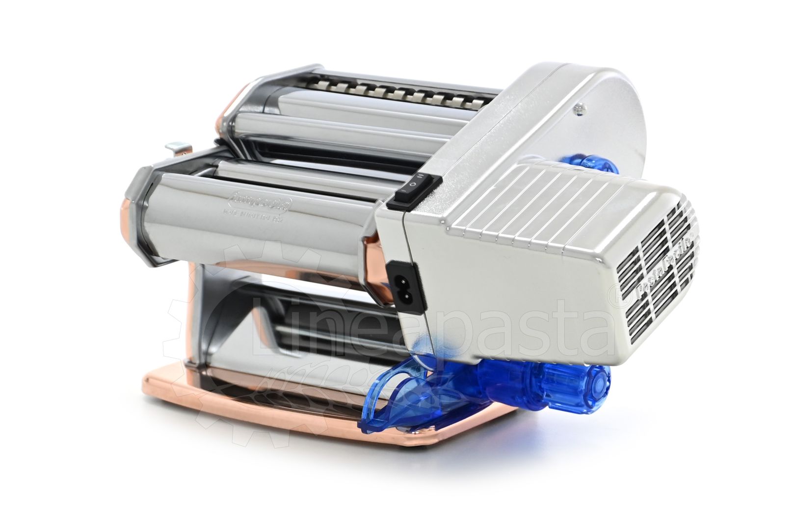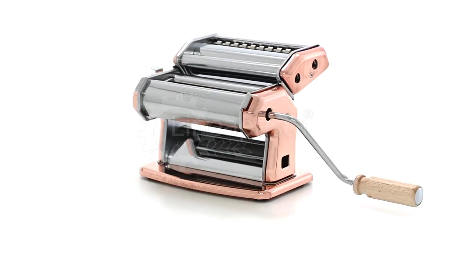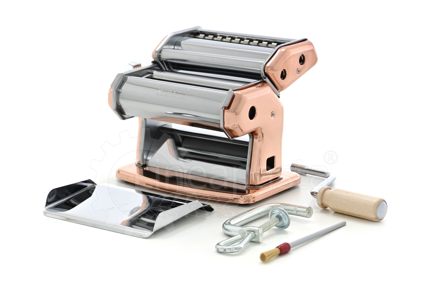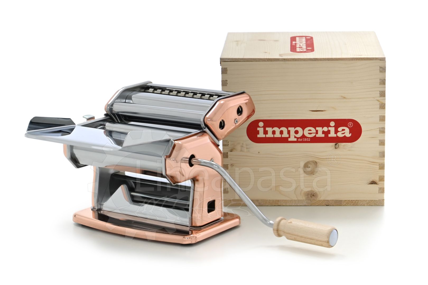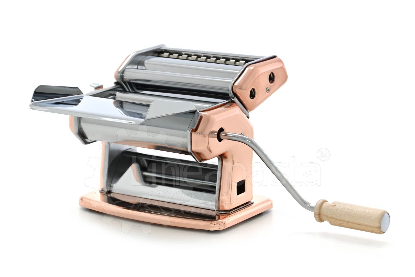 The Imperia iPasta Ruvida Gourmet Copper (Cod. 5142) machine is a pasta sheeter featuring stainless steel rough rollers for the production of a rustic textured sheet, perfect for enhancing the tasty flavour of sauces and gravies. Imperia iPasta Ruvida Gourmet allows you to roll out a 150 mm sheet of pasta up to six different thicknesses and is equipped with a “Duplex” cutter for the production of 6,5 mm Fettuccine and 12 mm Lasagnette. It is possible to prepare an infinite variety of pasta-based first courses such as spaghetti, tagliolini, trenette, pappardelle, ravioli, gnocchetti sardi and many other formats with the appropriate optional accessories (sold separately). This Imperia pasta sheeter is supplied with a work clamp that allows you to anchor the machine to the table and an elegant wooden box to store the machine after use. A hopper, a roller cleaning brush and a protective cotton bag are included with the sheeter. Easy to use and highly versatile, Imperia iPasta Ruvida Gourmet is available in three colors: chromed steel, black and copper.