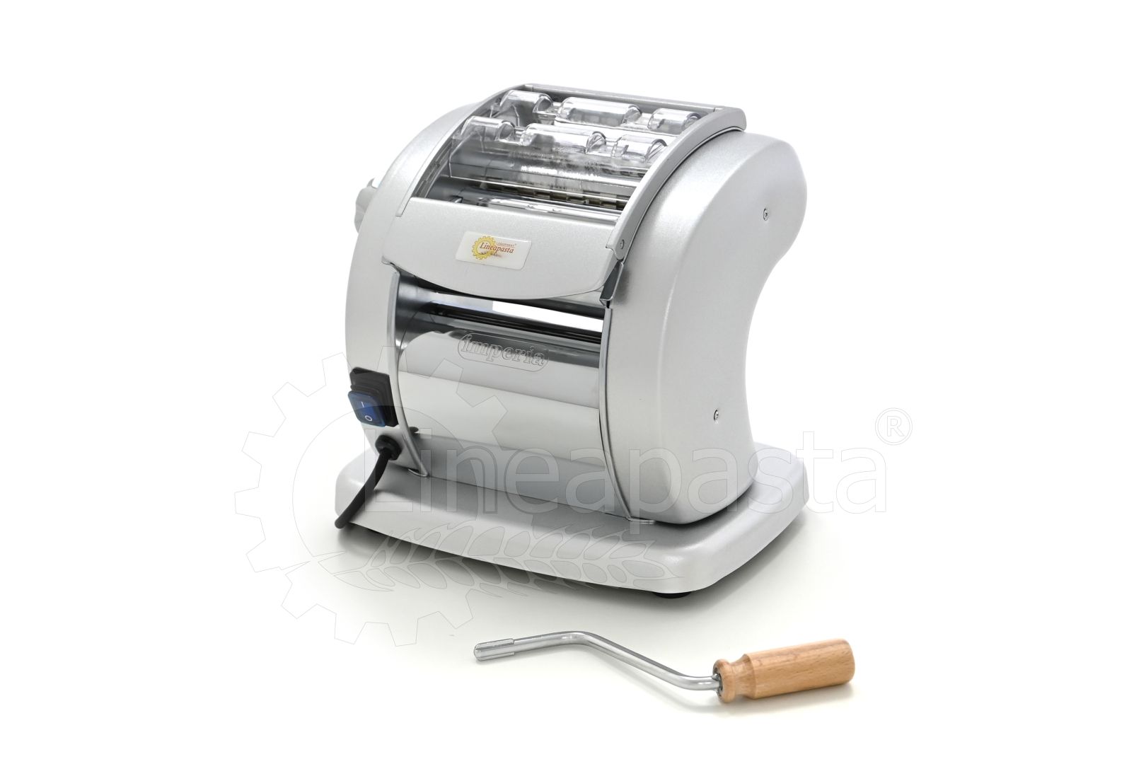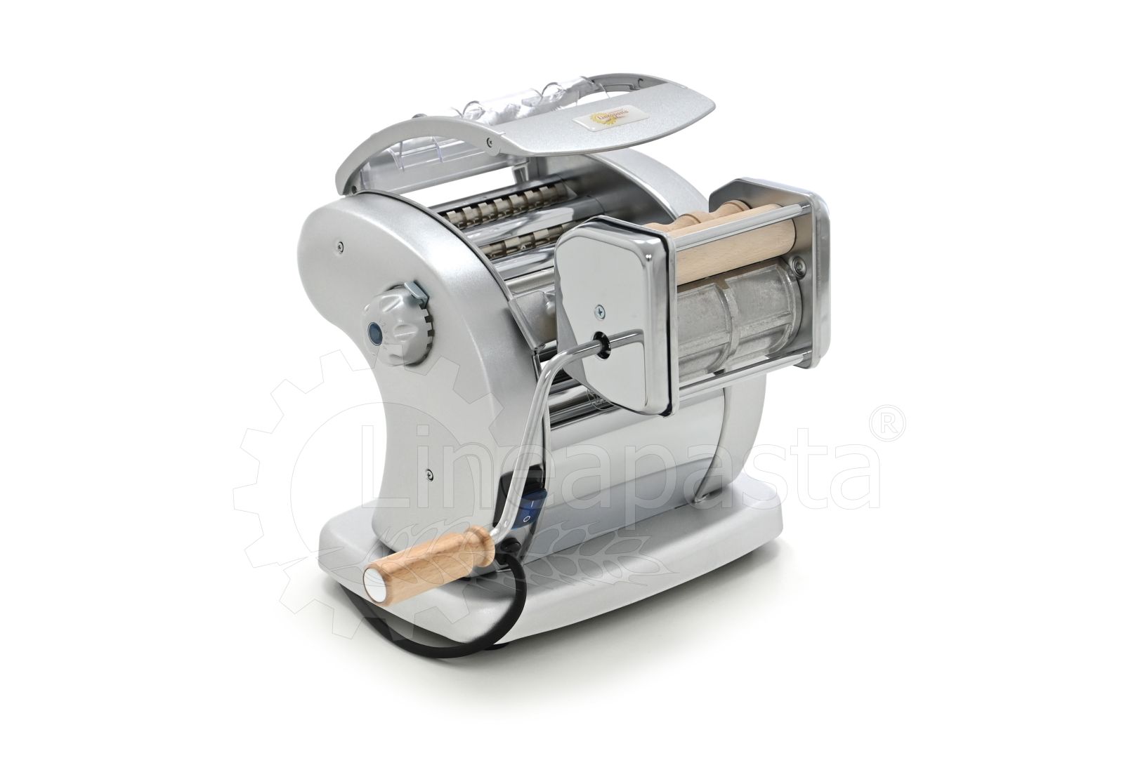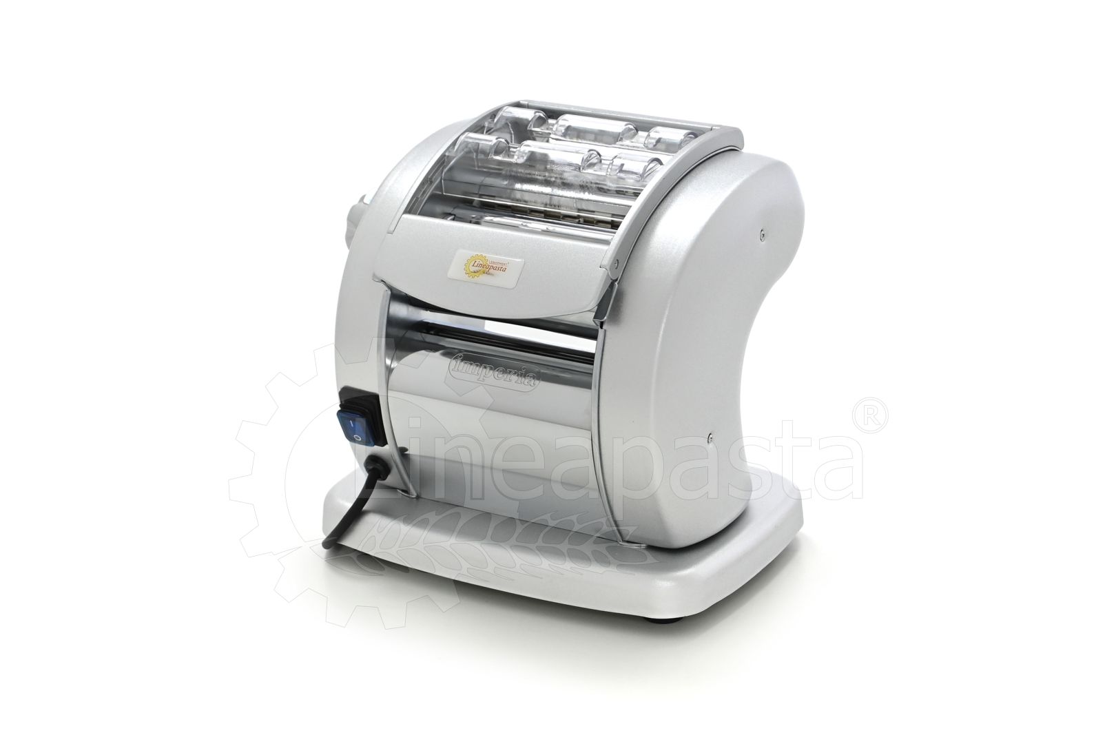 Imperia PastaPresto Gourmet Silver (Cod. 5700 / 5720) is a motorized pasta sheeter suitable for producing homemade pasta, it is characterized by 150 mm rough rollers that give the pasta sheet a rustic texture perfect for enhancing the flavor of sauces and gravies. The machine is equipped with an electric motor, which allows you to make the pasta sheet in six different thicknesses and two types of pasta: Lasagnette 12 mm and Fettuccine 6,5 mm. Imperia PastaPresto Gourmet is available in two color variants: silver and anthracite gray.