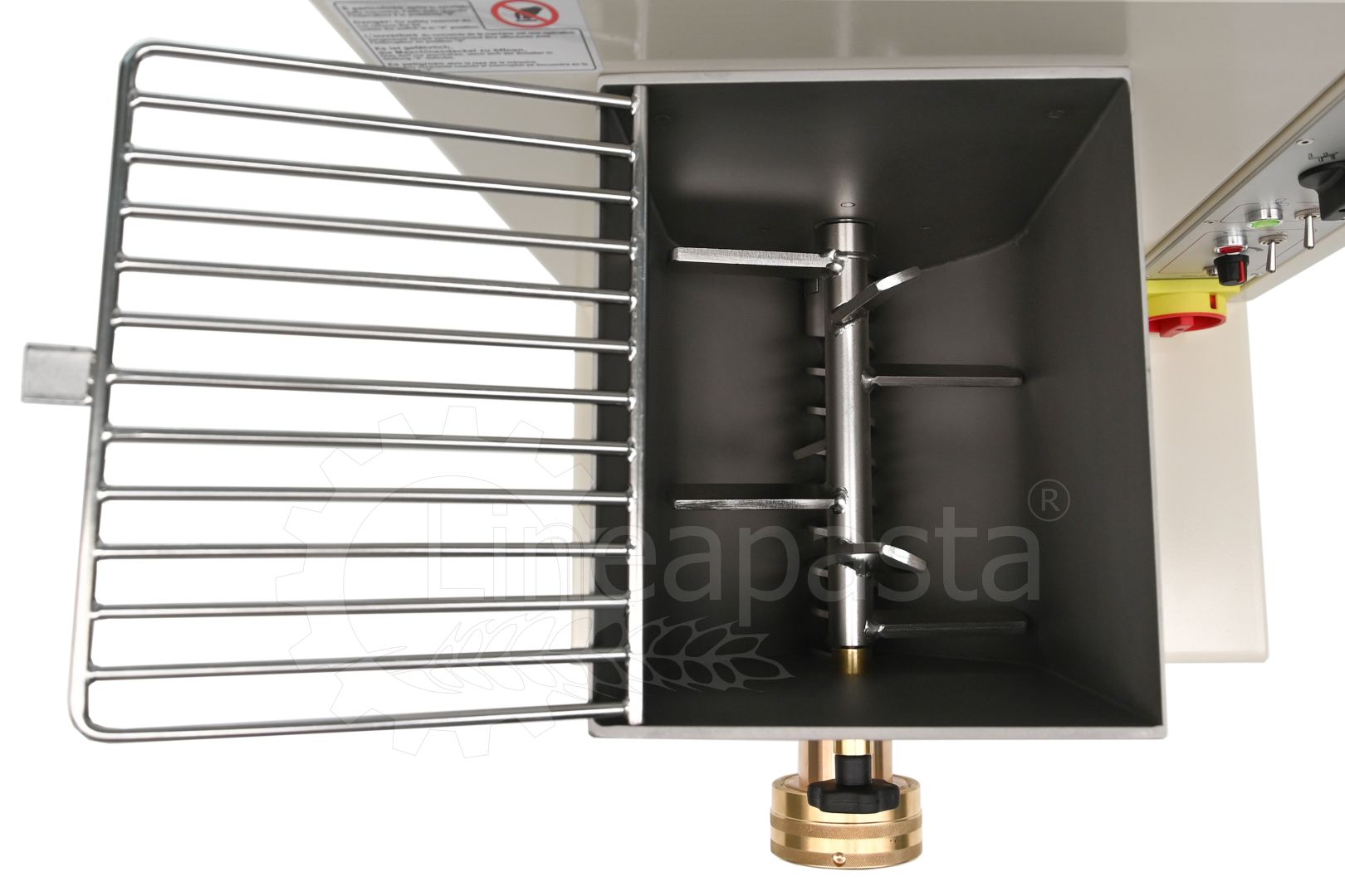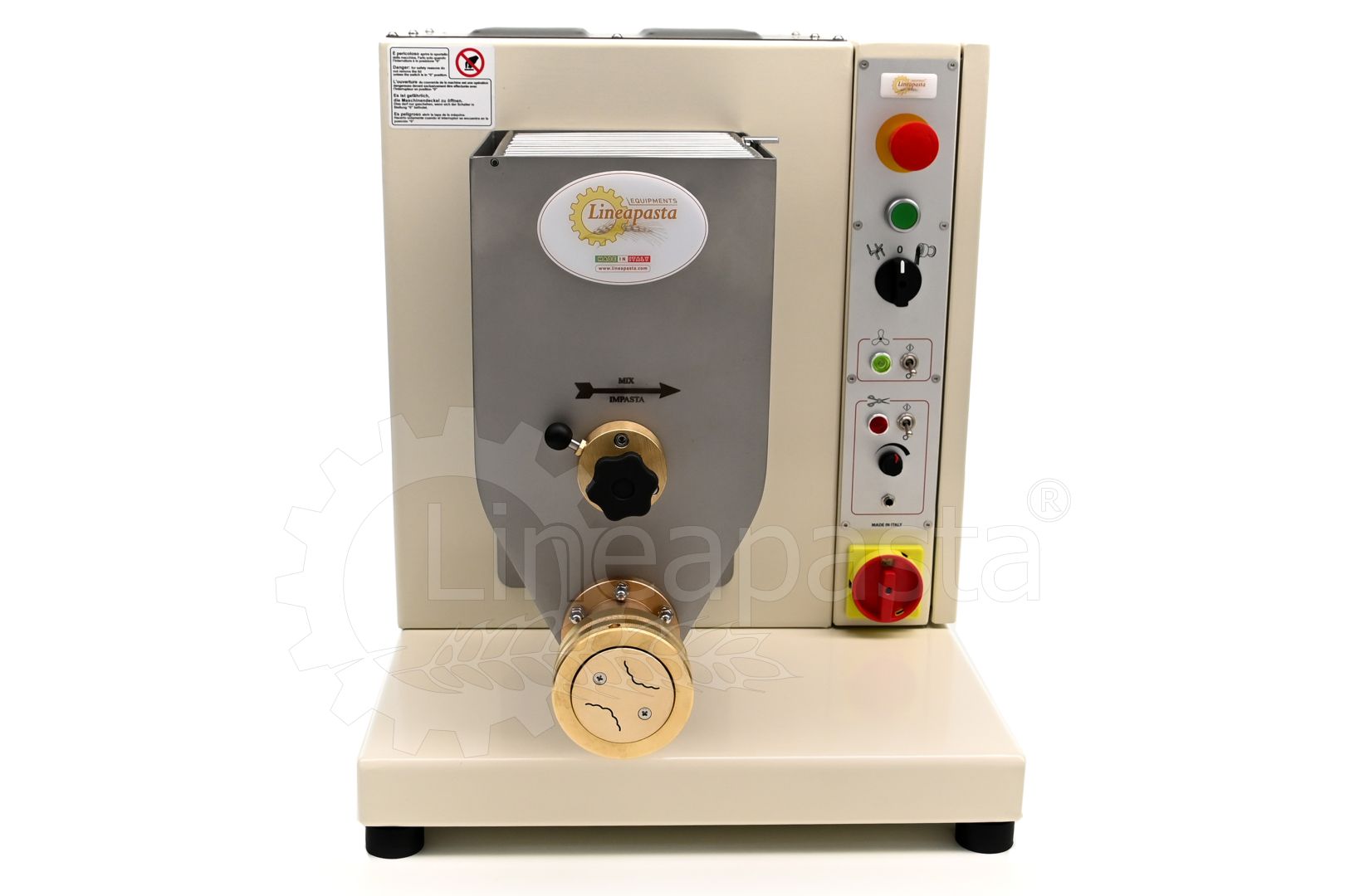 Bottene Inver 7 is a robust and easy-to-use pasta machine that can produce many types of fresh short and long pasta, using any type of flour: from soft wheat to re-milled semolina, from wholemeal flour to gluten-free flours, etc. It is also possible to add different ingredients to the dough to make it colorful (for example red with tomato, green with spinach, brown with cocoa, etc.). The machine includes 4 standard brass-bronze dies and it is also possible to add the electronic knife for cutting most short formats, so production will be much simpler and faster. It is also possible to combine the Inver 7 with the BE90 electric ravioli maker to produce different types of ravioli depending on the molds chosen (round, rectangular, square, etc.). The machine is built with high-quality materials and comes complete with all the safety devices required by current regulations. The kneading shaft and the auger are easily removable to facilitate cleaning of the machine.