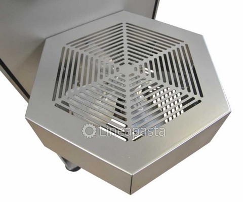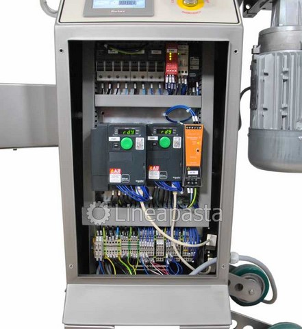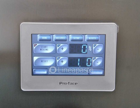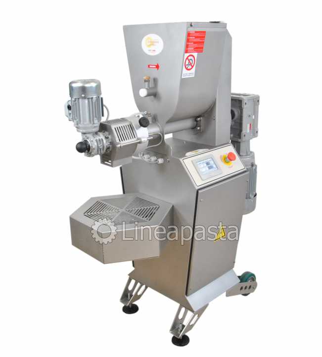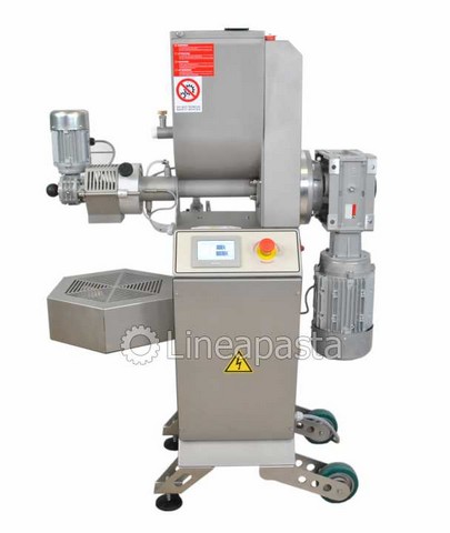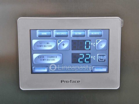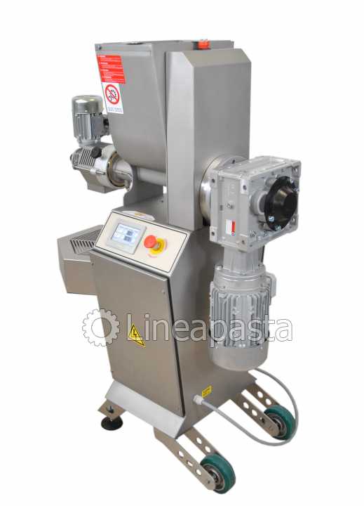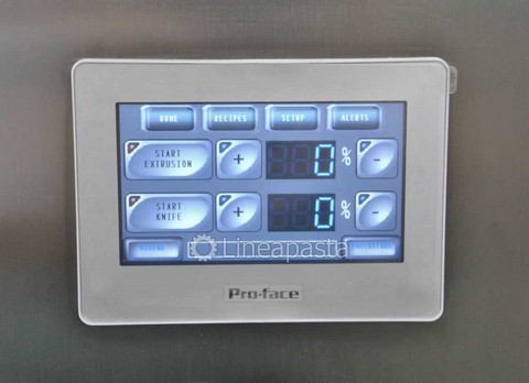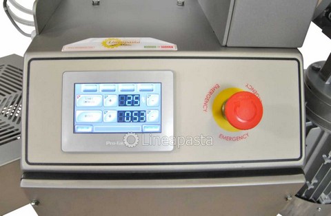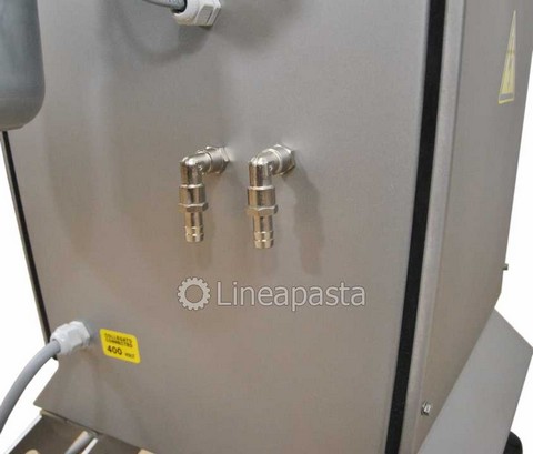 The PS 20 fresh pasta machine is a pasta machine suitable for restaurants and small pasta factories. Entirely made of stainless steel for easy cleaning and mounted on swivel wheels and locking feet. It is equipped with a fan for a first drying of the pasta. It is also possible to extrude for many consecutive hours without having to stop to let the extrusion cylinder cool, thanks to the water cooling system. The PS 20 press is a professional pasta machine with a production of 10 Kg/h suitable for producing any size of fresh short pasta, long pasta and adjustable pastry. The pasta machine is complete with an automatic knife for an easier production of short pasta. It is also equipped with a digital touch screen control panel. The machine is equipped with a touch screen control system with the ability to load and customize recipes according to your production needs, customizing the extrusion speed, the knife speed and the temperature of the extrusion cylinder.