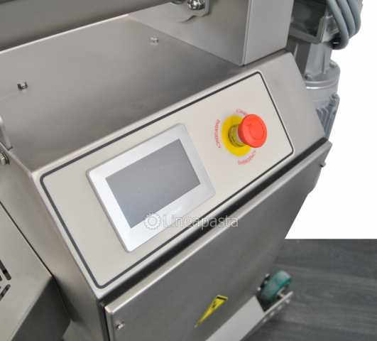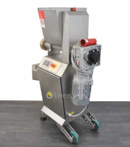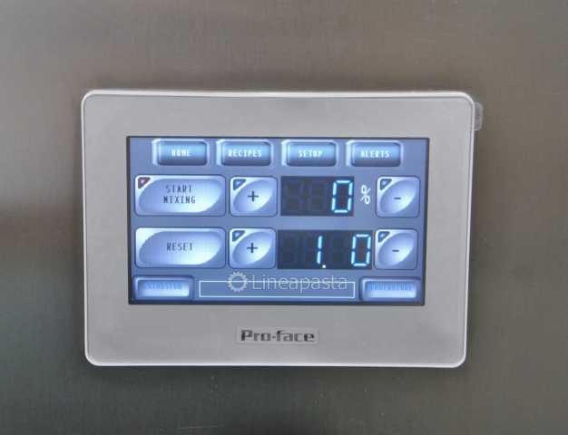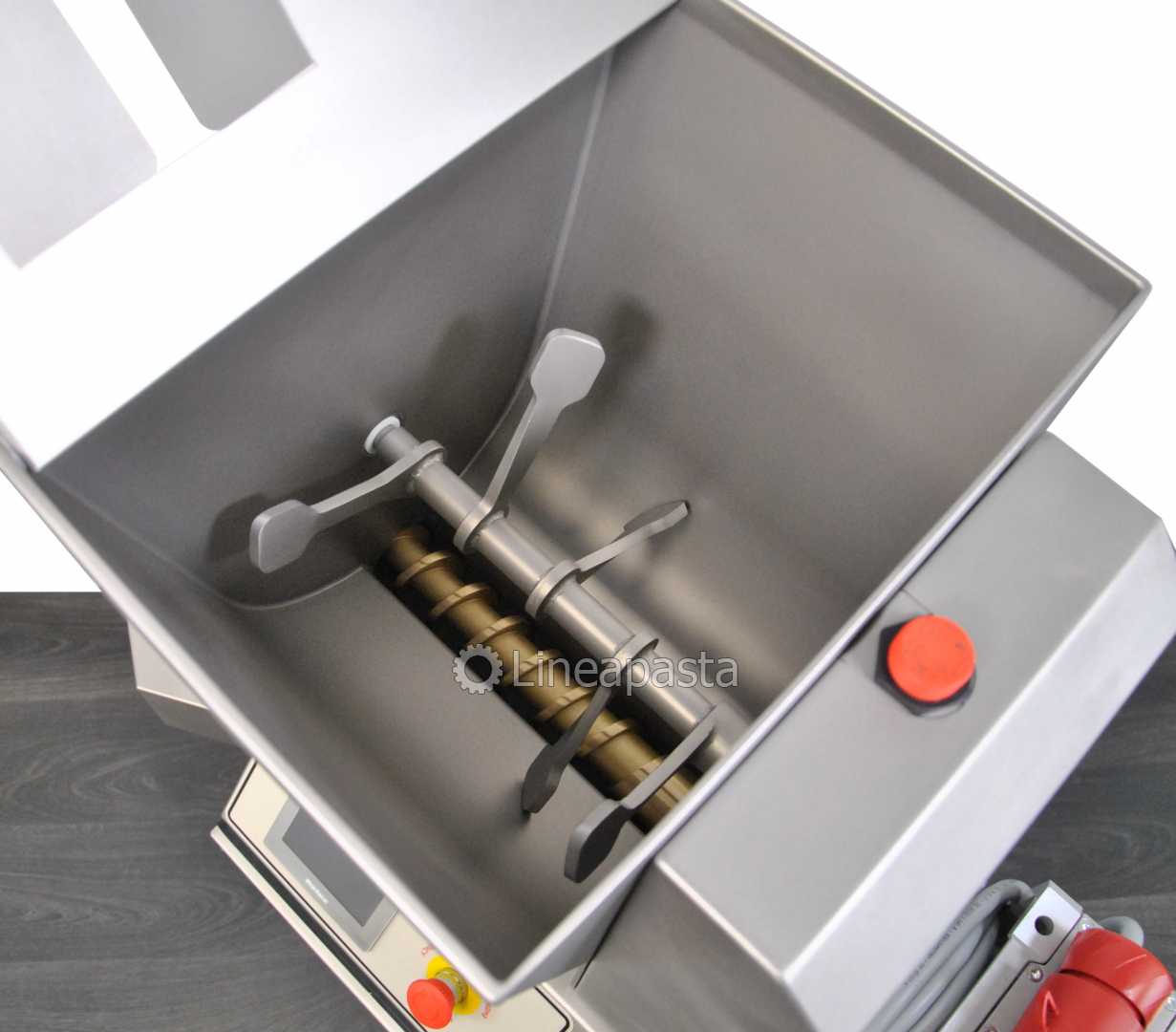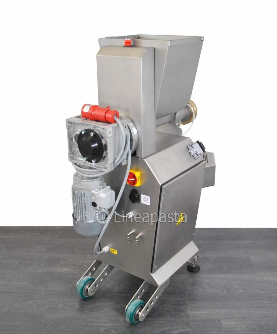 The PS 40 fresh pasta machine is a professional machine for semi-industrial production entirely made of Aisi 304 stainless steel and it is mounted on wheels and locking feet. It is complete with an electronic adjustable speed knife for the production of short pasta, and equipped with a fan for a first drying of the extruded pasta. The PS 40 pasta machine has a vat with a capacity of 10 kg and an extrusion speed is 20 kg/h and thanks to the water cooling system it is possible to produce for many hours in a row without waiting for the extrusion cylinder to cool down, as it keeps the temperature low. The machine is equipped with a touch screen control system with the ability to load and customize recipes according to your production needs, customizing the extrusion speed, the knife speed and the temperature of the extrusion cylinder.
