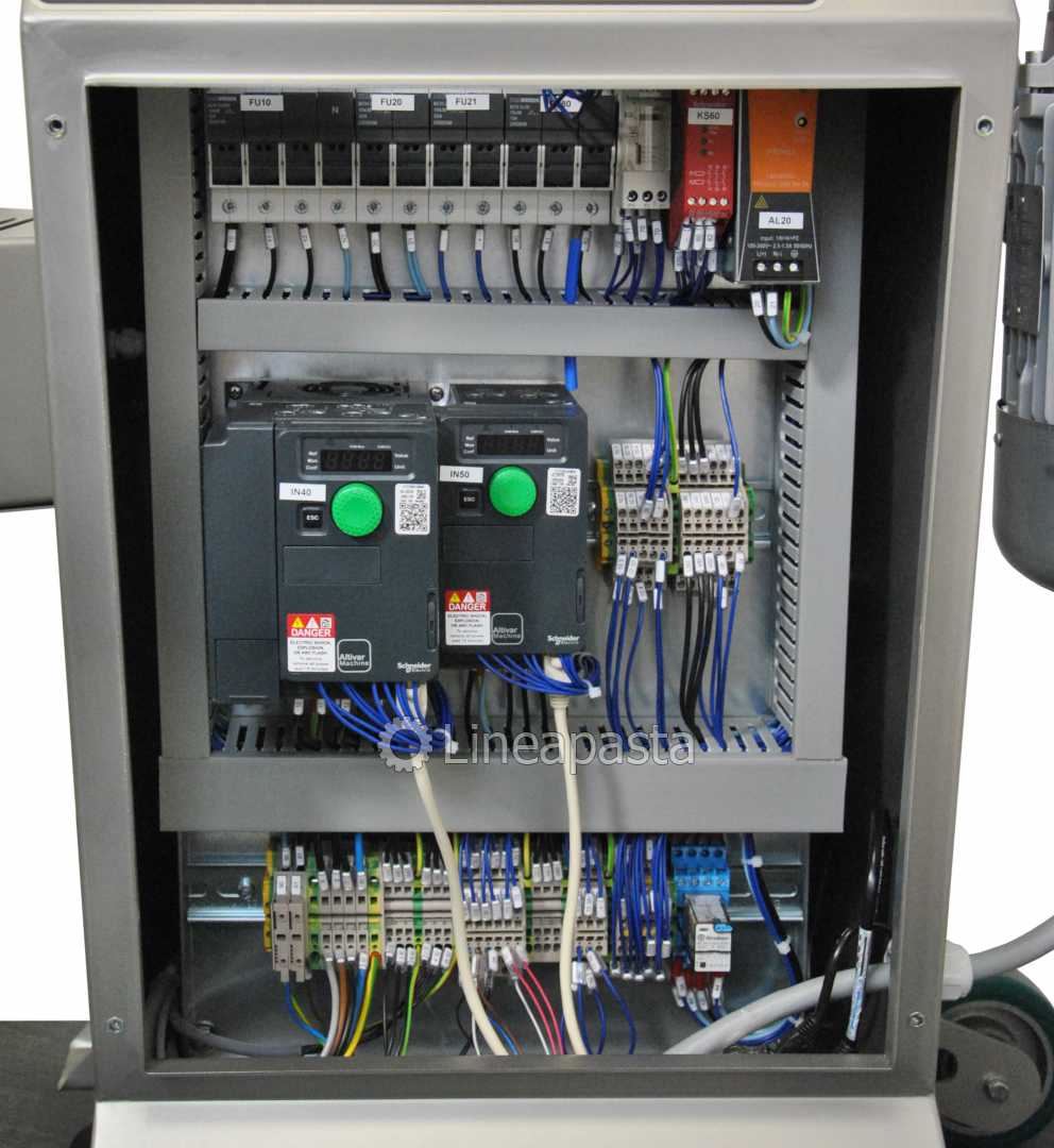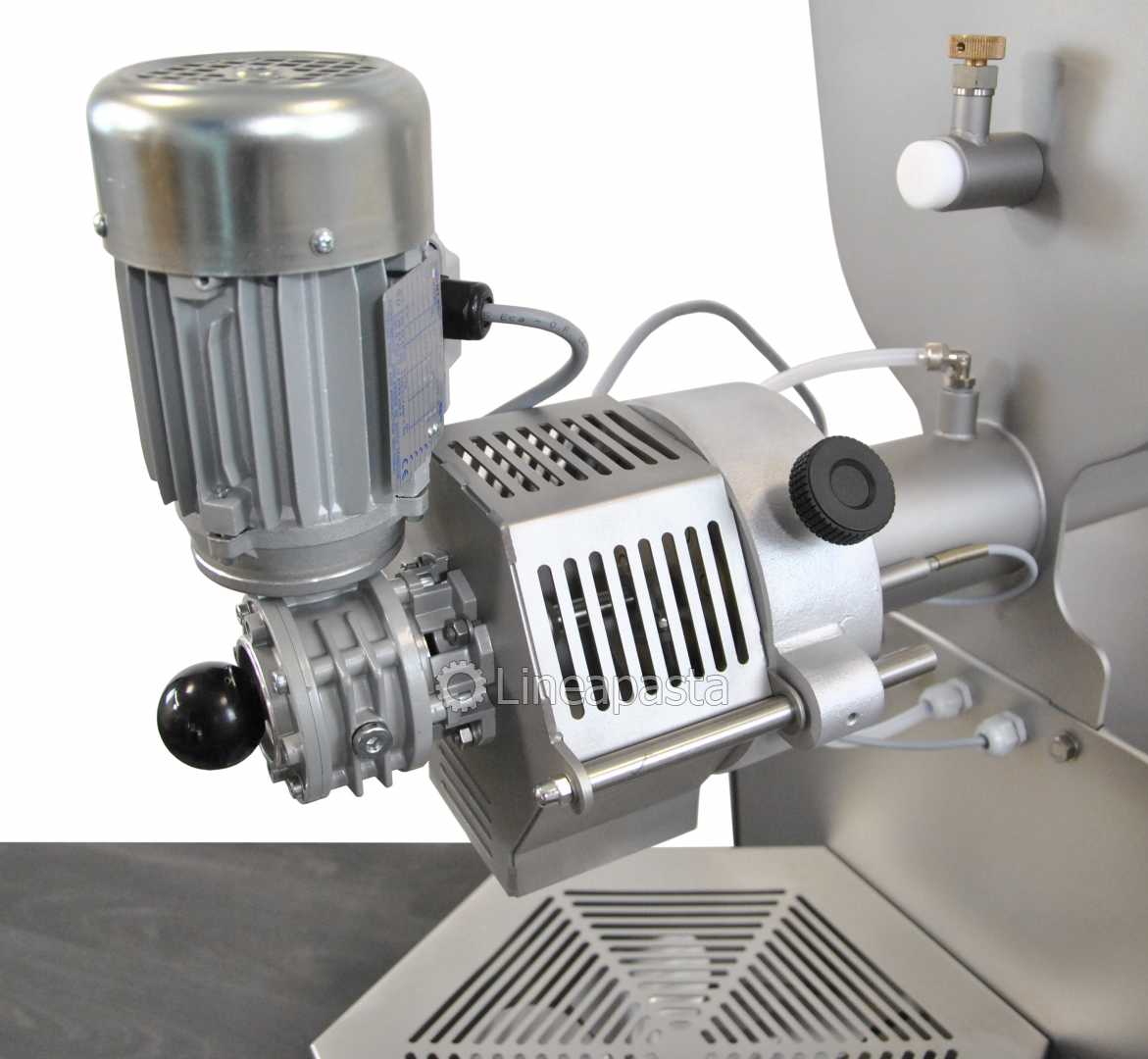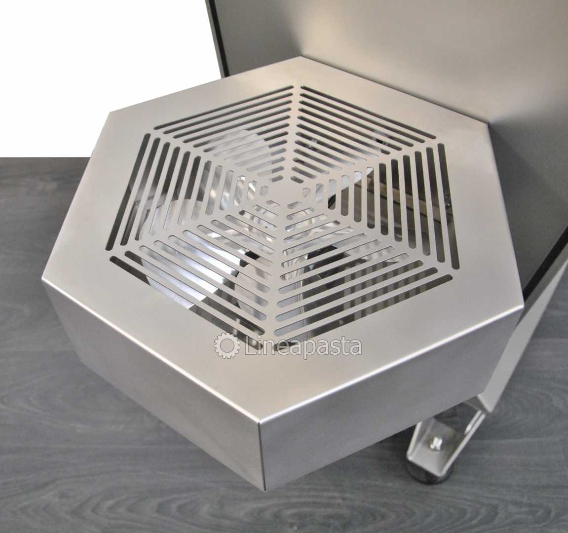 The PS 40 fresh pasta machine is a professional machine for semi-industrial production entirely made of Aisi 304 stainless steel and it is mounted on wheels and locking feet. It is complete with an electronic adjustable speed knife for the production of short pasta, and equipped with a fan for a first drying of the extruded pasta. The PS 40 pasta machine has a vat with a capacity of 10 kg and an extrusion speed is 20 kg/h and thanks to the water cooling system it is possible to produce for many hours in a row without waiting for the extrusion cylinder to cool down, as it keeps the temperature low. The machine is equipped with a touch screen control system with the ability to load and customize recipes according to your production needs, customizing the extrusion speed, the knife speed and the temperature of the extrusion cylinder.