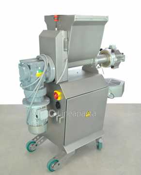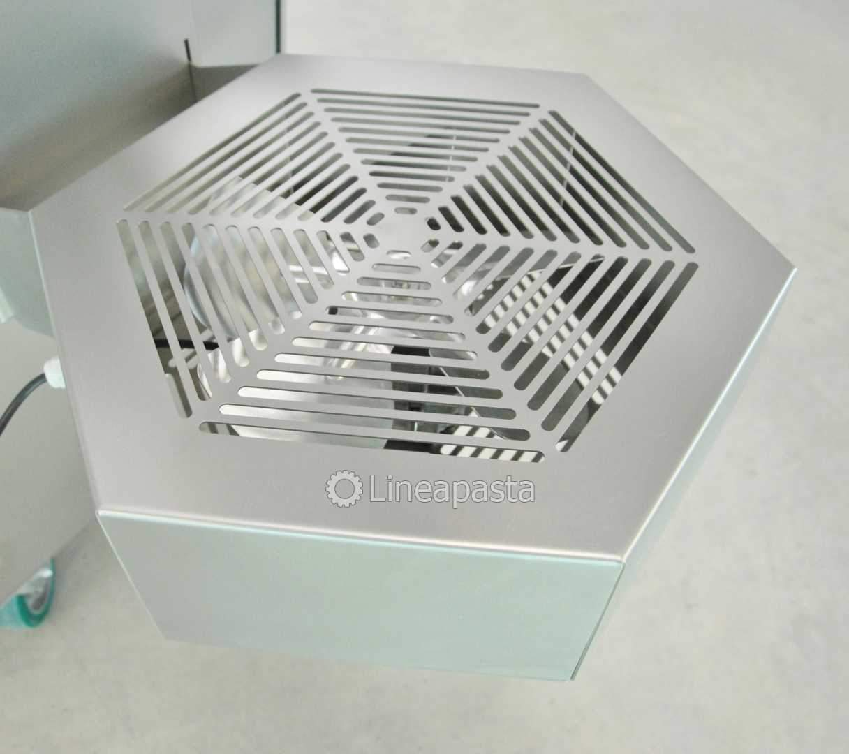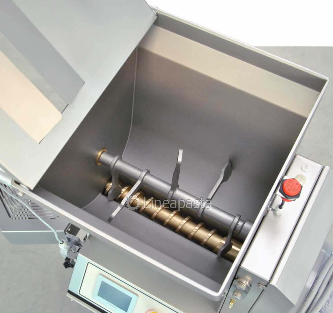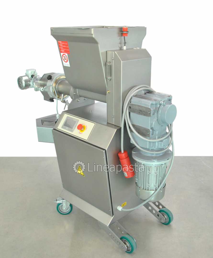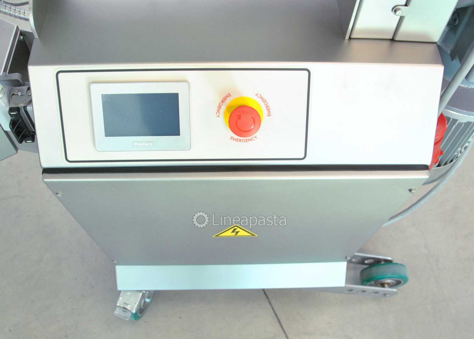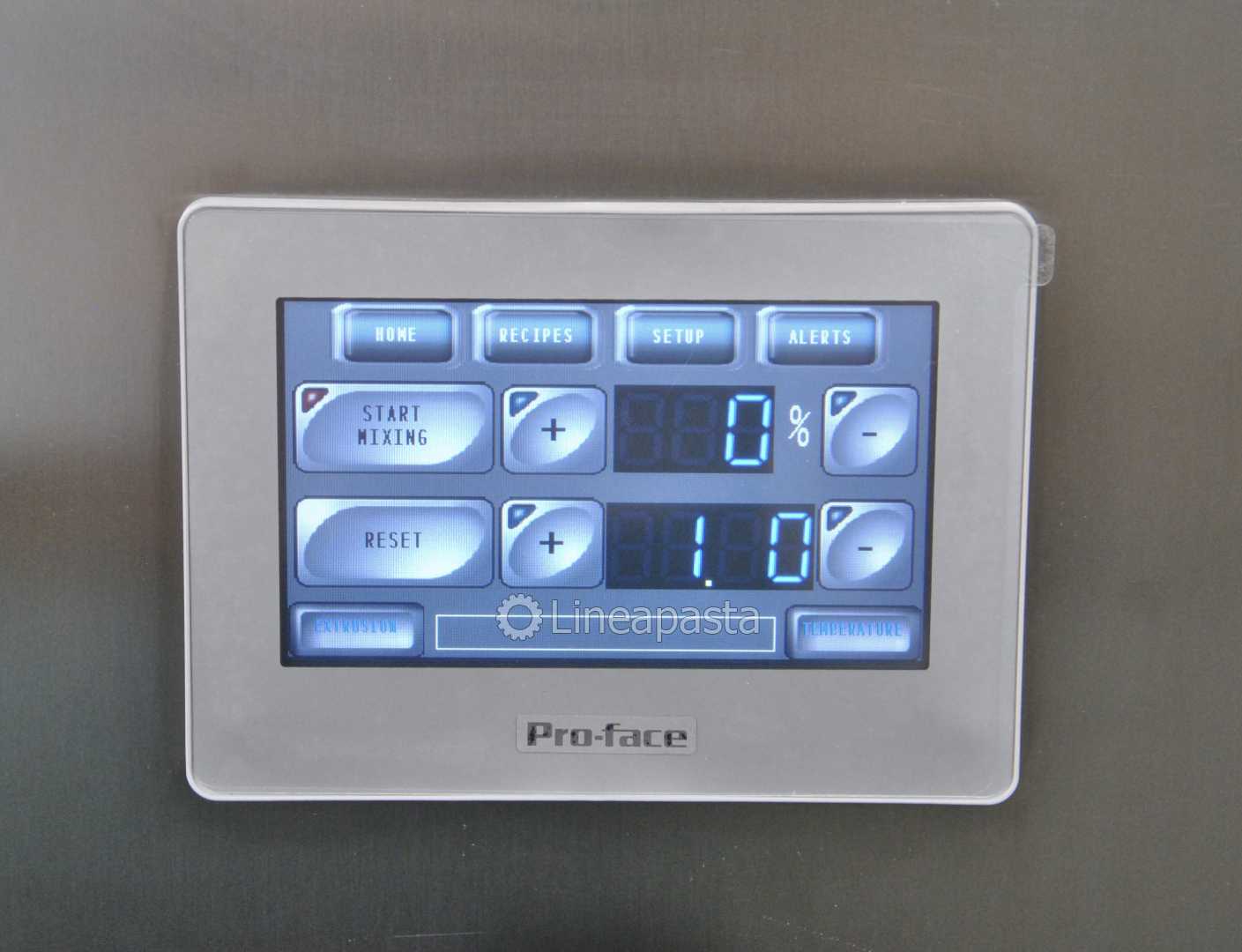 The PS 60 pasta machine is a fresh pasta machine ideal for industrial production built entirely in Aisi 304 stainless steel and mounted on swivel wheels, which allows easy repositionings. It is equipped with a kneading vat with a capacity of 15 kg, and produces 30 kg/h. The electronic timed rotary knife with variable speed allows easy production of short pasta. The PS 60 press is complete with a water cooling system that allows you to produce for many consecutive hours, without stopping the machine and wait for the extrusion cylinder to cool and it is also equipped with a fan for the first drying of the pasta. The machine is equipped with a touch screen control system with the ability to load and customize recipes according to your production needs, customizing the extrusion speed, the knife speed and the temperature of the extrusion cylinder.