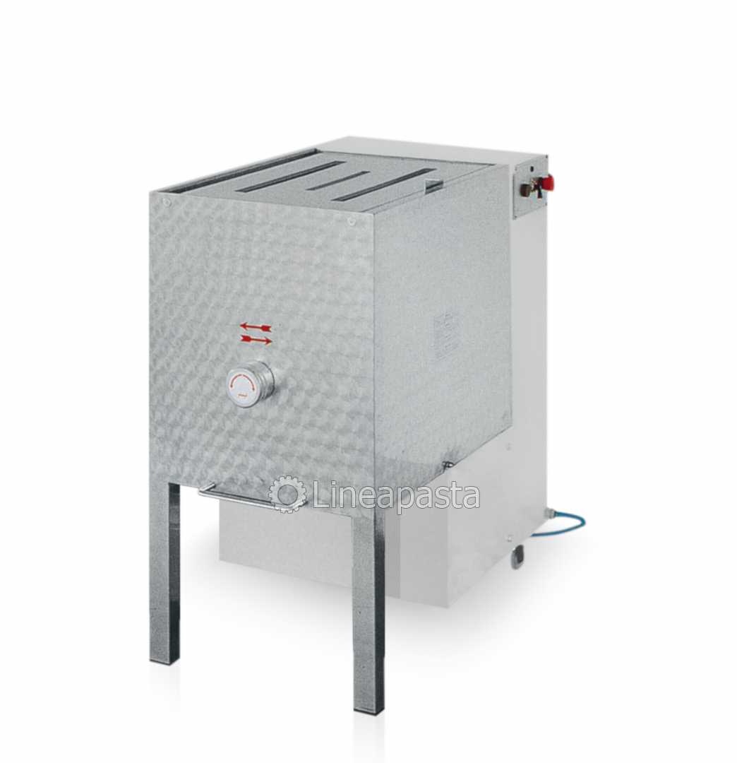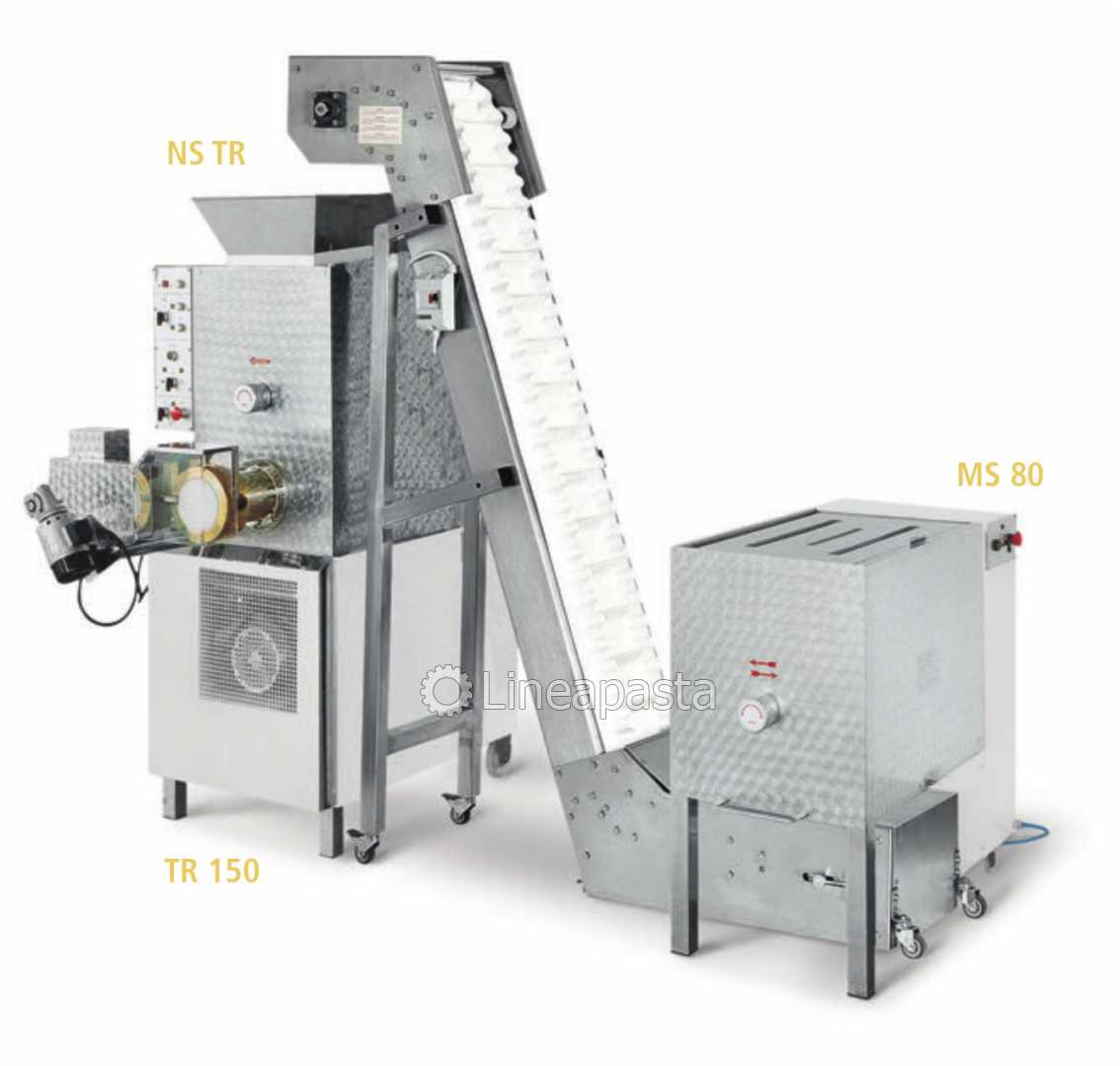 TR 150 includes: a electronic cutter for short cut pasta and a timer knife for long cut pasta; a water cooling system to keep the temperature of the extrusion cylinder constant, allowing production for several consecutive hours; a support with a built-in fan for initial surface drying of the freshly extruded pasta; a hopper to facilitate and speed up the loading of ingredients and a perforated pasta tray.