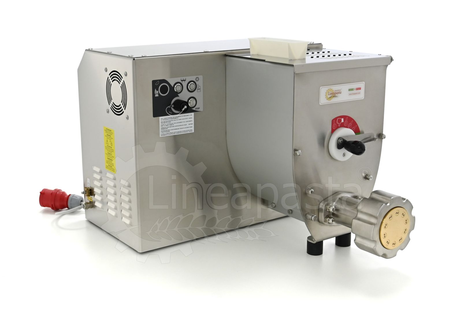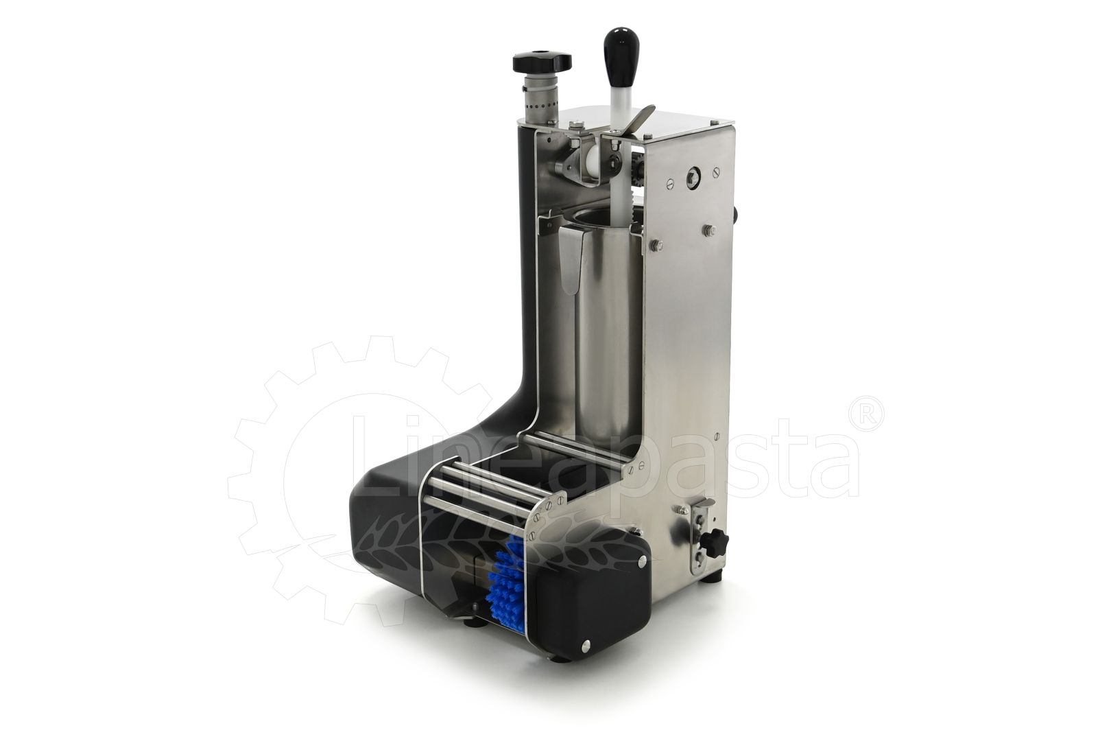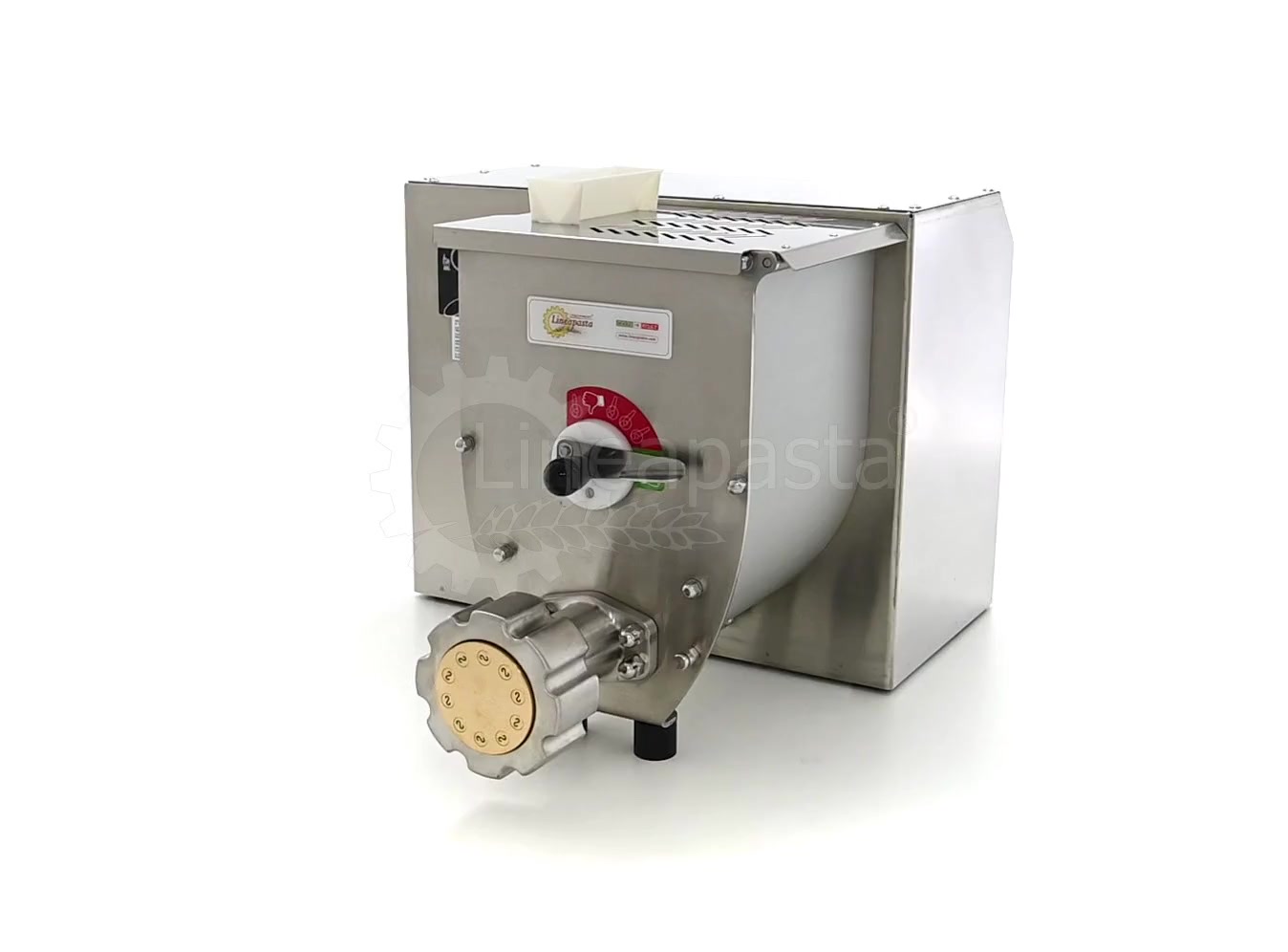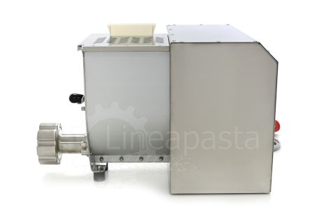 Orchestra Ciaopasta 10 countertop fresh pasta machine is a professional countertop machine ideal for restaurants, laboratories and canteens. This machine is the countertop version of the Orchestra Ciaopasta 10 and it extrudes doughs made with any type of flour, with or without eggs, gluten free and special flours. It offers the possibility of choosing from a wide range of brass-bronze dies available from the catalogue. The mixing vat can hold up to 10 kg of dough (liquids and flours) and it is equipped with an interlocked lid and a removable hopper to pour liquids in uniformly and with extreme ease. The machine is equipped with a ventilated motor with gear reduction in oil bath and a timed forced ventilation system that starts working even when the motor is off. This model allows you to mount an electronic pasta cutter for short pasta with speed variator. The Orchestra Ciaopasta 10 countertop machine is built according to national and international accident prevention standards and is designed to allow quick and easy cleaning since all parts in contact with the dough are made of stainless steel.