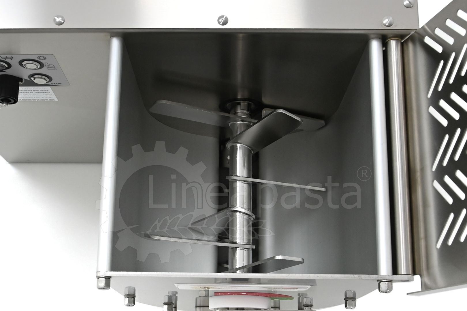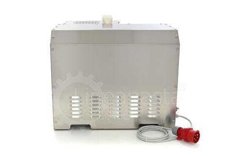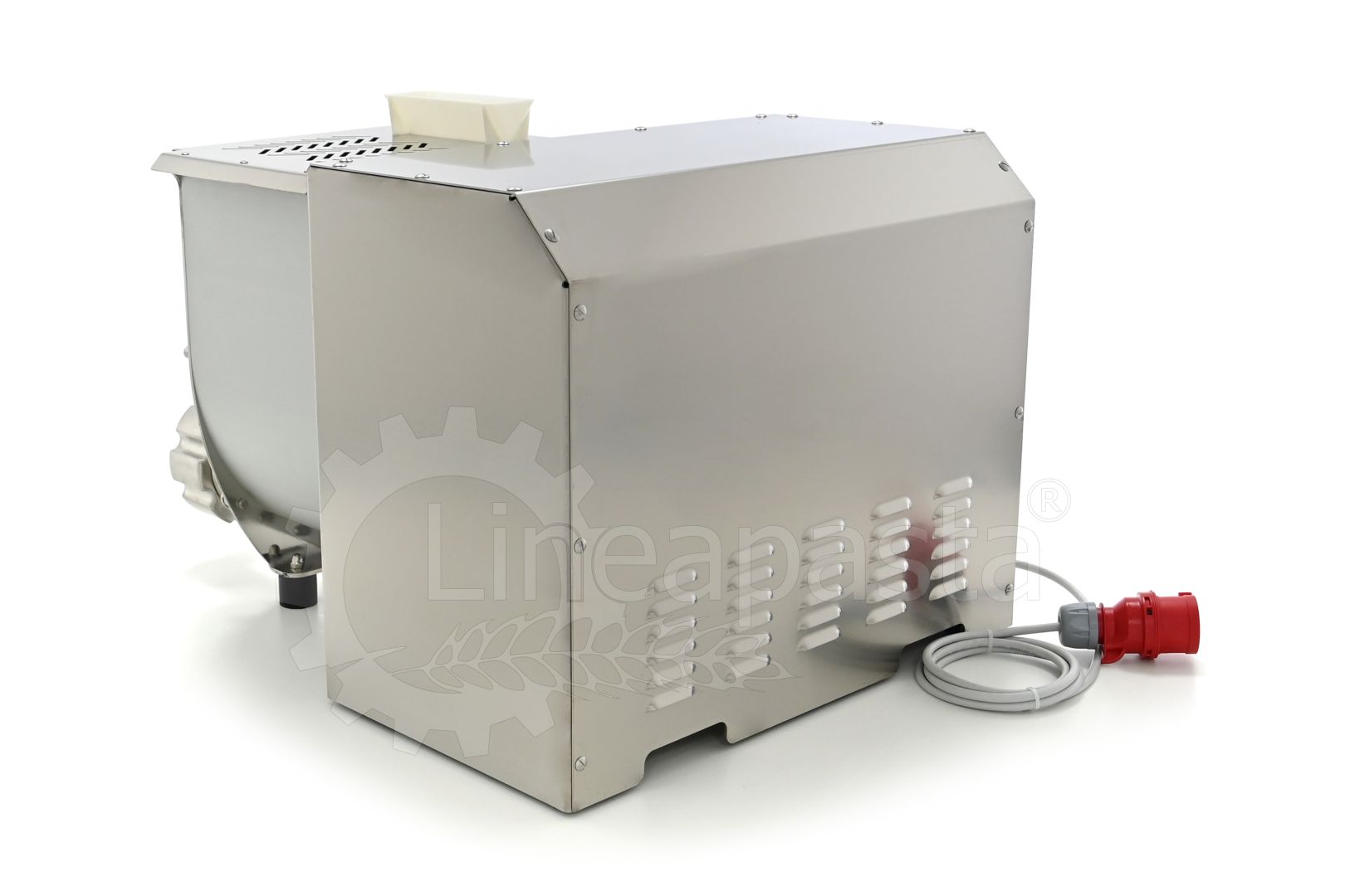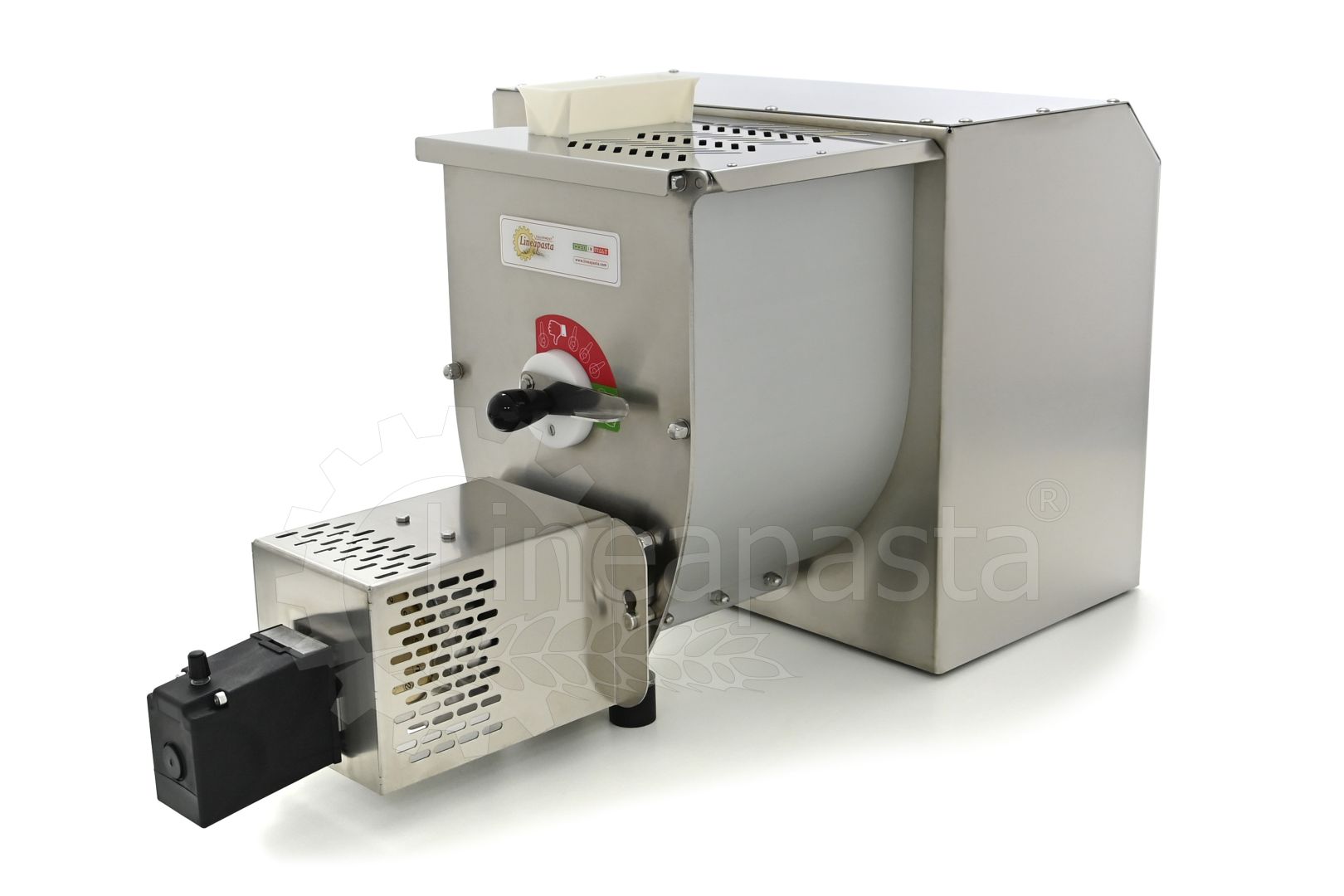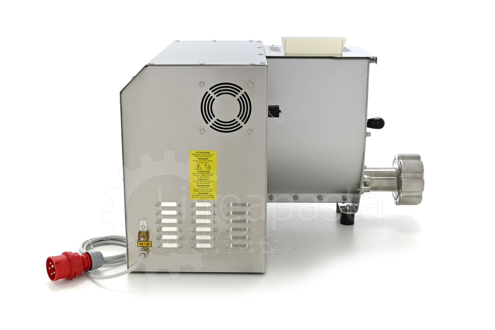 Orchestra Ciaopasta 10 countertop fresh pasta machine is a professional countertop machine ideal for restaurants, laboratories and canteens. This machine is the countertop version of the Orchestra Ciaopasta 10 and it extrudes doughs made with any type of flour, with or without eggs, gluten free and special flours. It offers the possibility of choosing from a wide range of brass-bronze dies available from the catalogue. The mixing vat can hold up to 10 kg of dough (liquids and flours) and it is equipped with an interlocked lid and a removable hopper to pour liquids in uniformly and with extreme ease. The machine is equipped with a ventilated motor with gear reduction in oil bath and a timed forced ventilation system that starts working even when the motor is off. This model allows you to mount an electronic pasta cutter for short pasta with speed variator. The Orchestra Ciaopasta 10 countertop machine is built according to national and international accident prevention standards and is designed to allow quick and easy cleaning since all parts in contact with the dough are made of stainless steel.