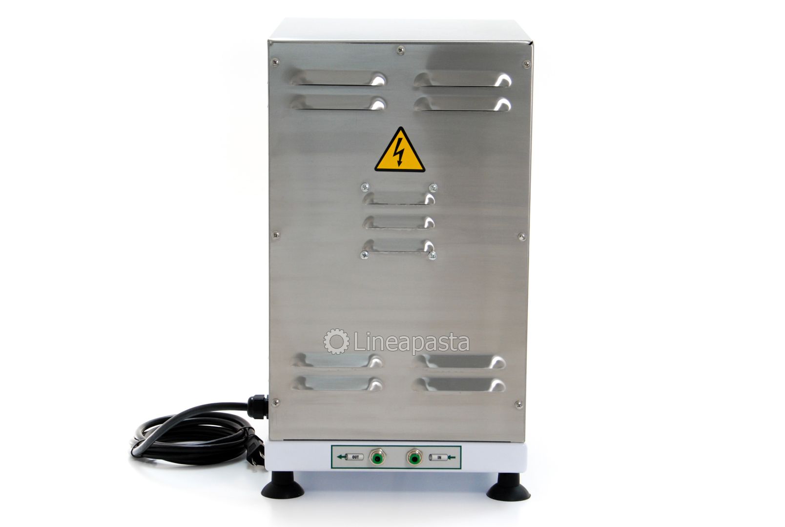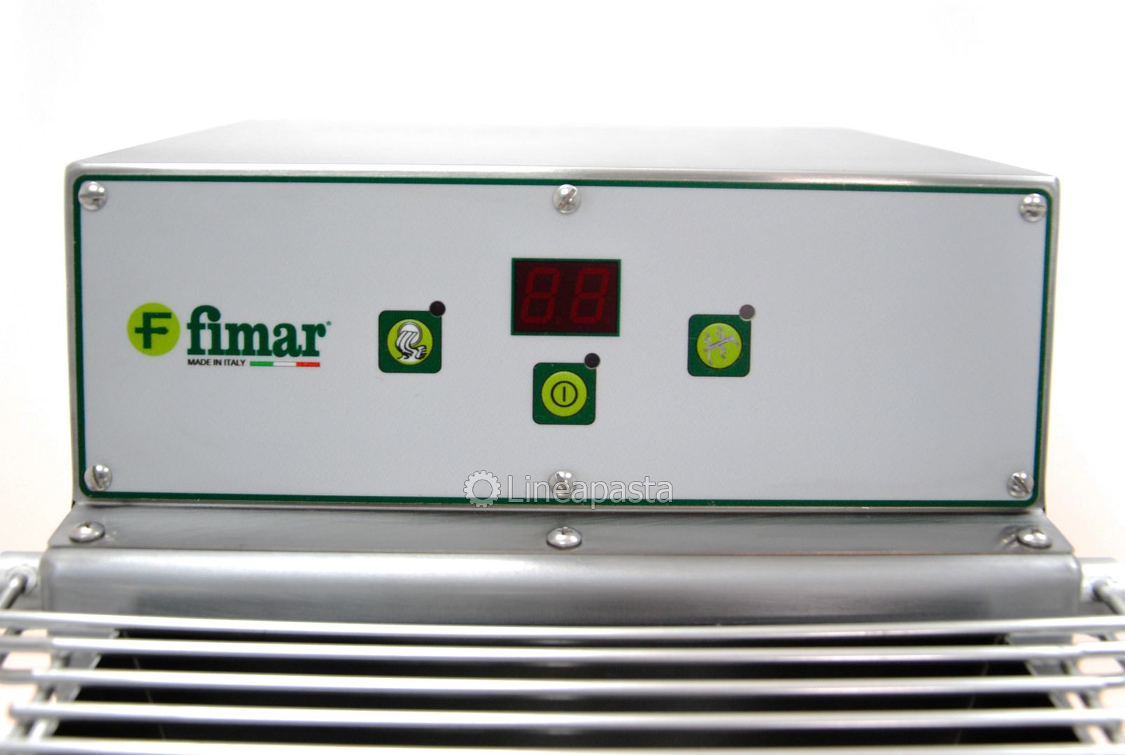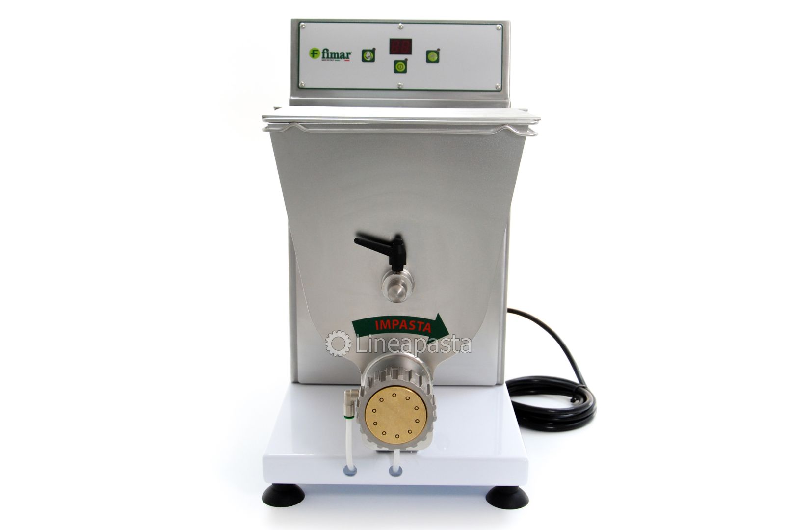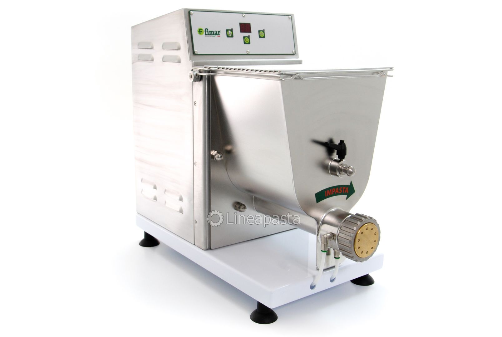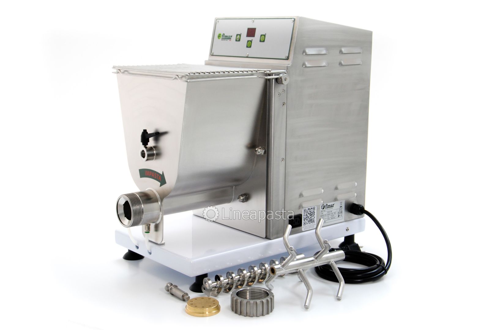 Fimar Lilly PF40E is a machine suitable for kneading and extruding dough with and without eggs in different formats, it is complete with an electronic cutter for short cut pasta and water cooling system of the extrusion cylinder: the cooling system allows both to keep constant the temperature of the cylinder during the extrusion (thus avoiding overheating of the die which could lead to the "cooking" of the output pasta), and of producing for several consecutive hours without having to stop the machine to let it cool down.