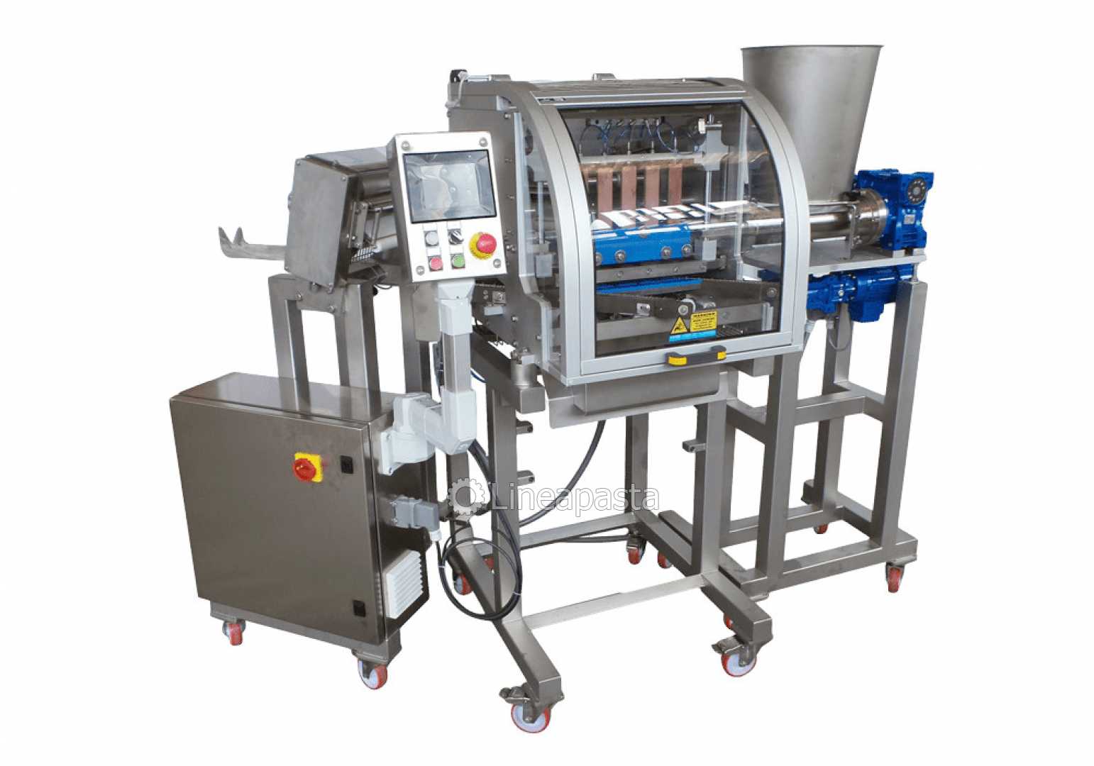The FK 250 is an automatic forming machine designed for the production of tortellini, tortelloni, cappelletti and cappellacci. The particular automatism of the tortellinatrice is able to reproduce exactly the closing of the tortellino as that carried out by the "sfogline emiliane". Easy to use, can be sanitized quickly. Thanks to an innovative solution, it allows to obtain a greater workable surface, equal to 93% of the dough. The machine can also be easily integrated into a medium-sized production system. All parts in contact with the dough and the filling are made of stainless steel or non-toxic materials, suitable for food use.