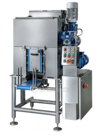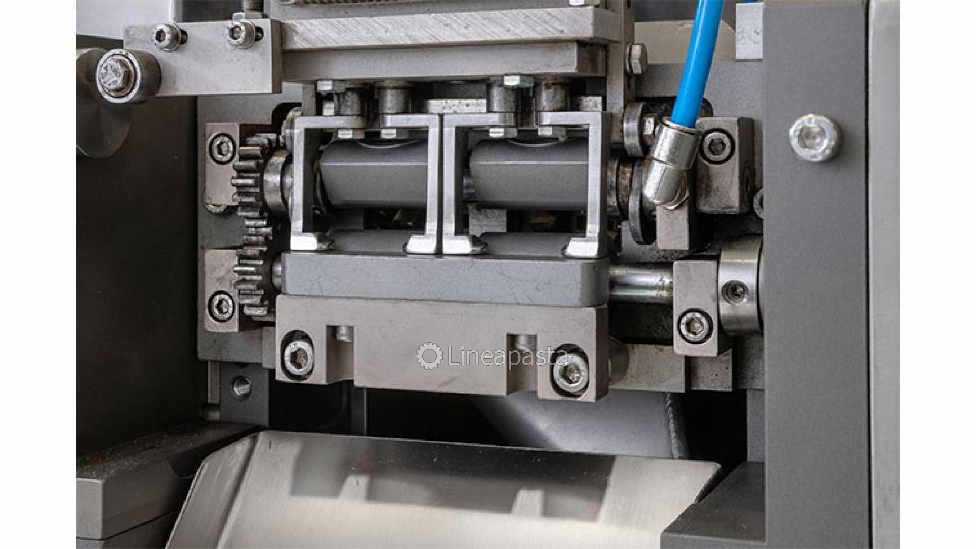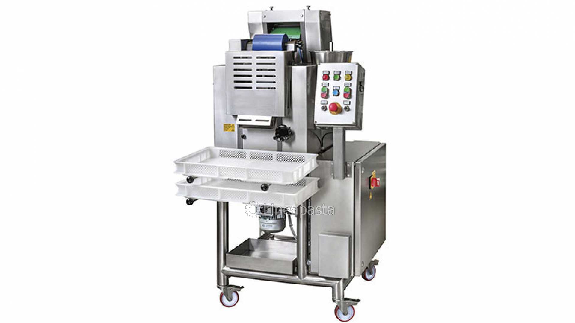 The machine for cappelletti, ravioli and tortelloni DN160 is a machine for the production of single-sheet filled pasta such as cappelletti, tortelloni and "pelmeni" with meat and lean fillings like ricotta, cheese, pumpkin, etc. It is equipped with an interchangeable mold system to allow the production of different formats and the replacement of the mold in an easy and fast way. The filled pasta is fed by a 160mm sheet. The DN160 is designed for adjusting the quantity of the filling according to the format with continuous and automatic feeding of the filling. The various functions, such as the feeding of the dough, the speed of the machine and the regularity of the filling are controlled by independent variable speed motors. The DN160 ravioli machine offers a new design with a round tubular base and ergonomic protections designed to facilitate the sanitization of the machine. The machine is equipped with wheels to facilitate movement.