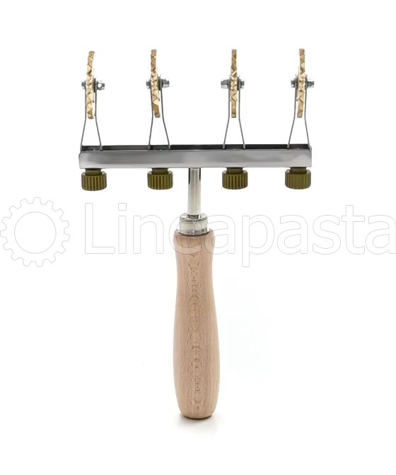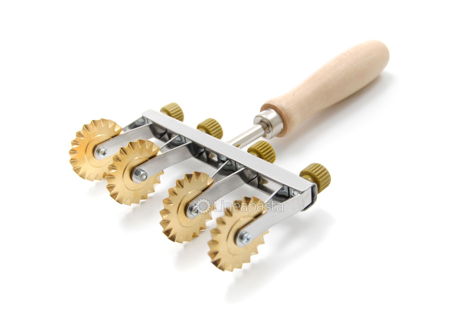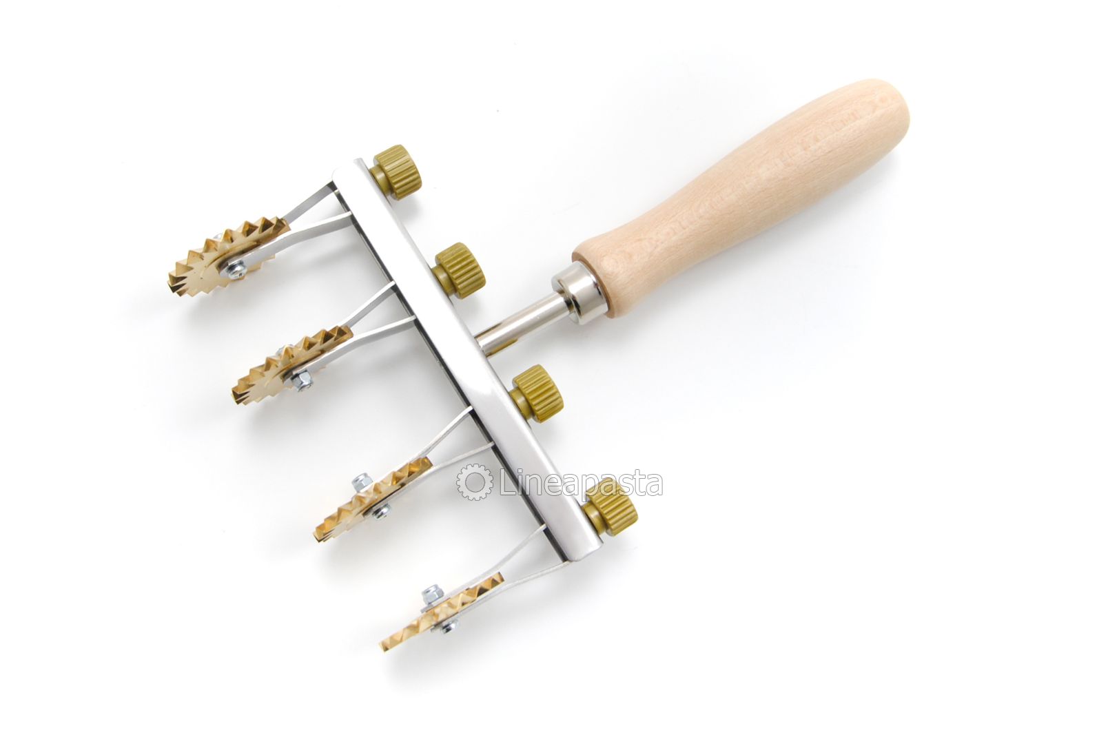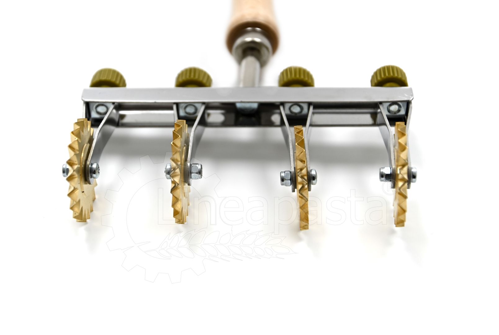 Multi-wheel pasta cutter consisting of four 38 mm diameter toothed brass blades, a steel structure and a handy wooden handle. The 4 brass toothed blades are adjustable from 22 to 116 mm, ideal for making tortelloni, tortellini and ravioli. The pasta cutter allows a precise and clean cut of the dough, is suitable for both home and professional use.
