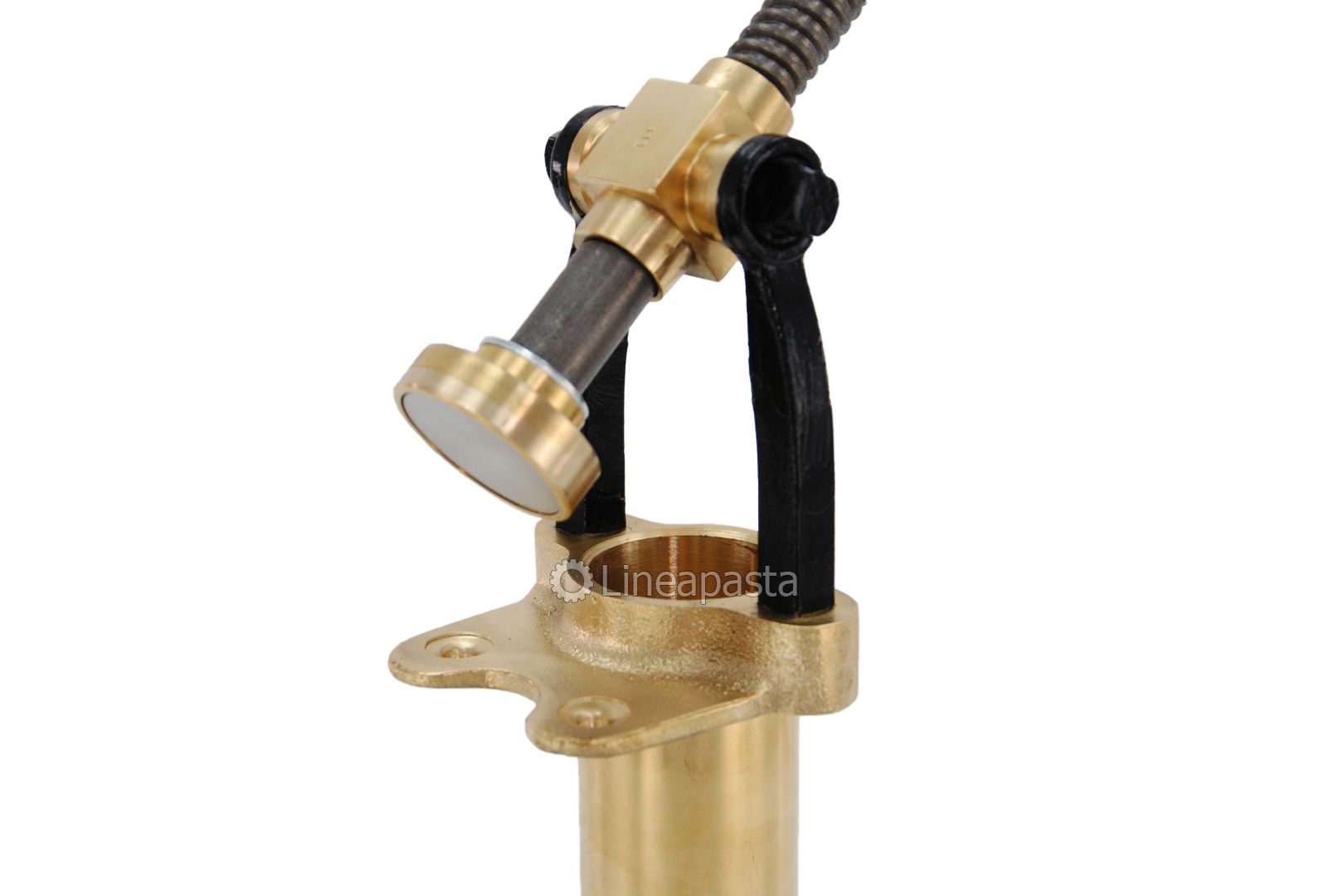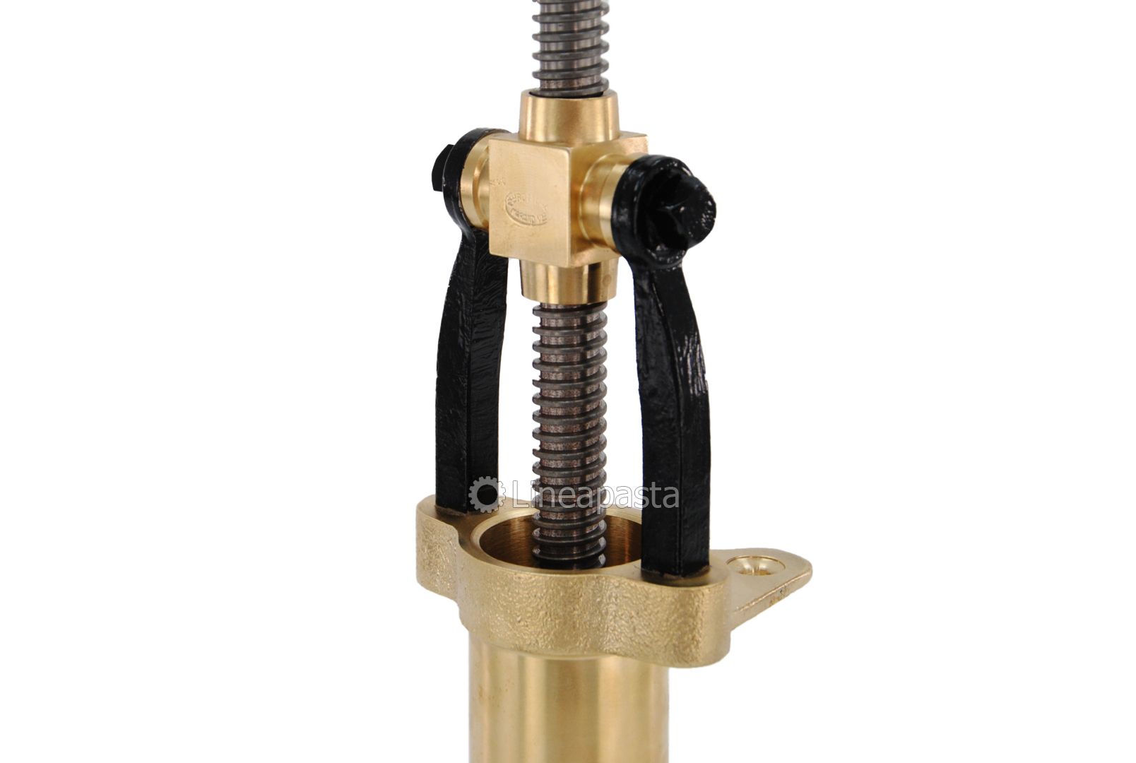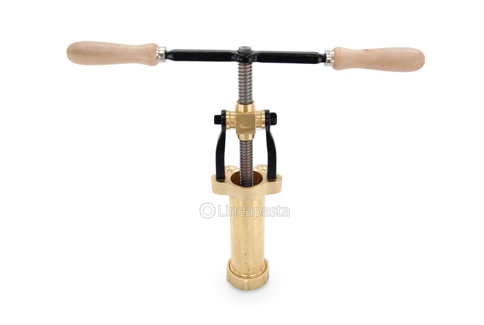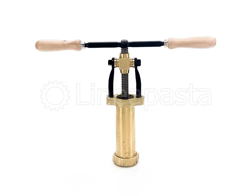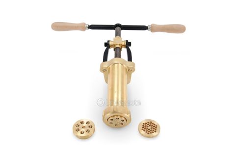 Fresh pasta press suitable for the manual production of different pasta shapes; it is made of brass and is an article of artisanal production. It is equipped with a practical system for blocking the die using a ring nut located in the lower part.