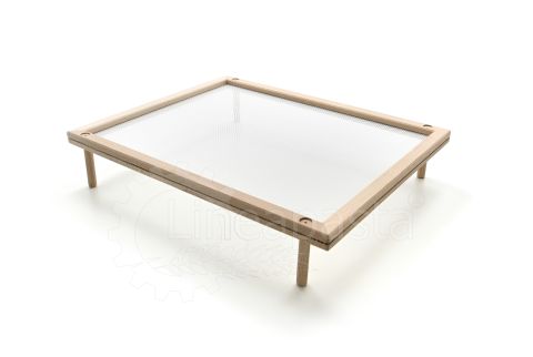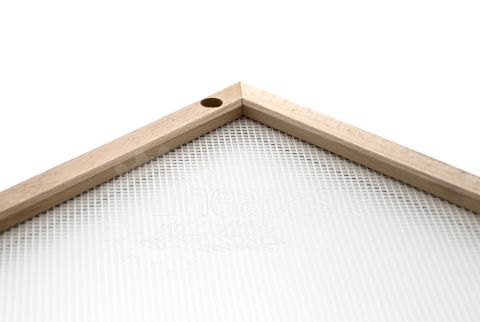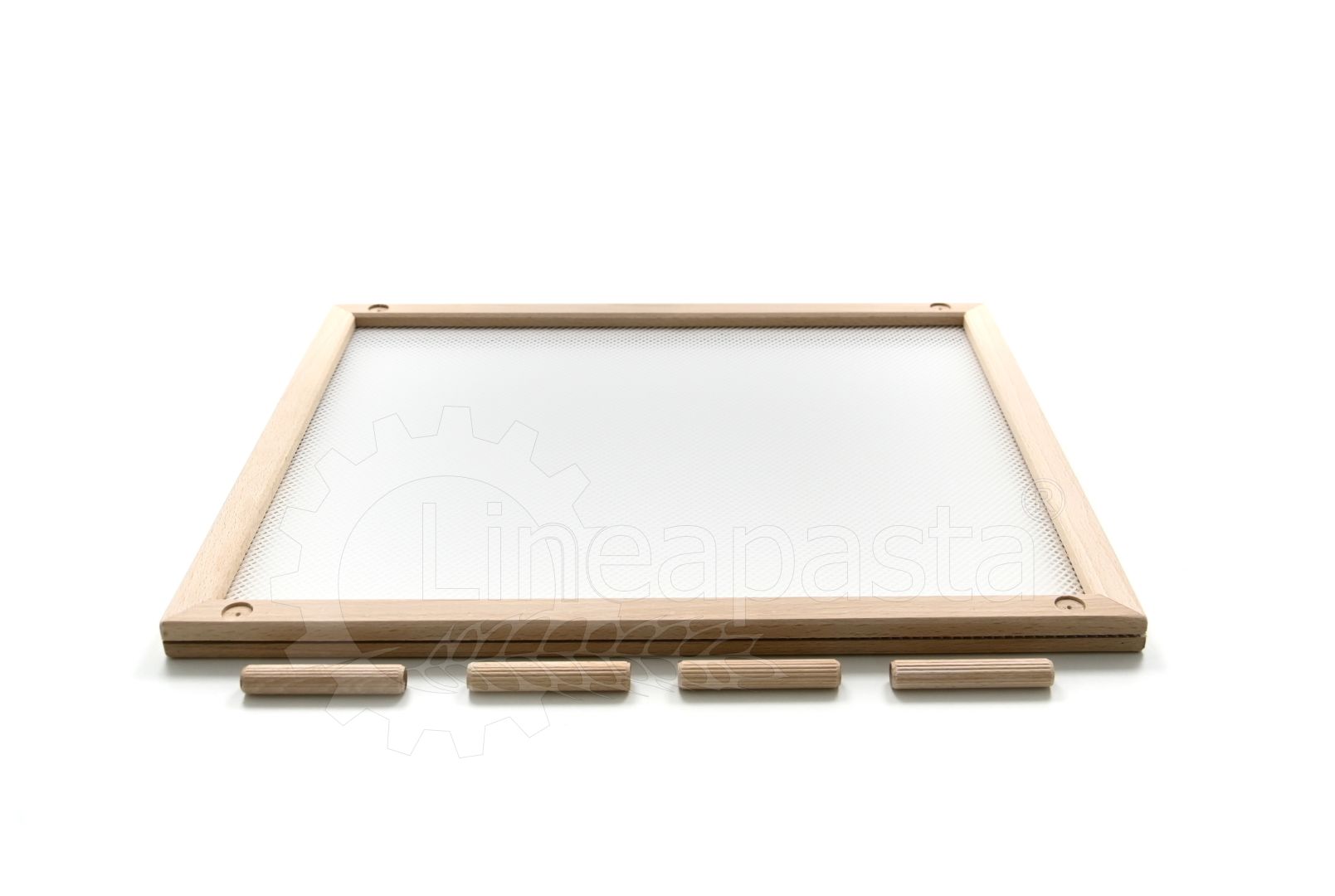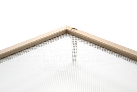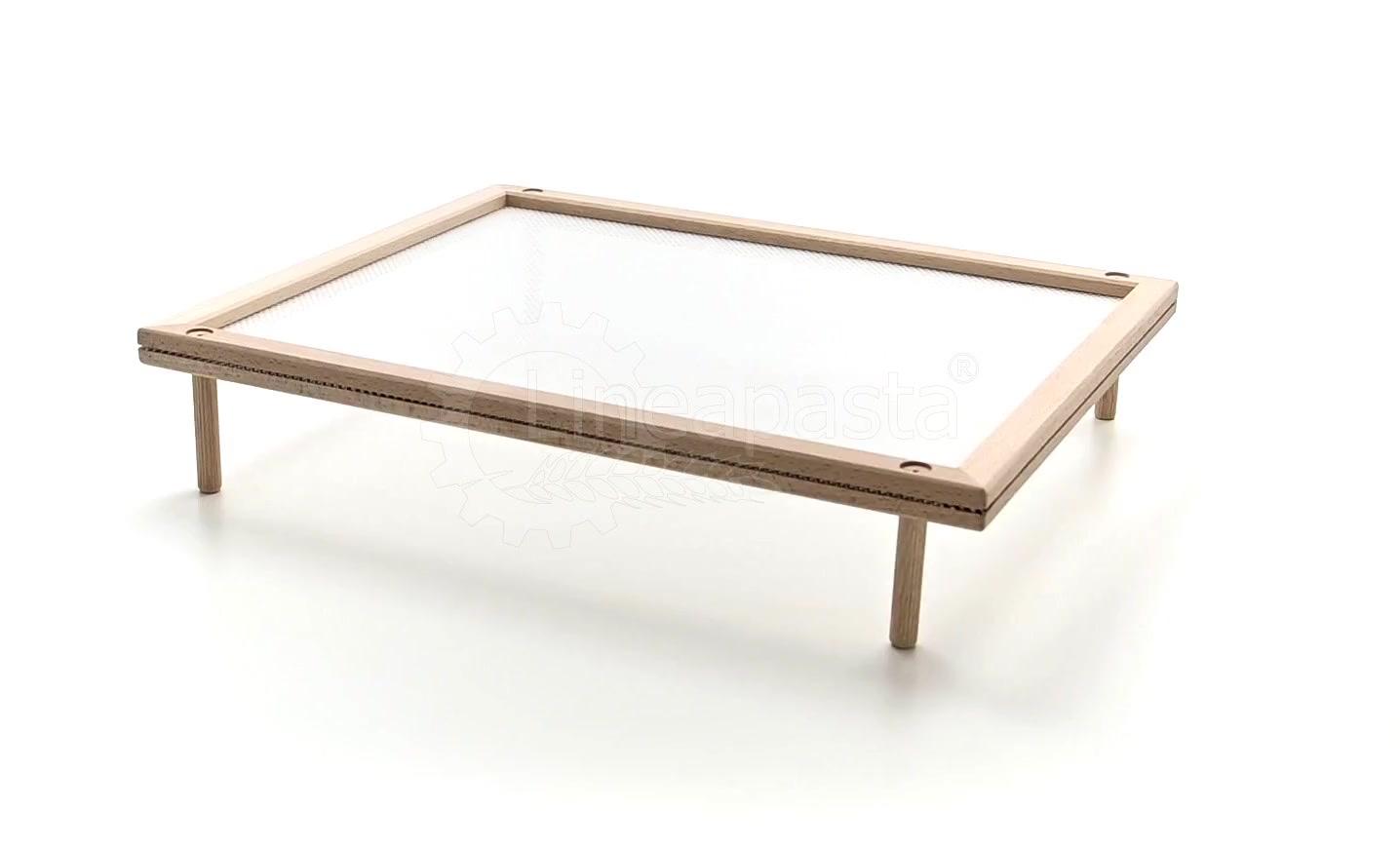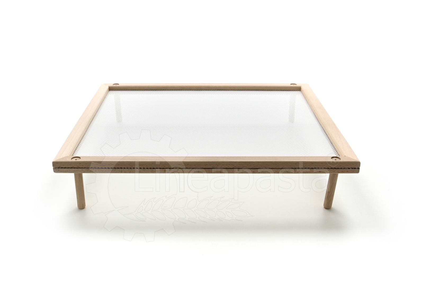 Pasta drying frame ideal for domestic use or for small pasta factories, laboratories, restaurants and catering. This pasta frame is made up of a natural beech frame and a wide-meshed food-grade plastic mesh, which allows correct ventilation during the drying phase of long and short cut pasta. This model in particular is equipped with removable wooden feet, which make it usable both as a tray and as a pasta drying frame.