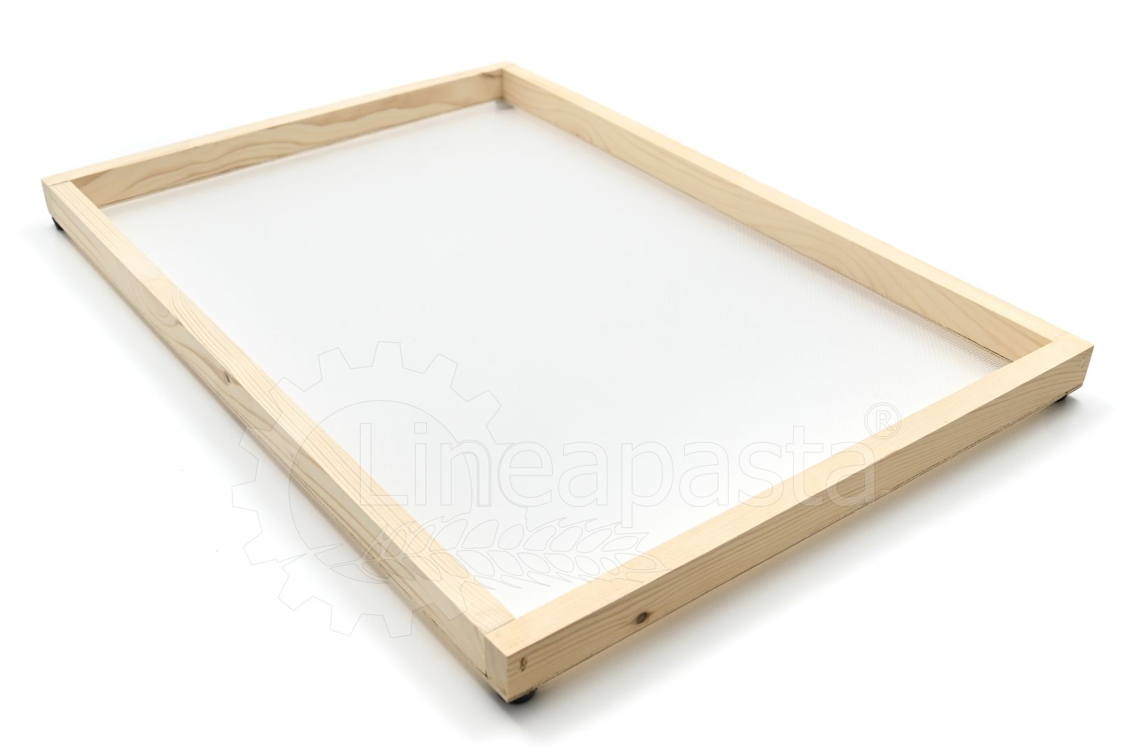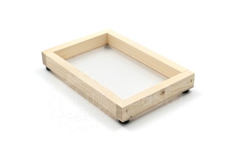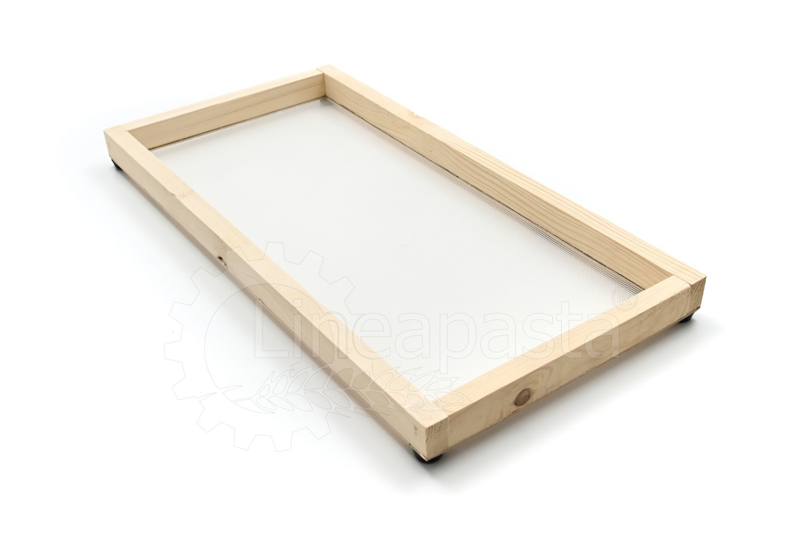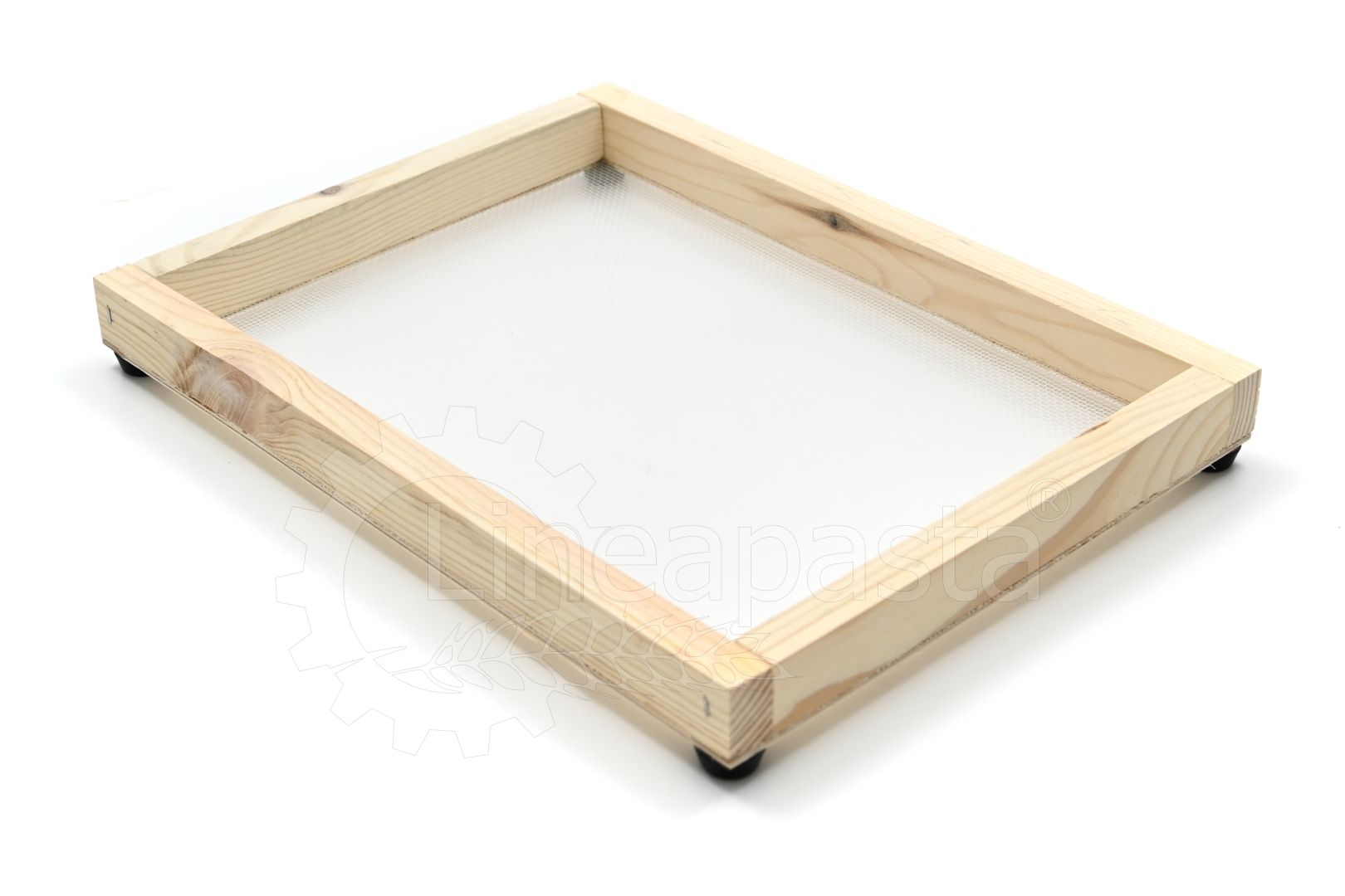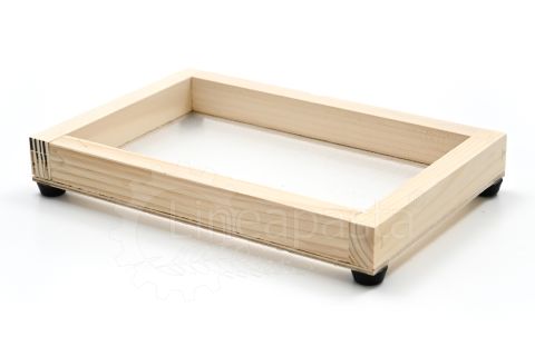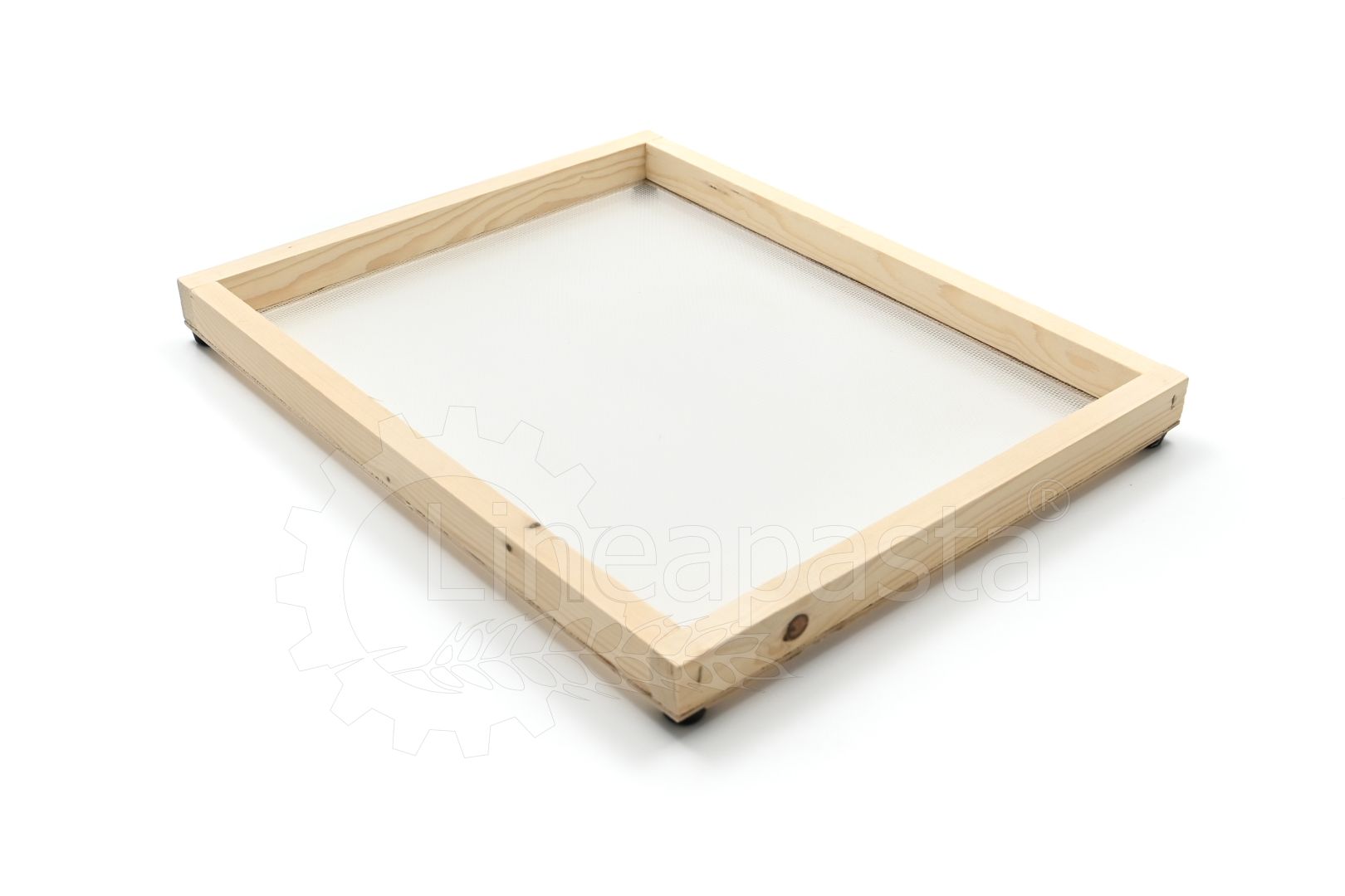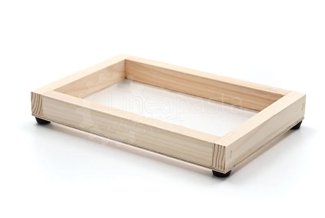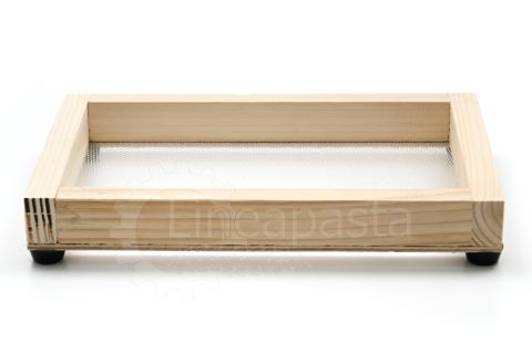 Wooden frames for domestic use or for small restaurants, workshops, caterings, gastronomies, pasta shops. They are suitable for drying short pasta or long nested pasta. These frames are composed of a wooden frame made of fir with rubber feet to overlap the frames and allow the correct passage of air for an homogeneous drying, while the net where the dough is lying is in polyester.