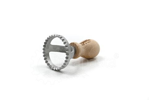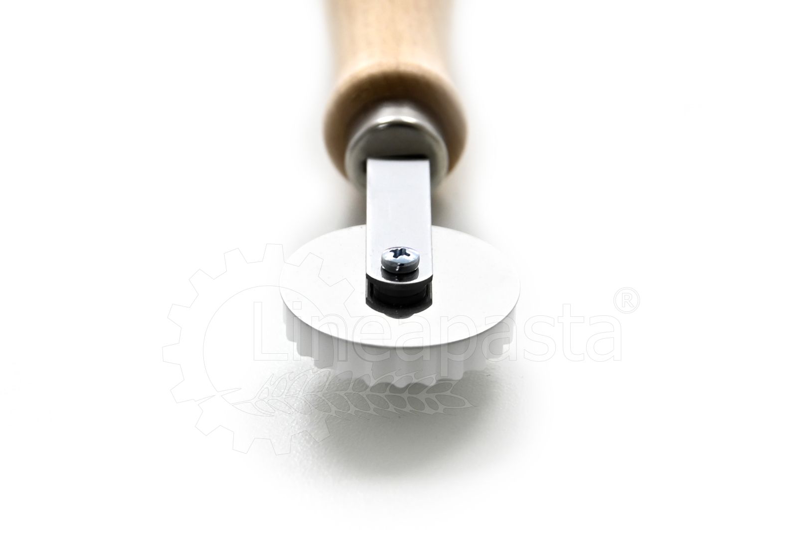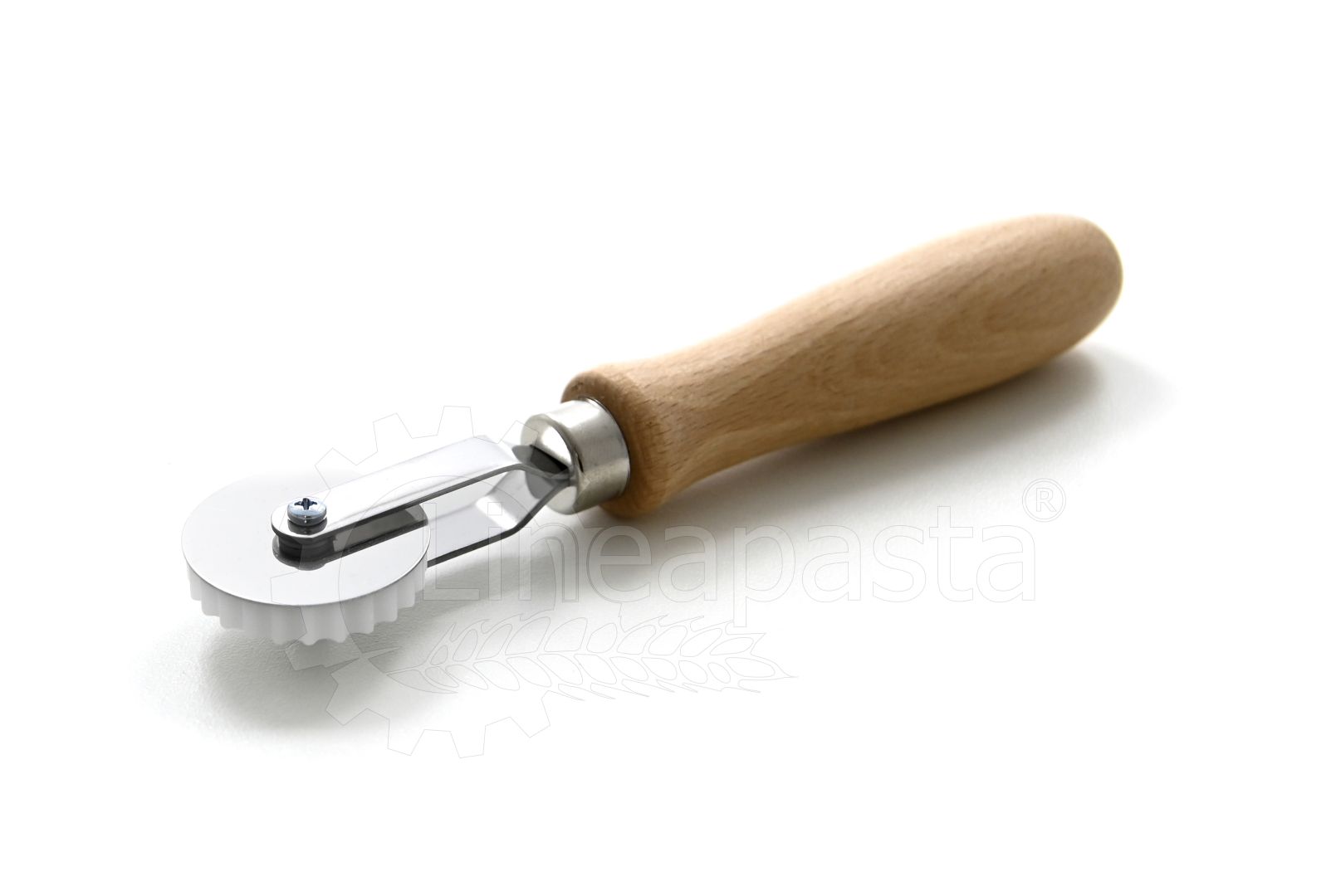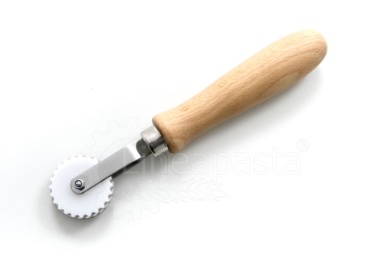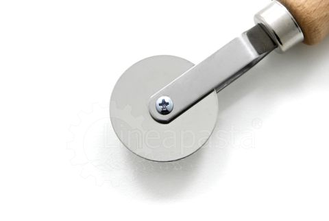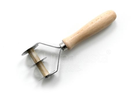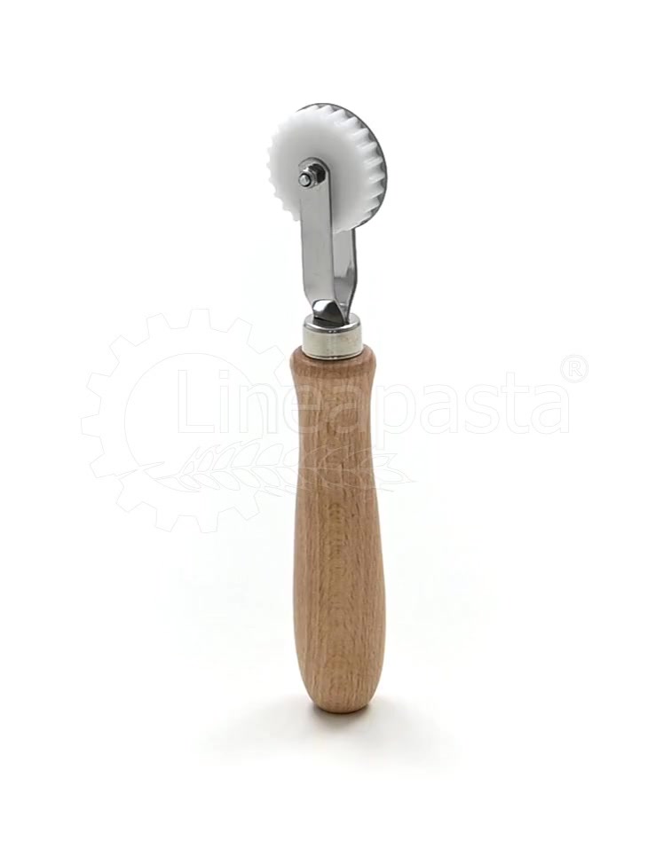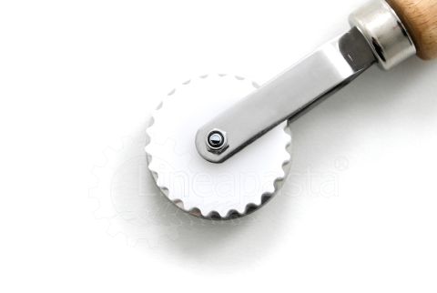 Pastry wheel suitable for preparing ravioli, both for domestic and professional use. The smooth stainless steel blade is flanked by a delrin dough sealing wheel, has a diameter of 38 mm and a total thickness of 7 mm. This utensil is perfect for sealing the filling and cutting fresh pasta in a single gesture. The pasta cutter is easy to handle and sturdy, and can be held thanks to a practical wooden handle.