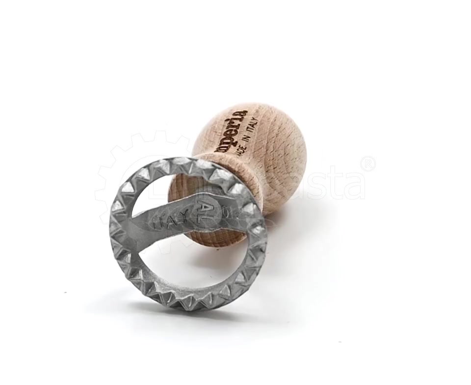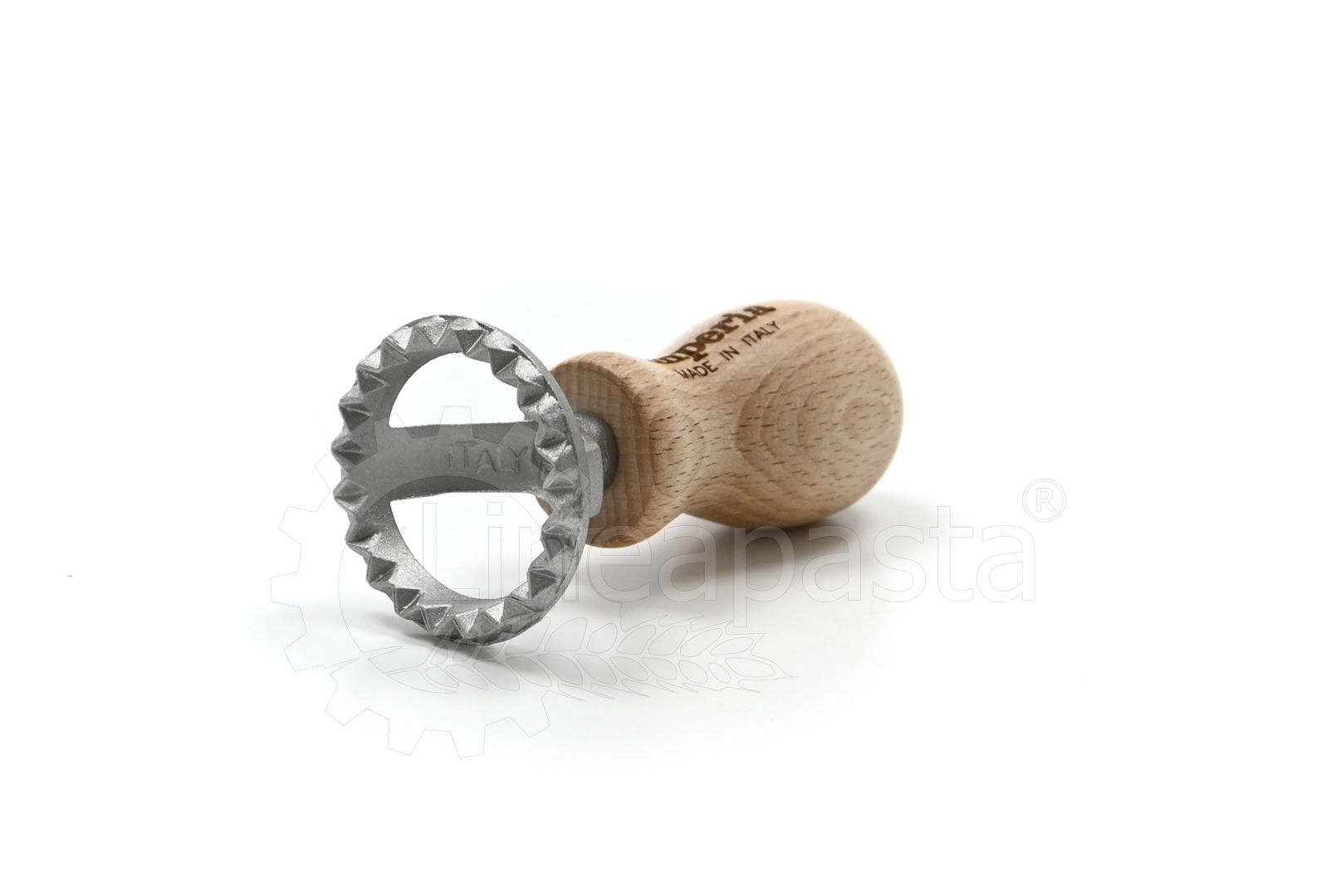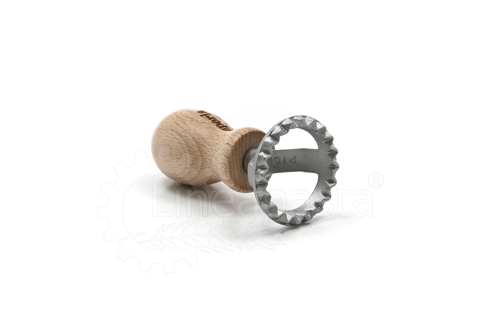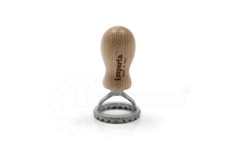 Imperia mould for round ravioli 48 mm in diameter. This ravioli mould is equipped with a practical wooden handle, it is made of aluminum and allows you to cut the dough sheet neatly and quickly during the making of ravioli.